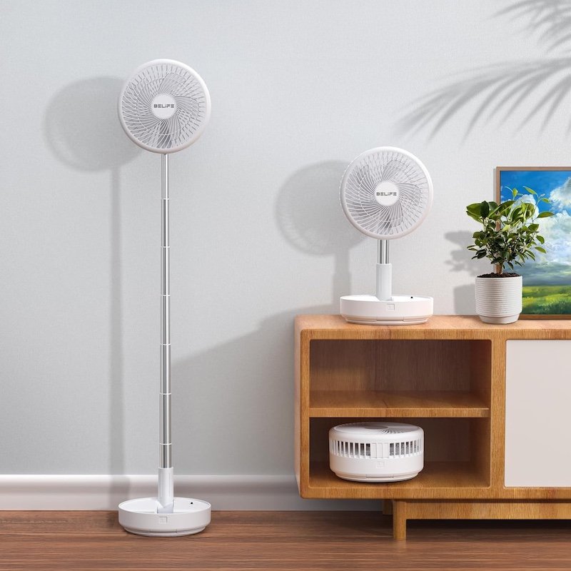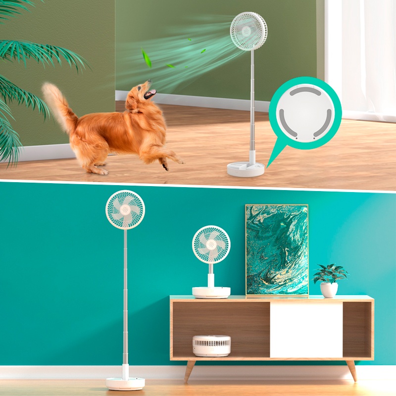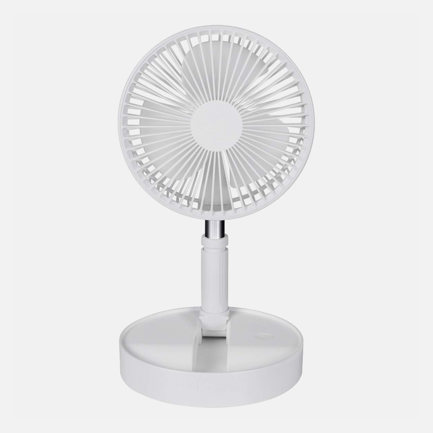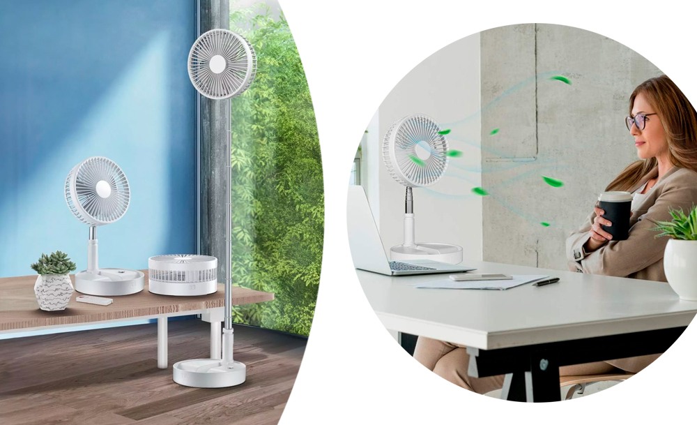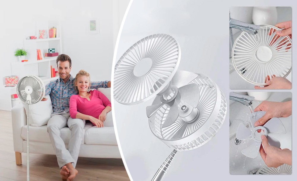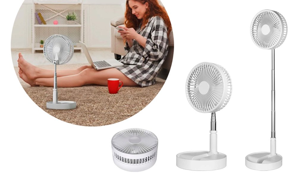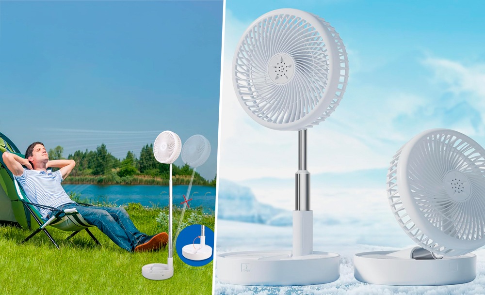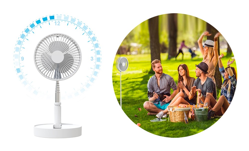 Особенностью этой модели портативного вентилятора является телескопическая конструкция, которая позволяет использовать его как в настольном так и напольном вариантах под разными углами. Мощная аккумуляторная батарея обеспечивает до 5 часов работы в зависмости от выбранного режима.
