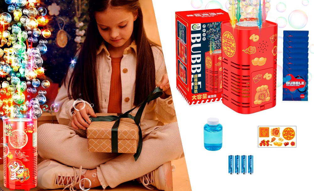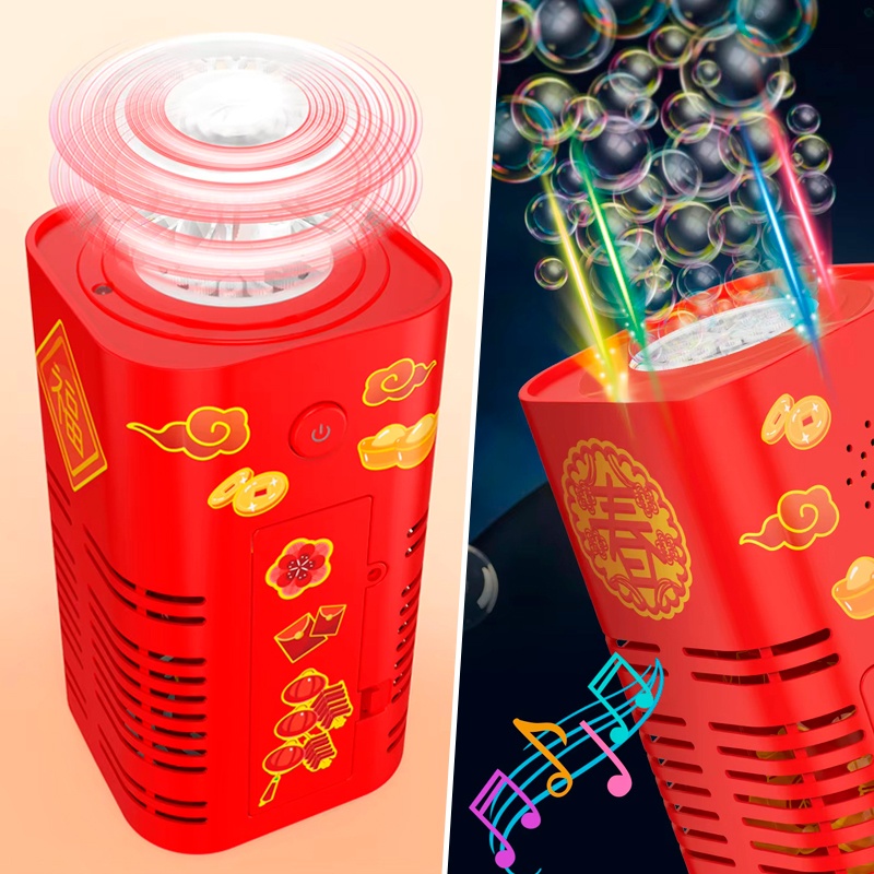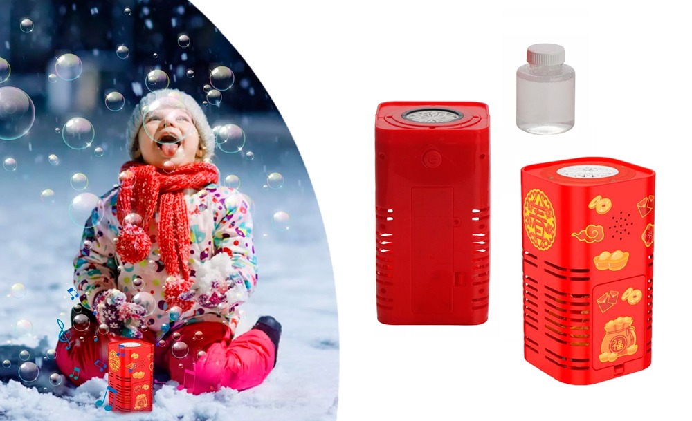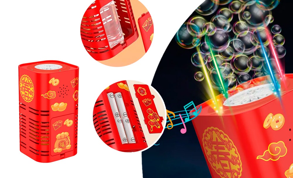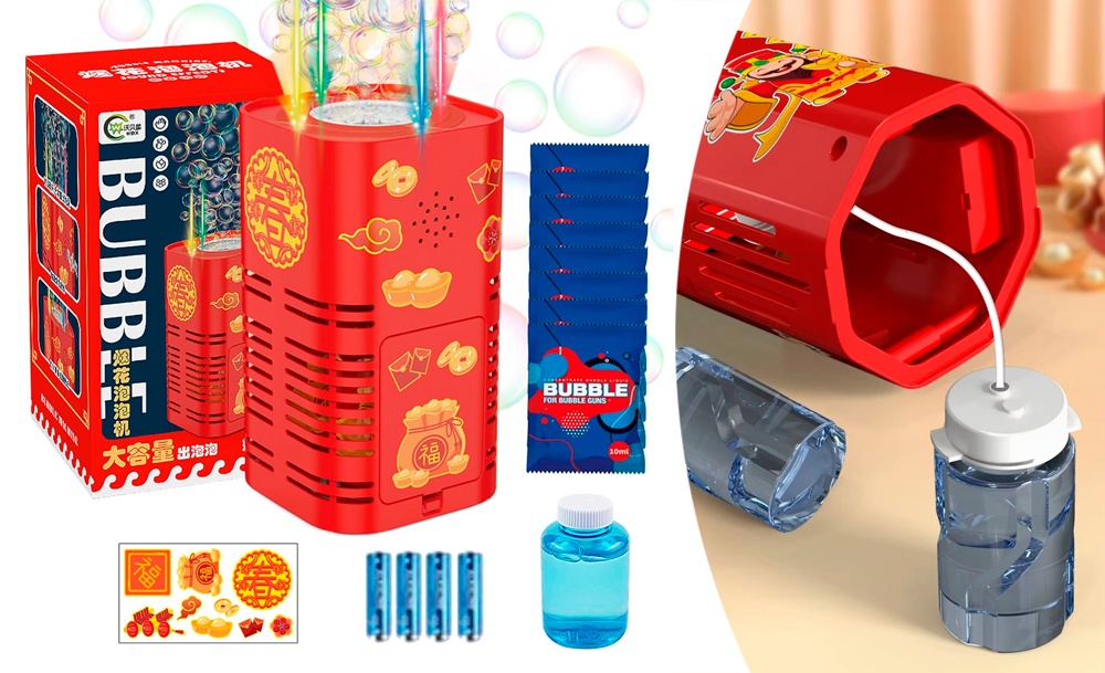 Данное устройство оснащено механизмом, который с помощью специального раствора и встроенного вентилятора создает густой поток мыльных пузырей. Верхняя часть конструкции имеет множество отверстий, из которых создаются пузырьки, а сбоку корпуса генератор мыльных пузырей фейерверк имеет специальный отсек для емкости с жидкостью.