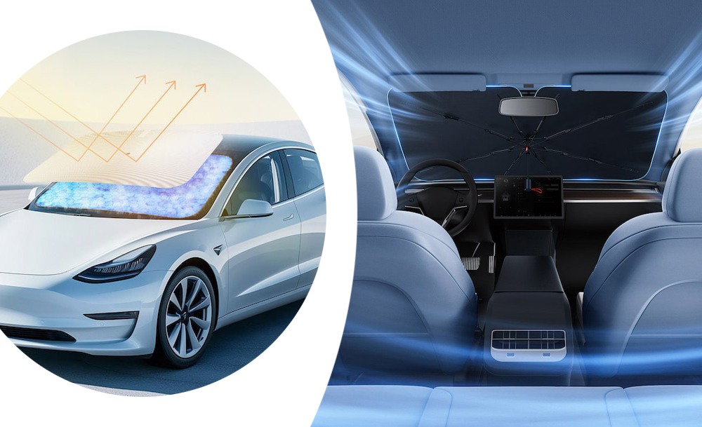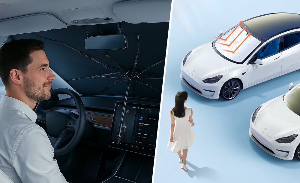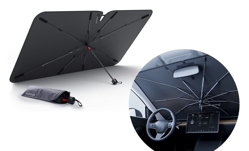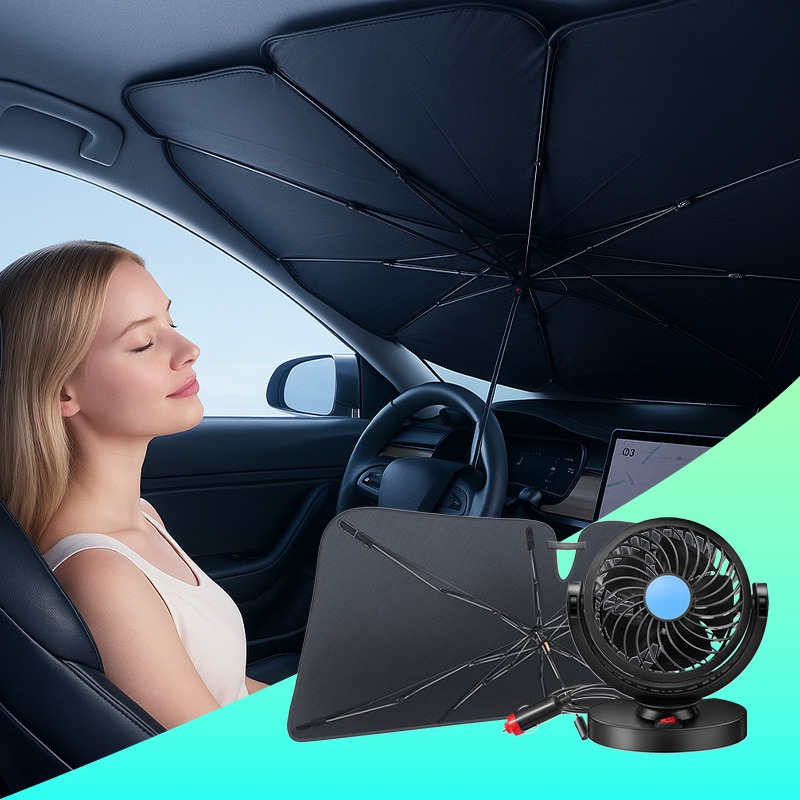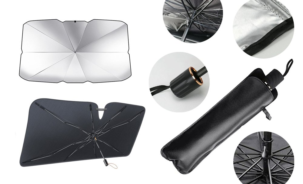 В комплекте — зонт-шторка на лобовое стекло, которая защищает от солнечных лучей и предотвращает перегрев салона. Простая установка — всего за несколько секунд. Это идеальное решение для комфортных поездок в тёплое время года!
