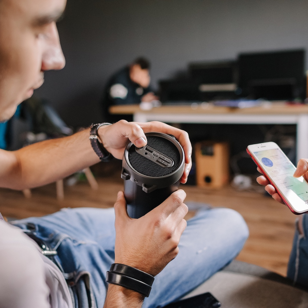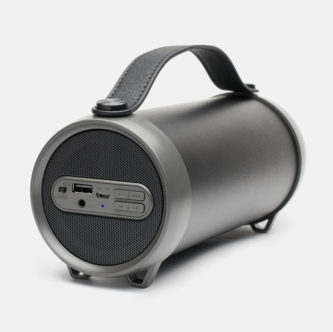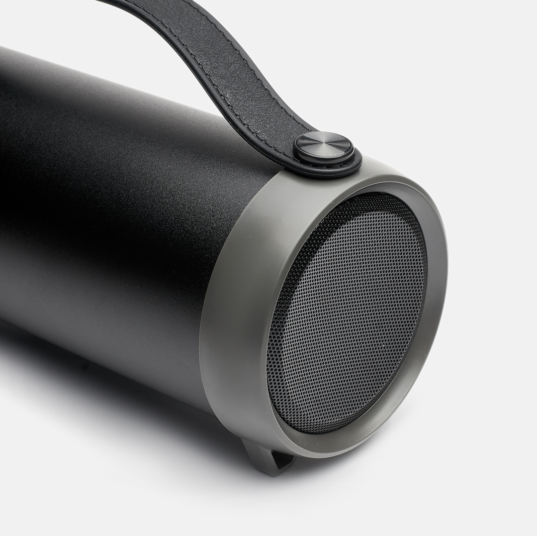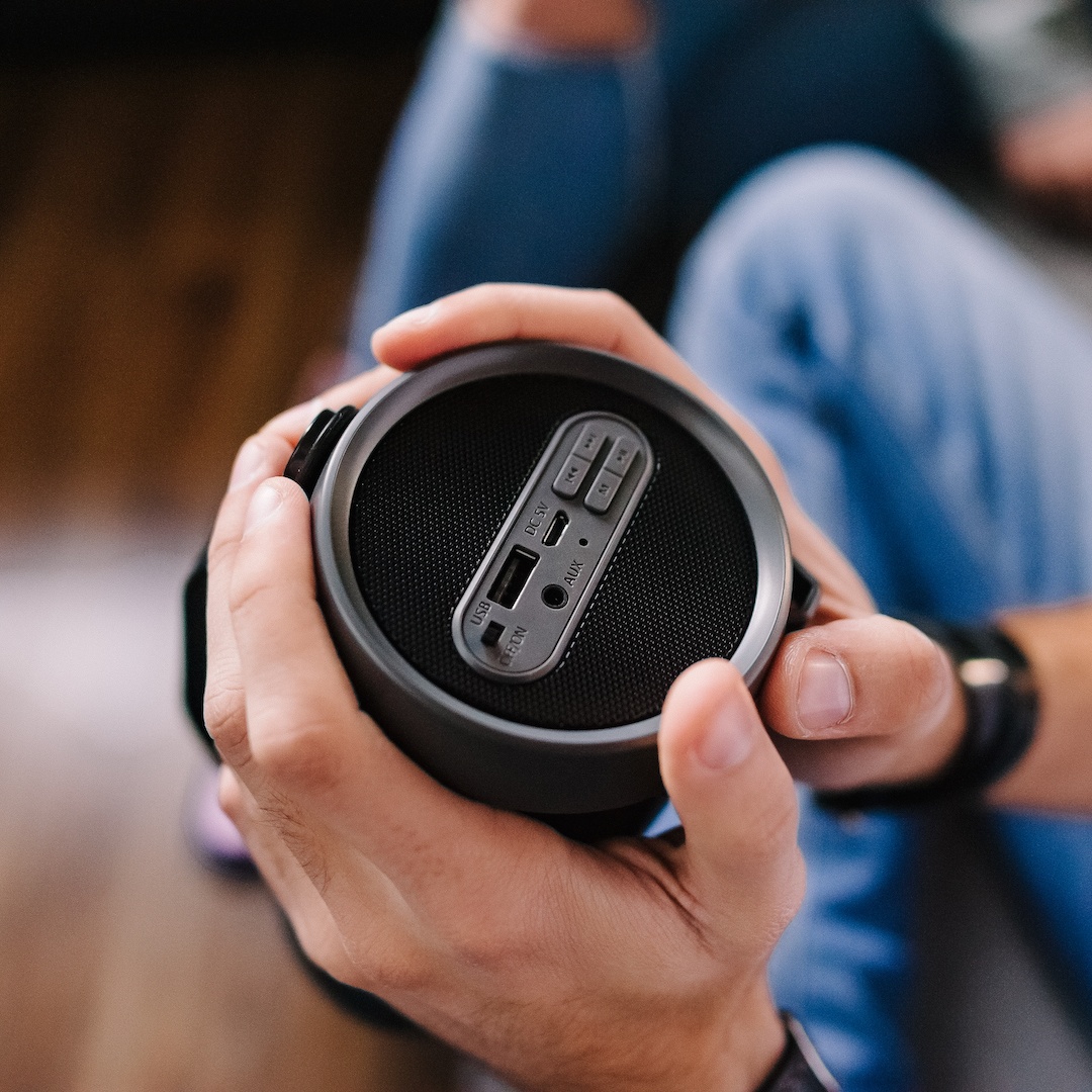 Теперь вы можете делиться понравившейся музыкой на всю компанию и забыть о скучных прогулках. Более того, чтобы получить звук посильнее, можно подключить дополнительные колонки. За счёт мягкой ручки-ремешка вы не сможете потерять устройство.