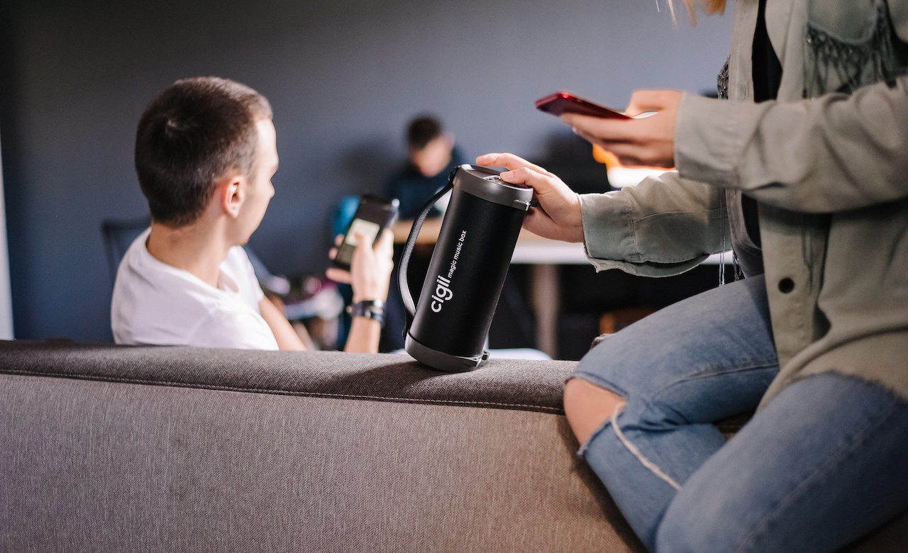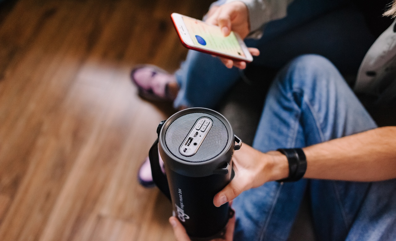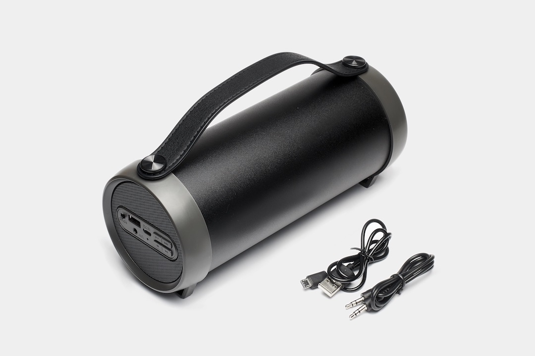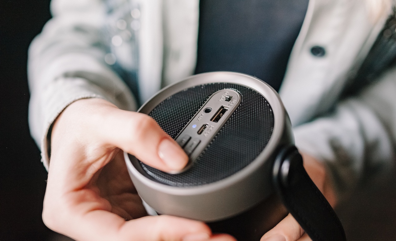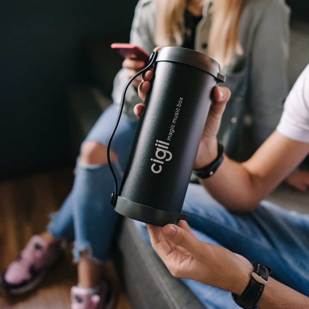 Теперь вы можете делиться понравившейся музыкой на всю компанию и забыть о скучных прогулках. Более того, чтобы получить звук посильнее, можно подключить дополнительные колонки. За счёт мягкой ручки-ремешка вы не сможете потерять устройство.