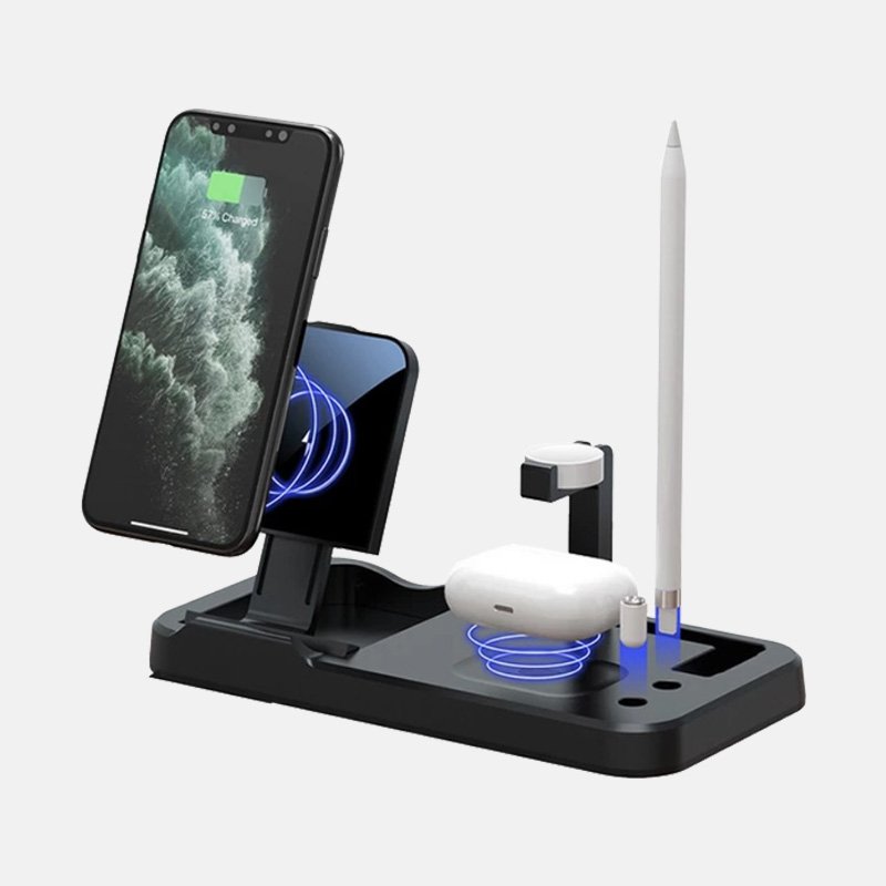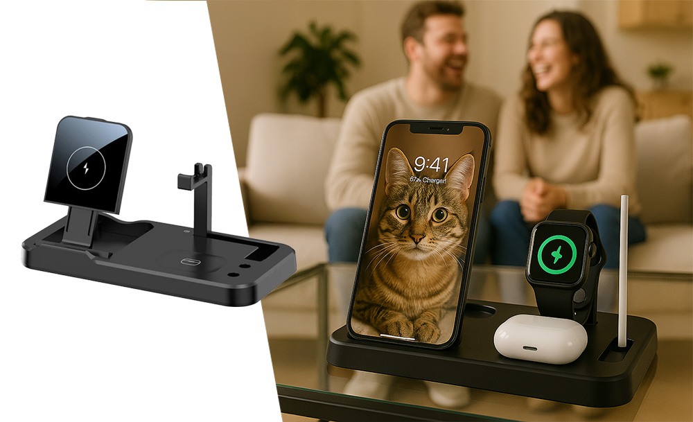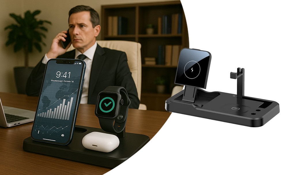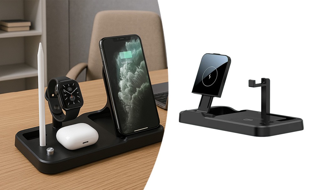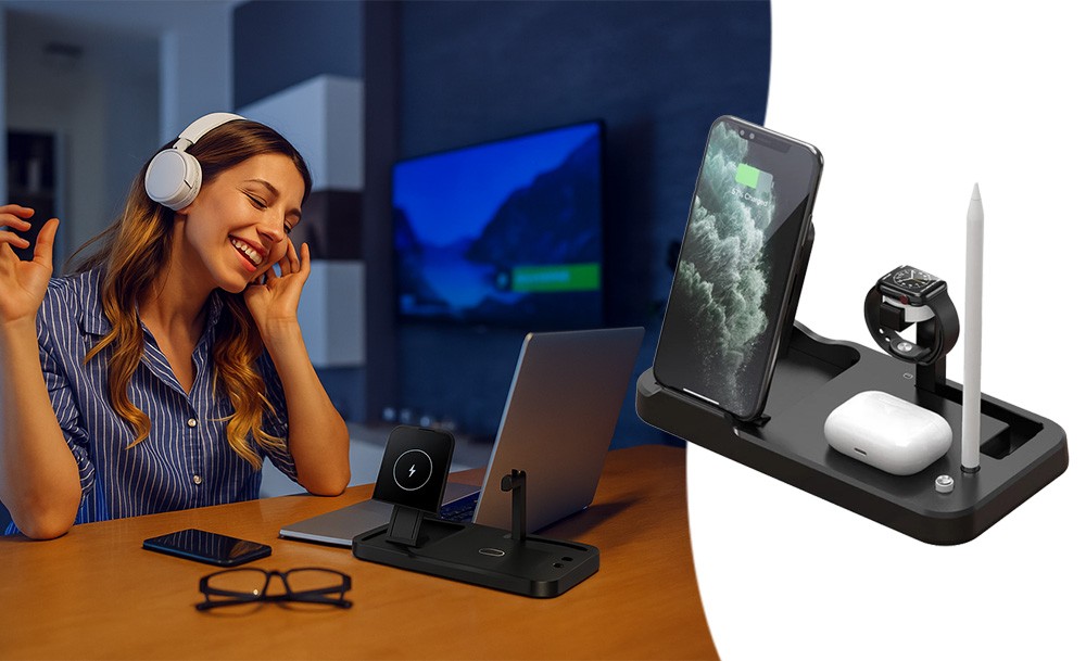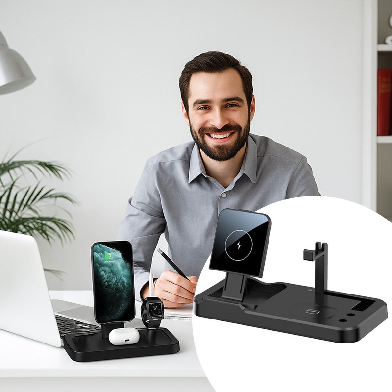 Встречайте беспроводную зарядную док-станцию 4 в 1 HS-299 – идеальное решение для современного ритма жизни. Она одновременно заряжает смартфон, часы, наушники и даже имеет отдельное место для стилуса. Забудьте про путаницу с кабелями – все компактно, удобно и всегда под рукой.