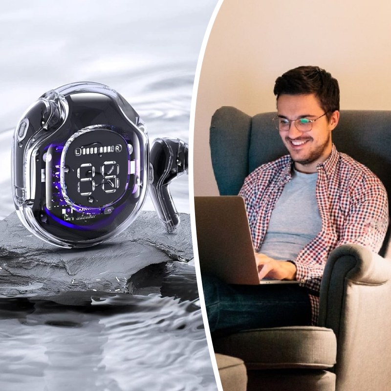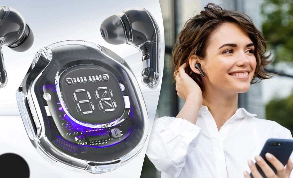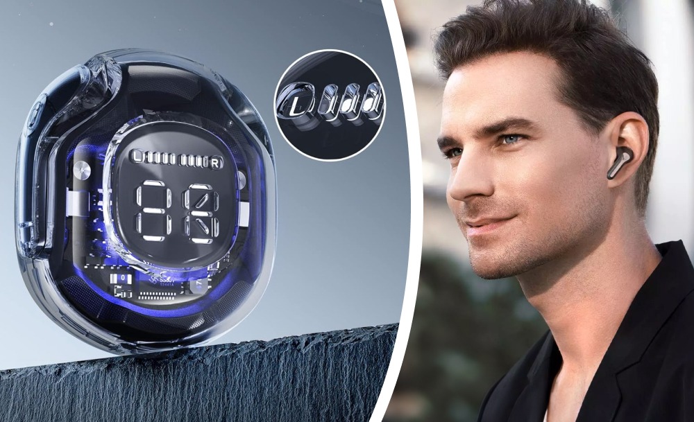 Они обладают объемным чистым звуком, а технология активного шумопоглощения и встроенный чувствительный микрофон позволяют слушать музыку или разговаривать по телефону в любом шумном месте. Зарядный кейс для них выполнен в виде стильного прозрачного футляра без крышечки. Наушники фиксируются в зоне зарядки с обеих сторон с помощью прочного магнита.