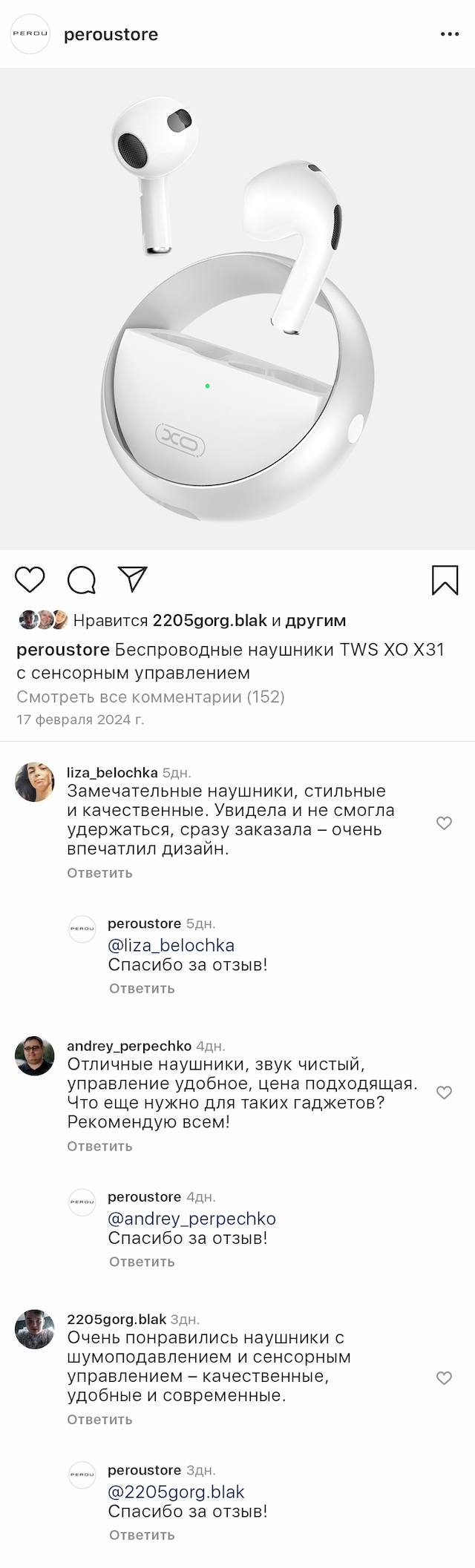 Беспроводные наушники TWS XO X31 с сенсорным управлением – это революционный продукт в мире гаджетов: два отдельных аудиоустройства синхронизируются между собой и работают как стерео система. Технология шумоподавления обеспечивает качественный мощный звук без помех и искажений, что дает возможность прослушивать любимую музыку или разговаривать по телефону даже в шумных местах.
