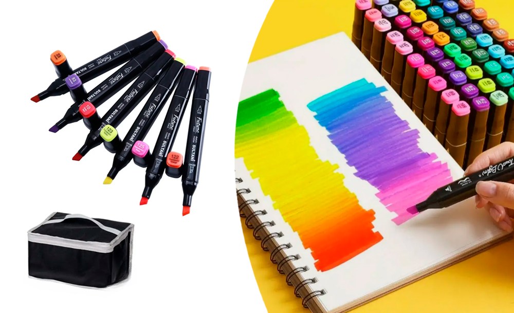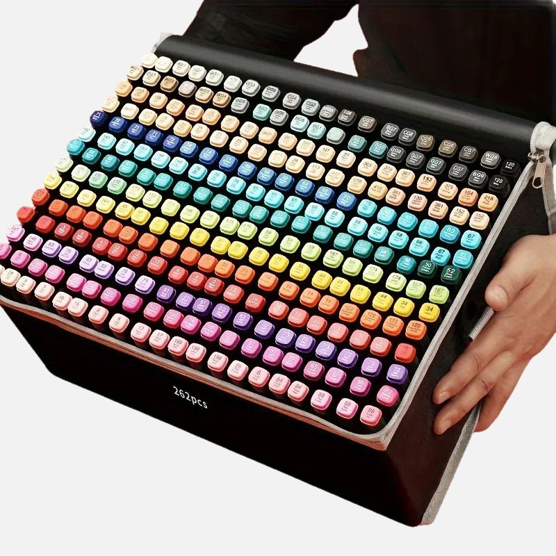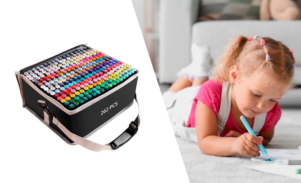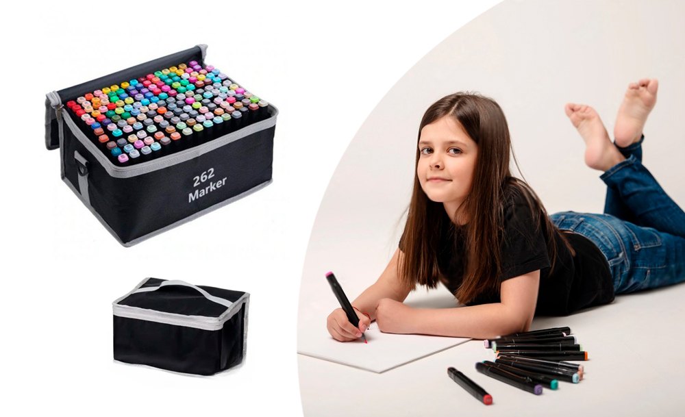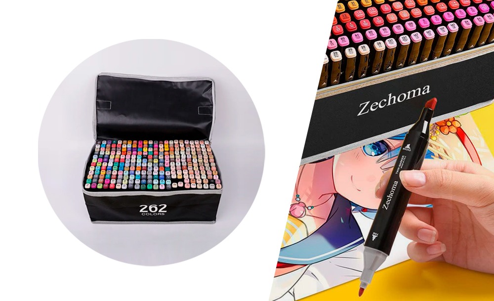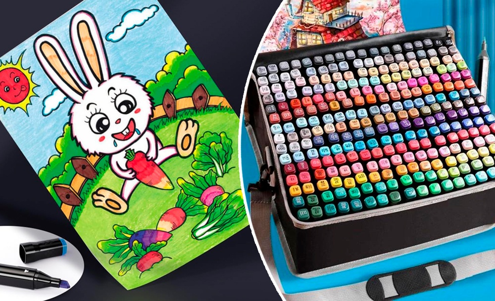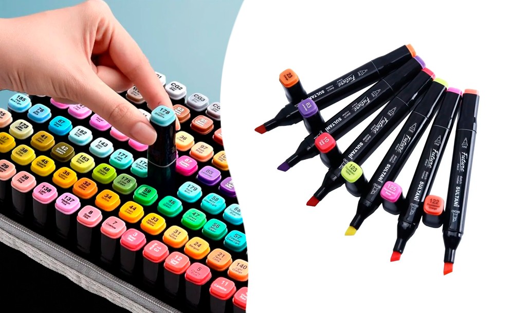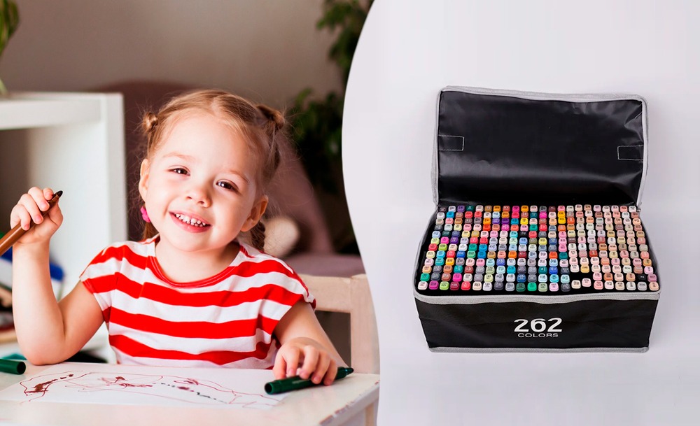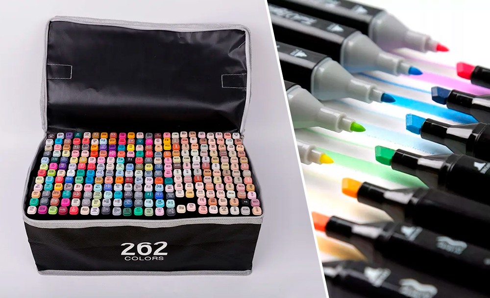 Маркеры имеют два пера – тонкое и широкое. Заправлены без кислотными нетоксичными чернилами. Отлично сочетаются, создают плавные градиенты. Вся палитра цветов этих маркеров состоит из 262 цветов.