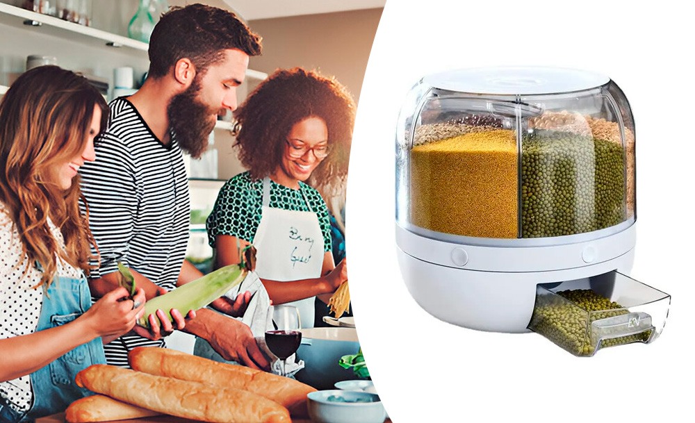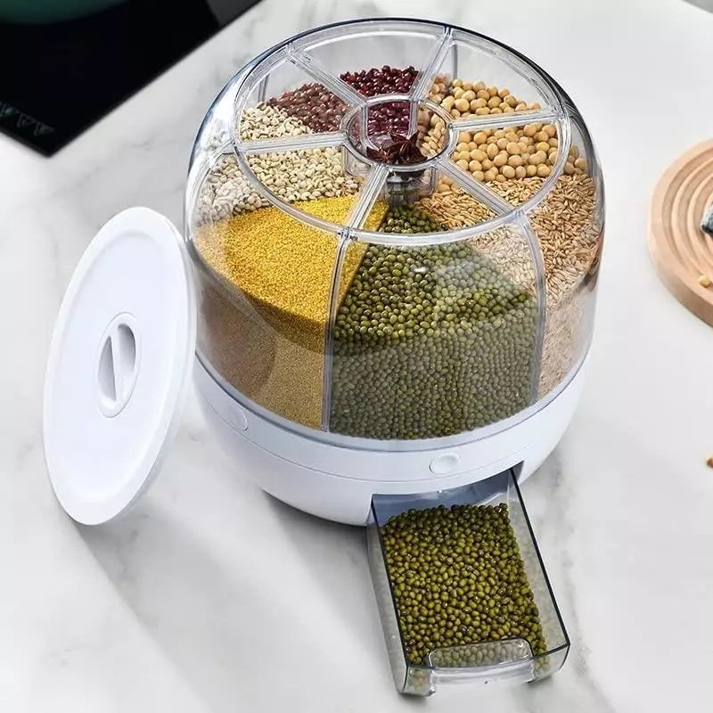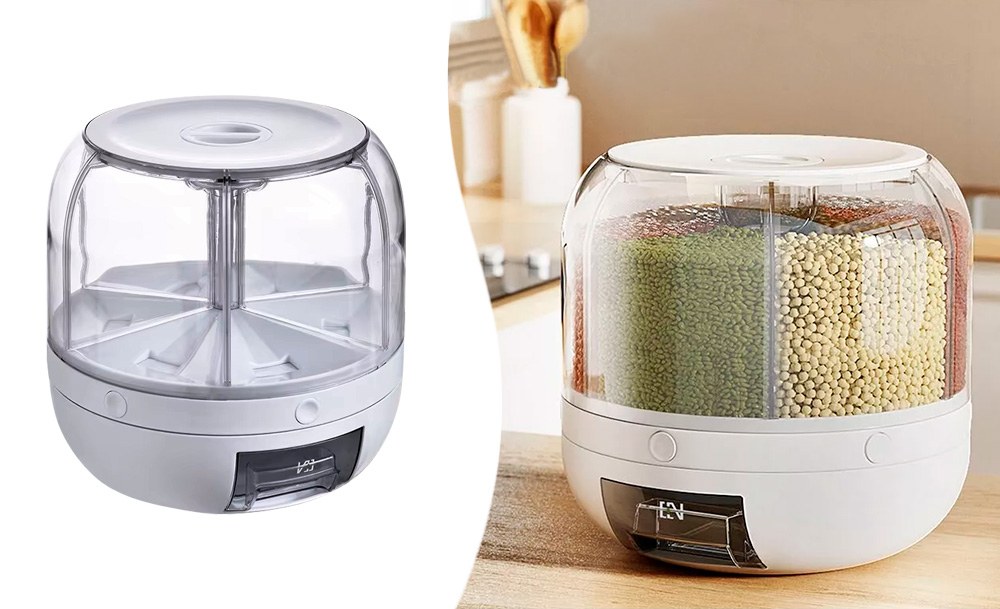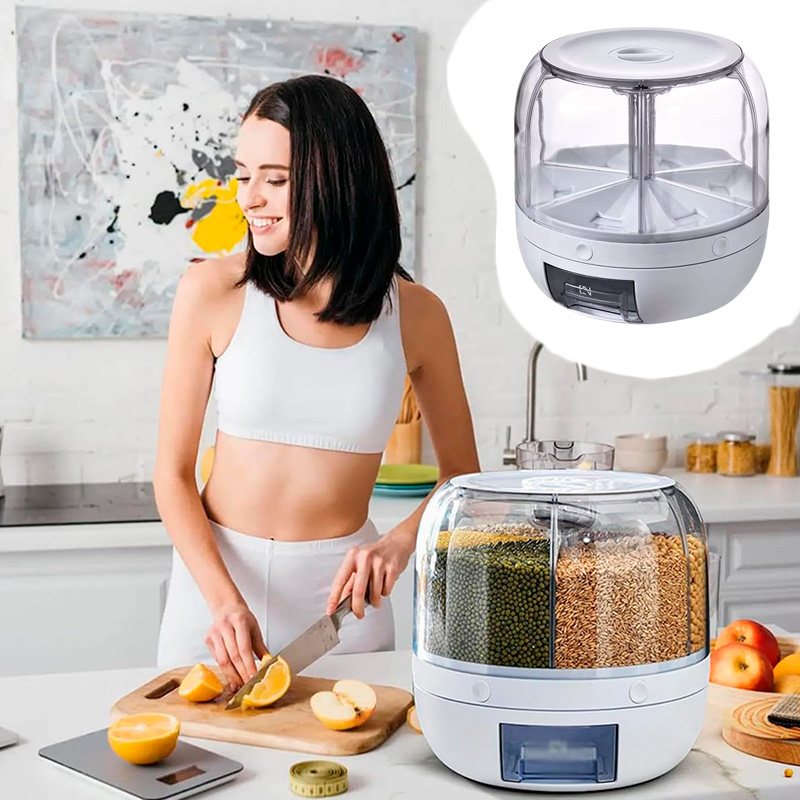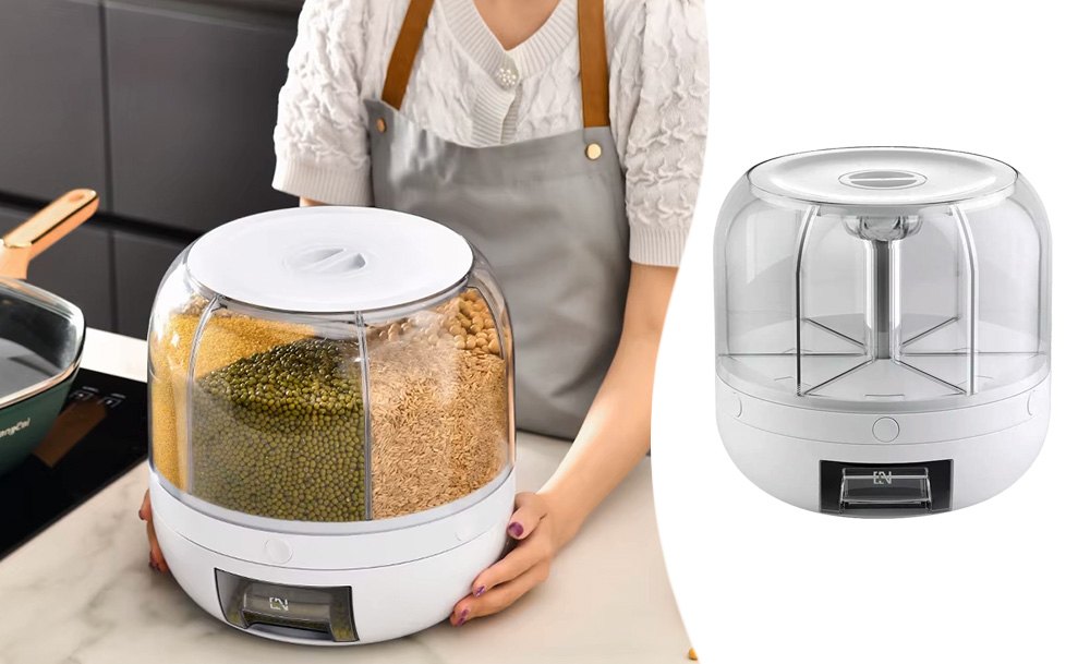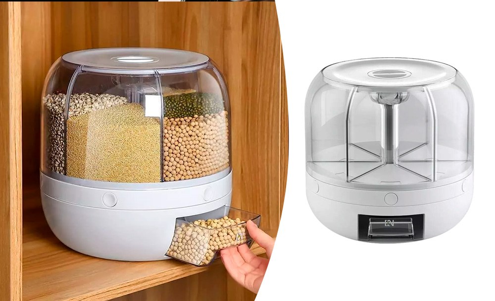 Каждая секция позволяет хранить различные продукты отдельно, что упрощает их использование и помогает содержать кухню в порядке. Благодаря вращающемуся механизму, диспенсер легко поворачивается, что обеспечивает быстрый доступ к нужным продуктам во время приготовления пищи.