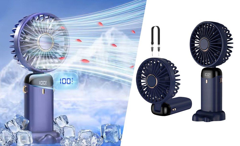 Мини вентилятор с подставкой для телефона и дисплеем – это персональный настольный USB-вентилятор. В его комплект входит ремень, с помощью которого устройство можно повесить на шею, оставляя руки свободными.