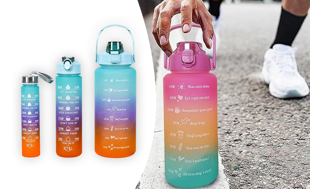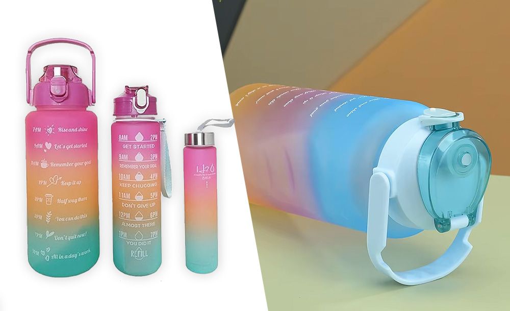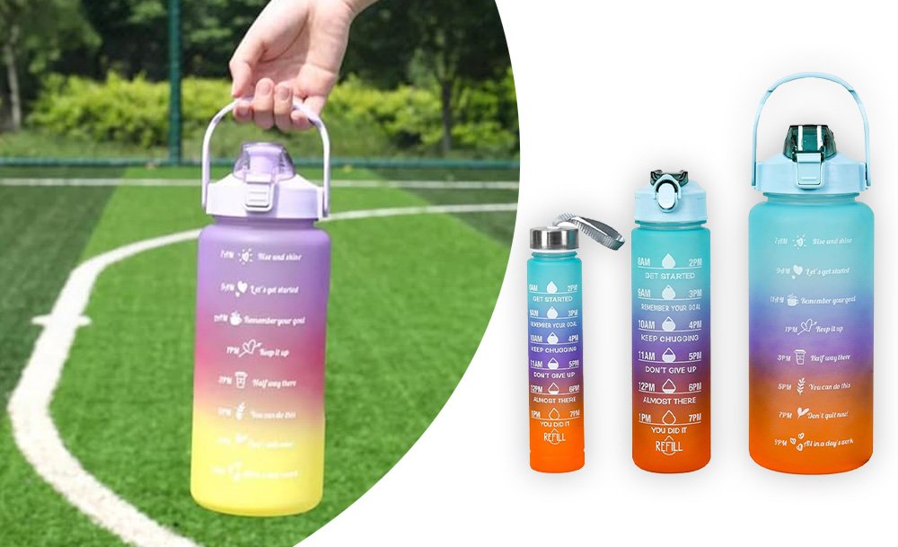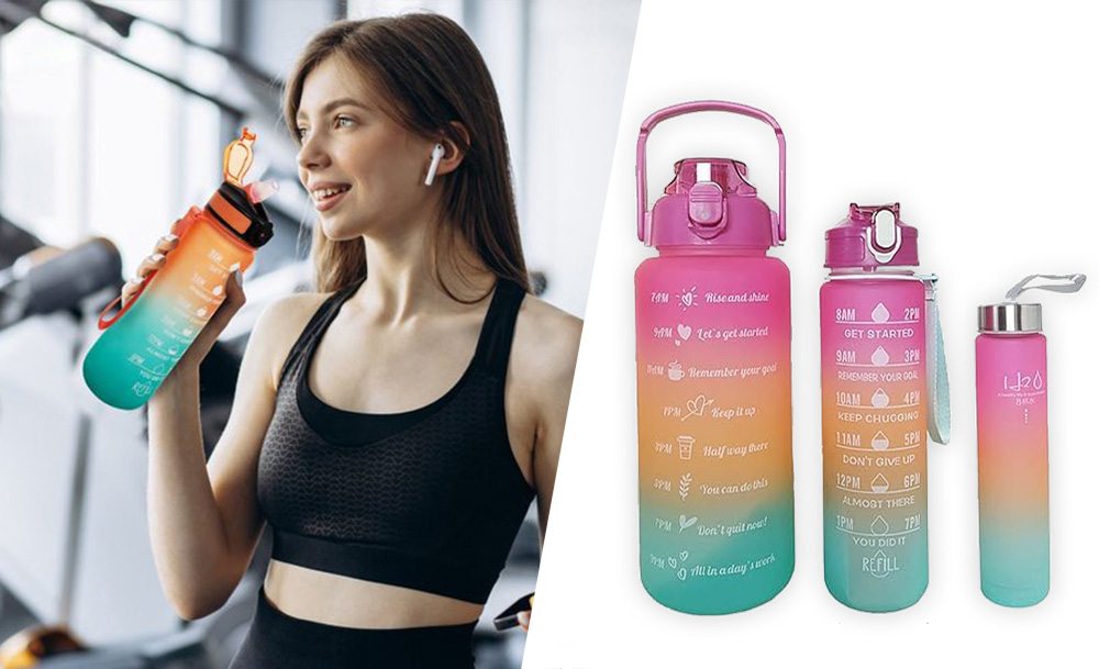 Набор спортивных бутылок 3 в 1 – это особые бутылки с маркерами часов и мотивирующими фразами! На бутылках есть шкала-маркеры, показывающие, сколько воды нужно выпить и до какого часа. Такие бутылки – настоящие помощники для всех, кто желает поддерживать правильный баланс воды в организме!