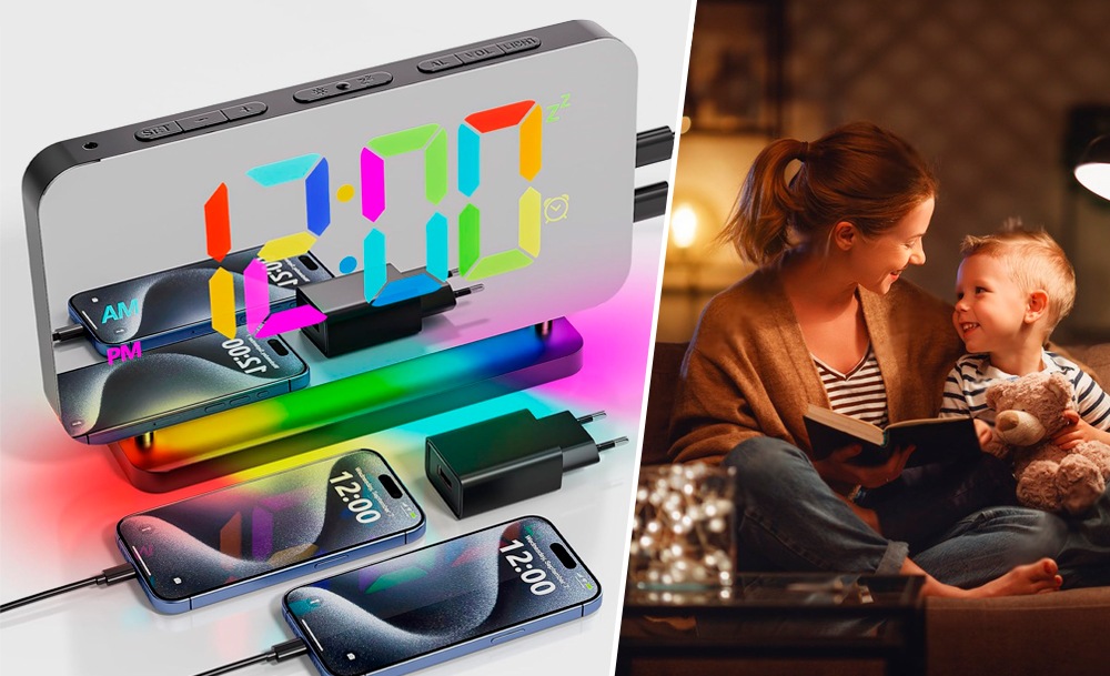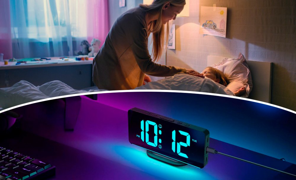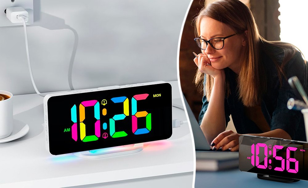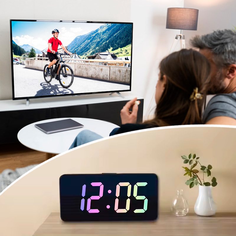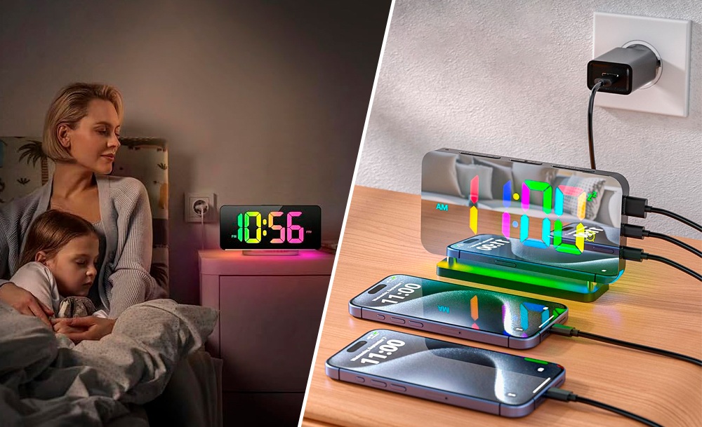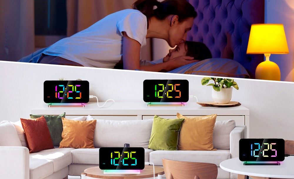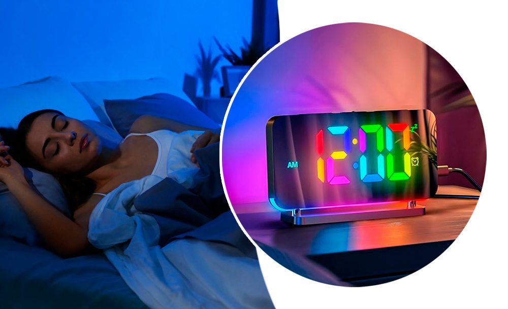 Их современный зеркальный дисплей с RGB подсветкой добавляет элегантности и создает неповторимую атмосферу в любом помещении. Подсветка автоматически уменьшается с 20:00 до 7:00, что удобно для сна.