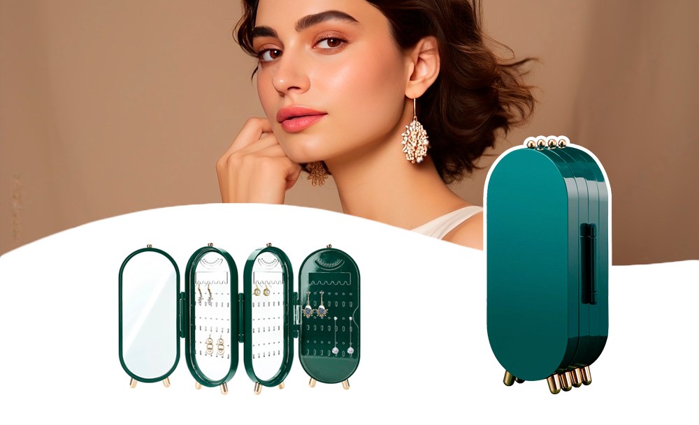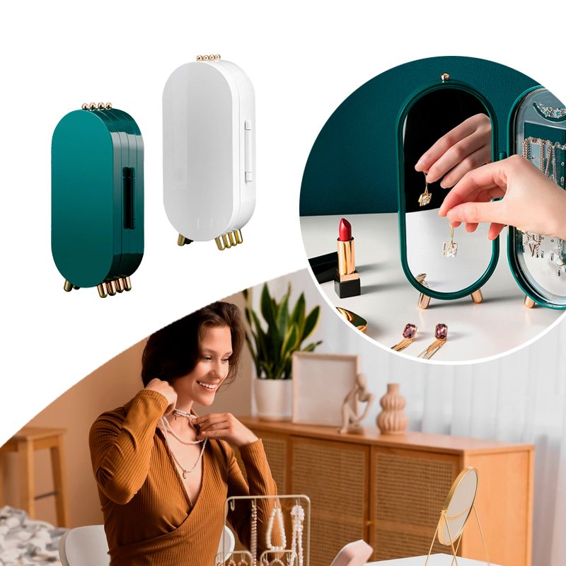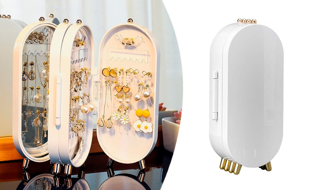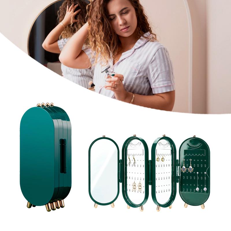 Футляр-органайзер Jewelry Storage Box для хранения ювелирных украшений, складная ювелирная шкатулка с зеркалом. Благодаря различным отделениям, вы сможете разместить серьги, браслеты, колье и другие украшения, не беспокоясь о их путанице.