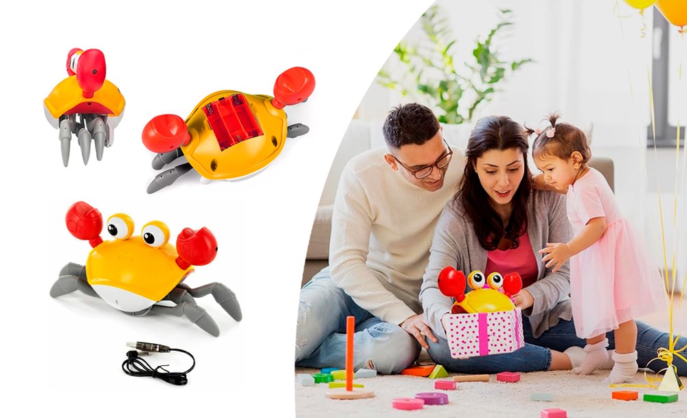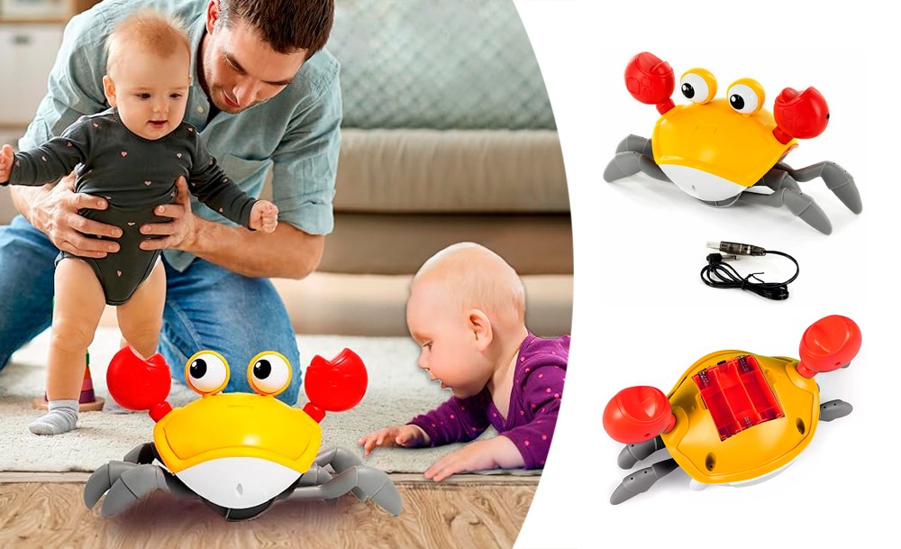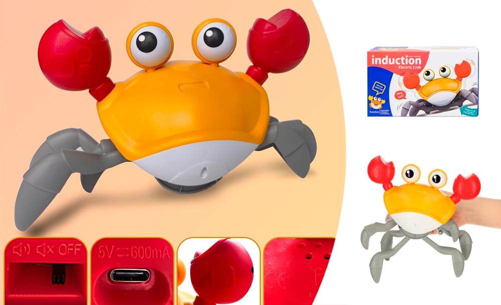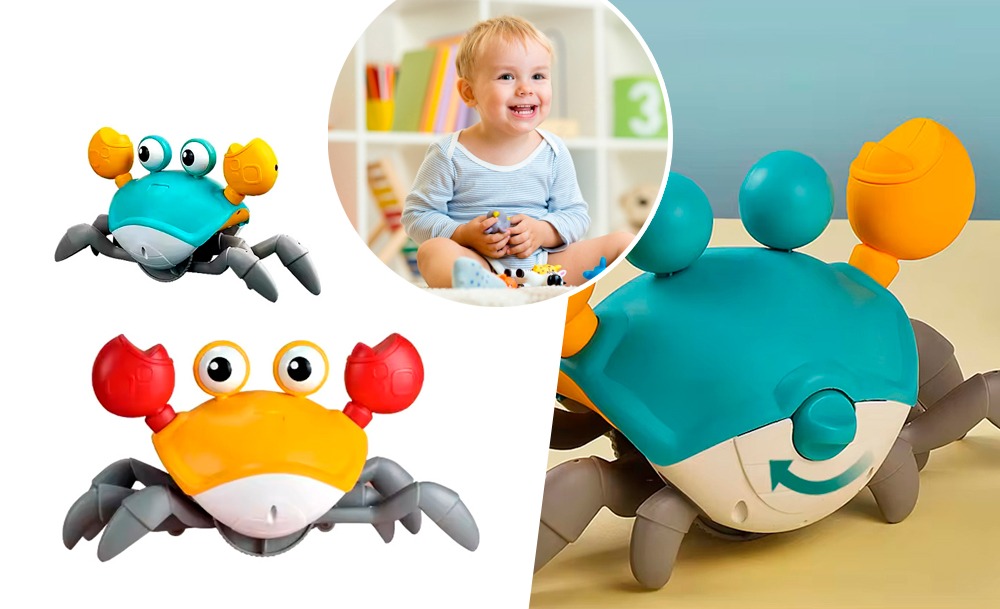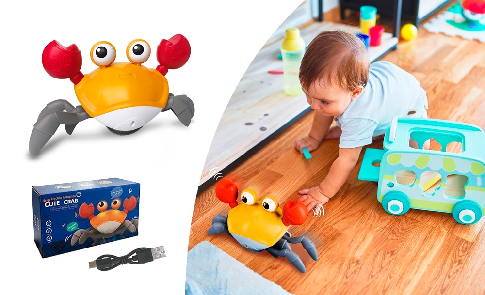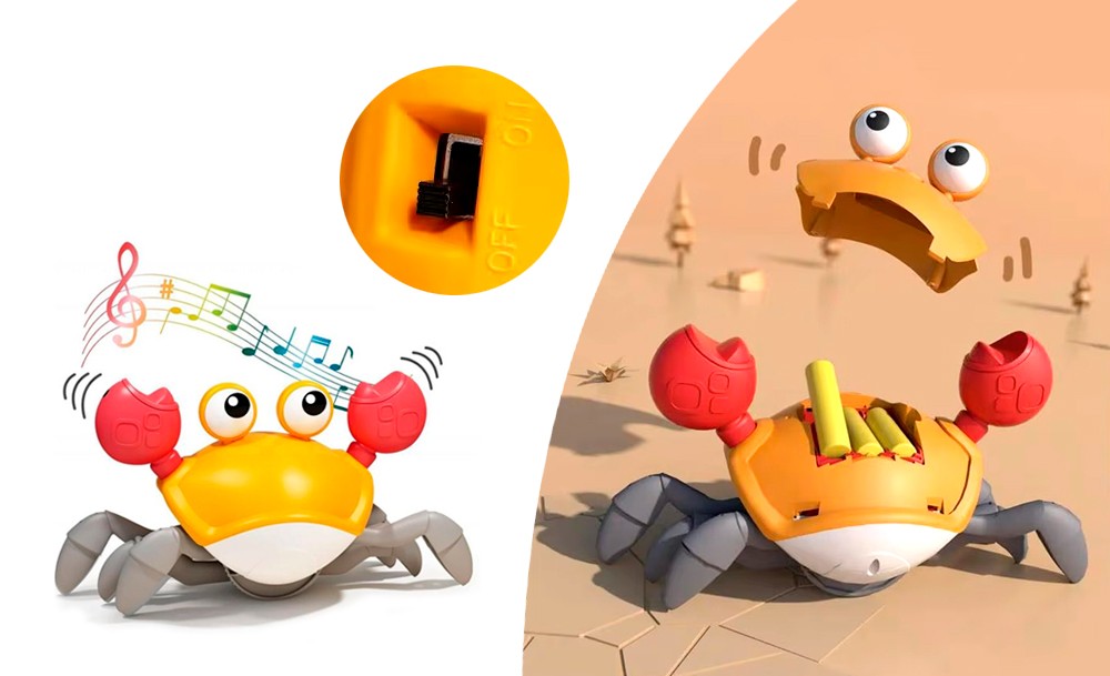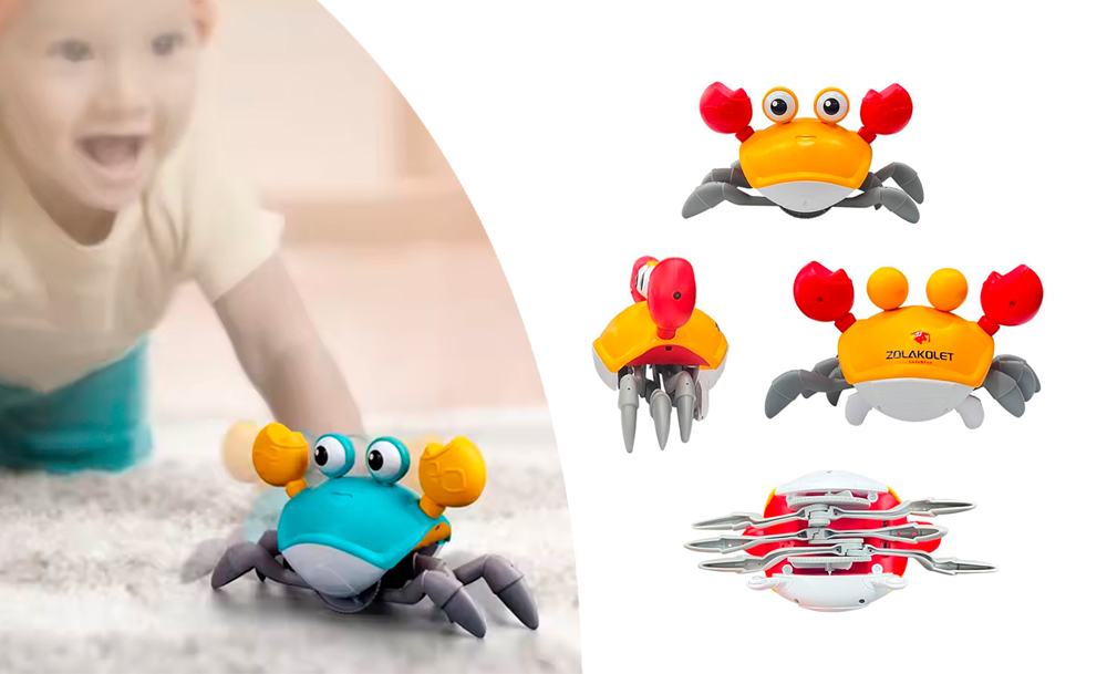 Она передвигается, имитируя движения настоящего краба, и обходит препятствия благодаря встроенным датчикам. Во время движения игрушка исполняет веселые песни, а глаза краба светятся. Маленькому ребенку будет интересно не только наблюдать за игрушкой, но и пытаться её поймать.