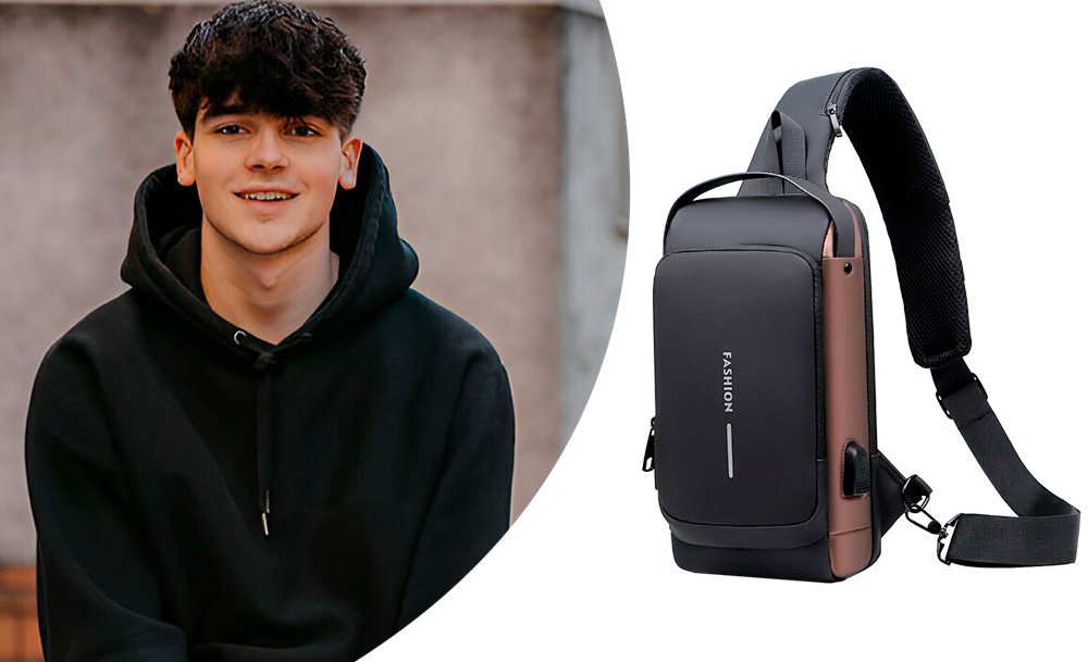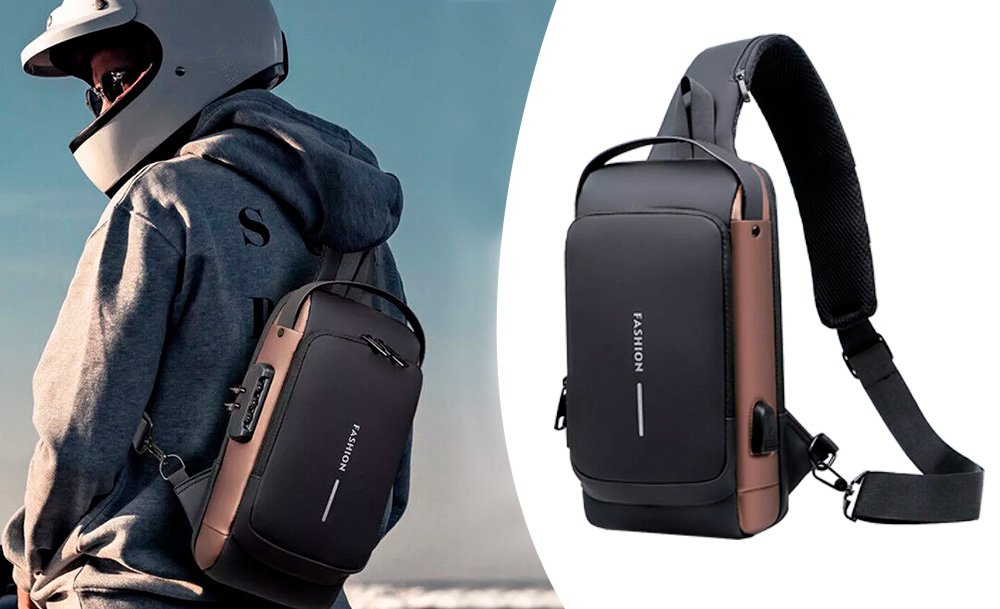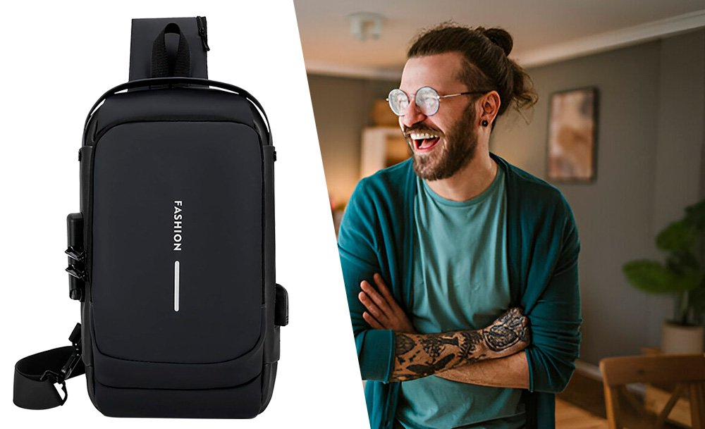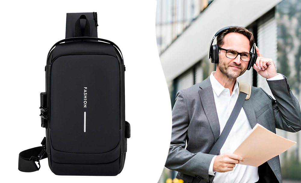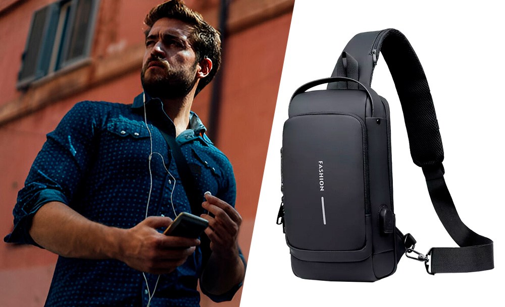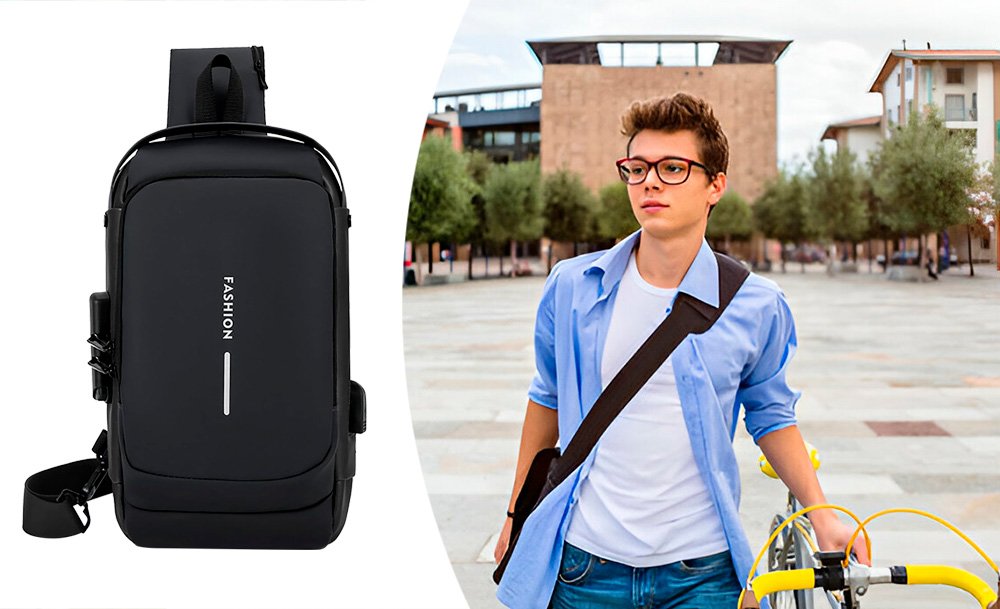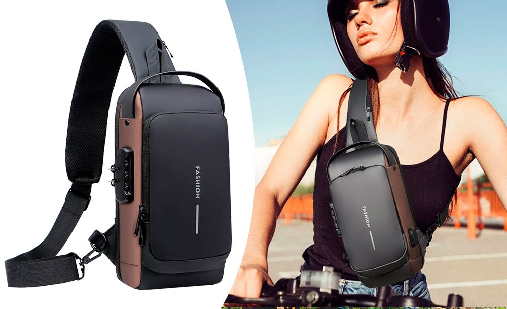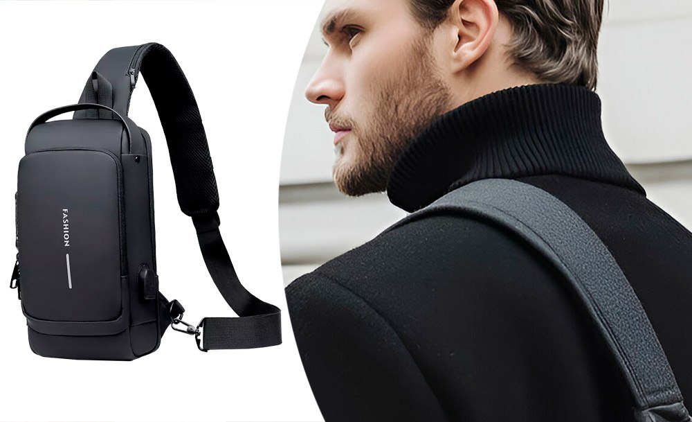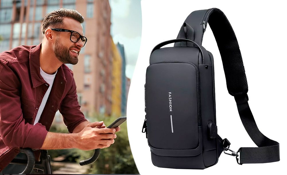 На задней части нагрудной сумки также есть потайной карман на молнии, сбоку карман на молнии для ключей, а на широкой эргономичной лямке, регулируемой по длине и углу основания, есть карман клапана быстрого доступа для пластиковой карты и очков.
