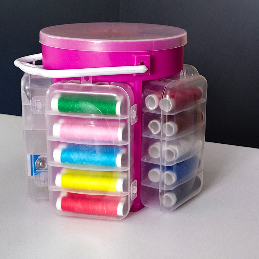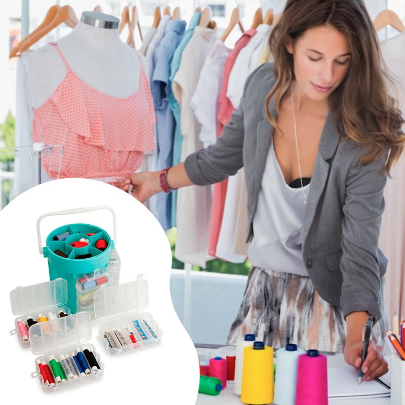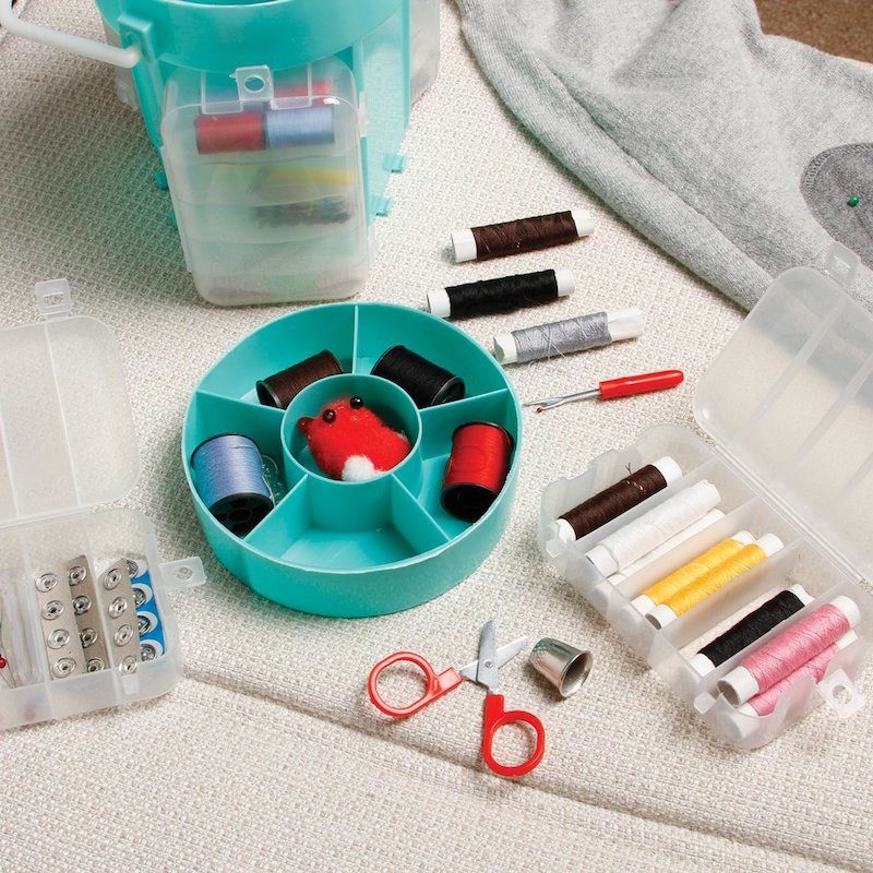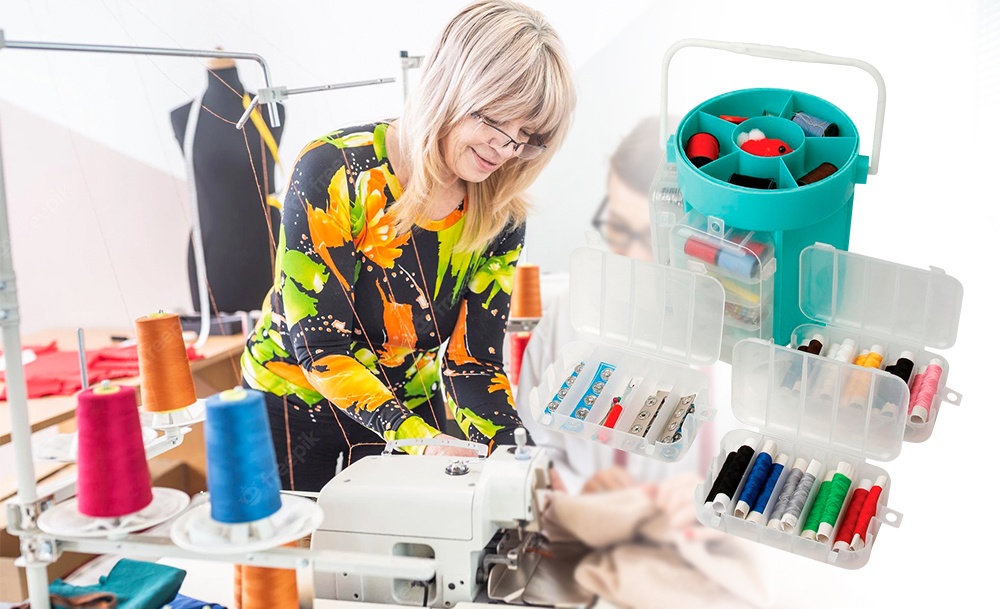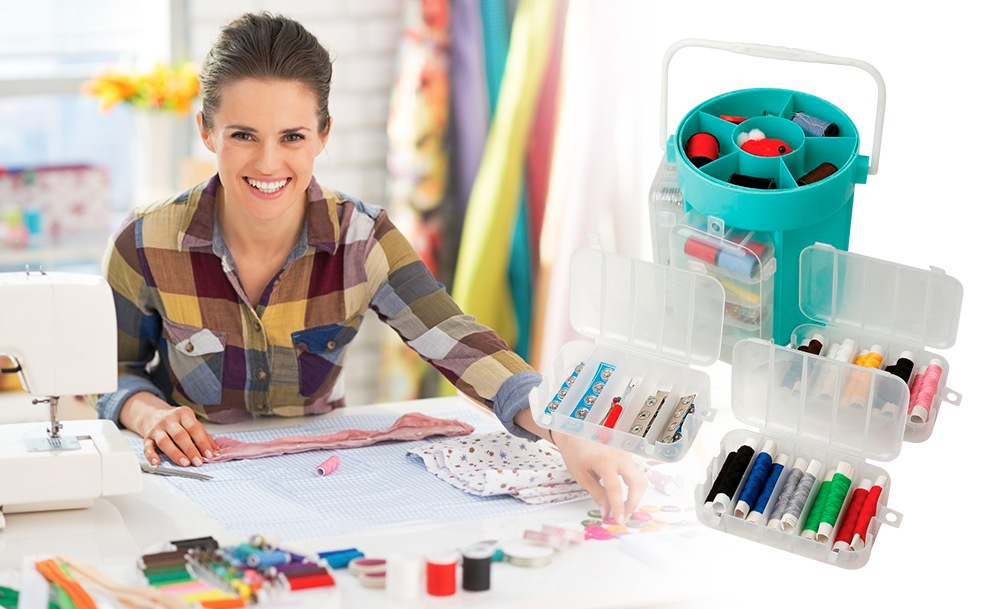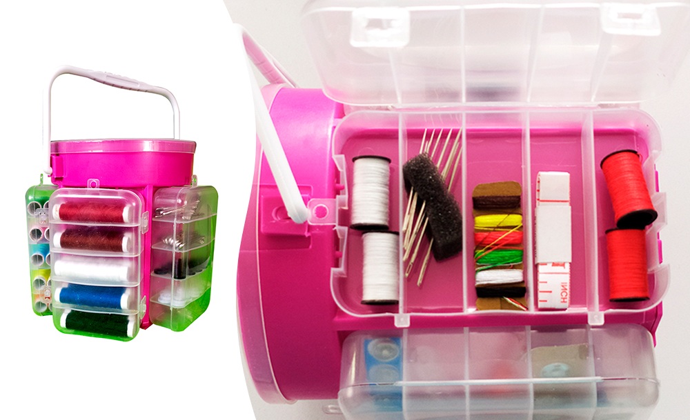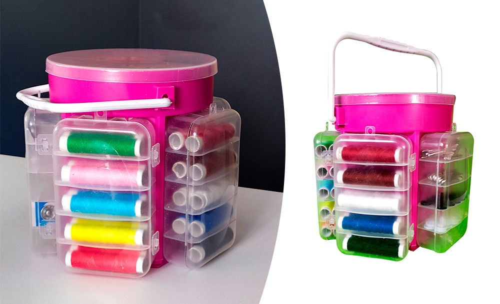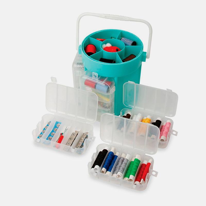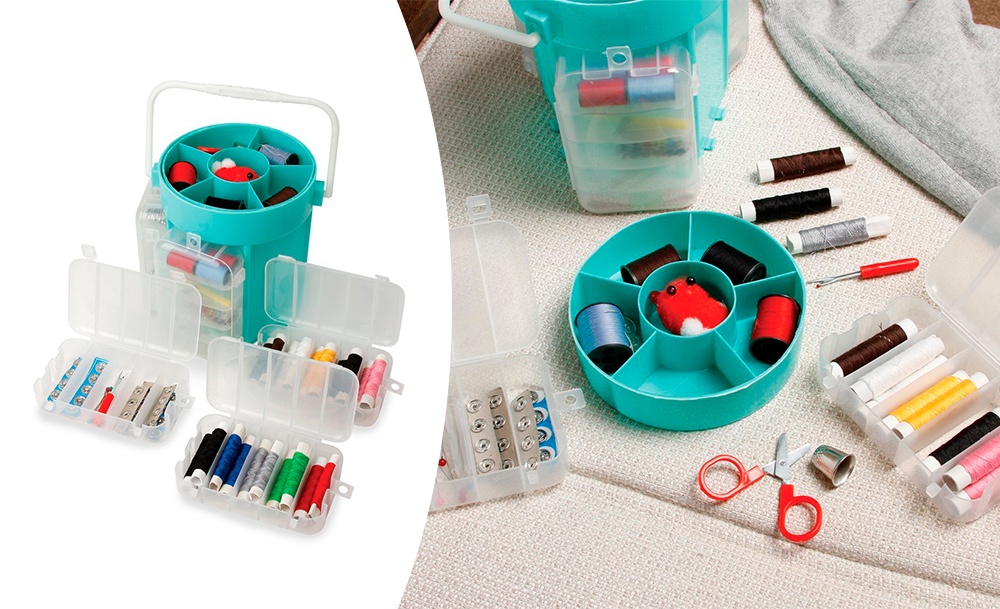 В наборе 5 ячеек для хранения и съемные полочки, которые позволят удобно организовать пространство. Они сделаны из прозрачного пластика, поэтому все швейные принадлежности будут на виду.