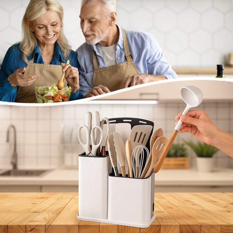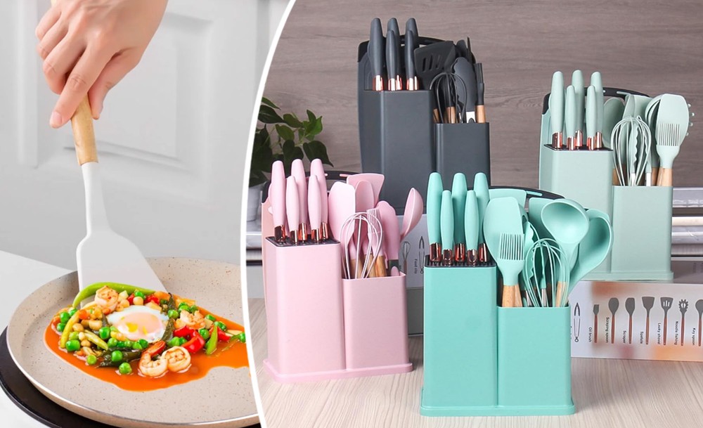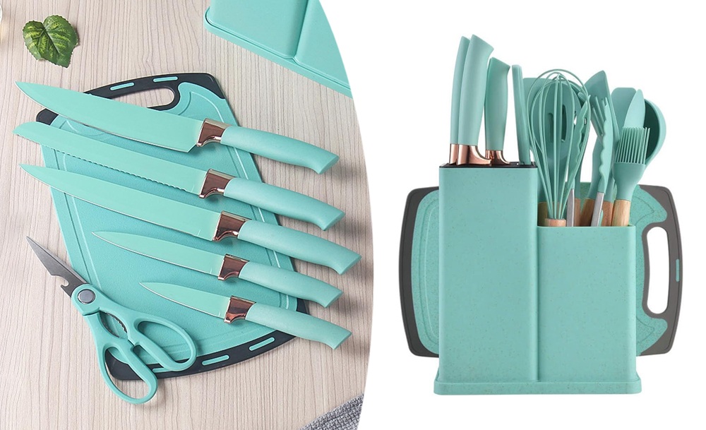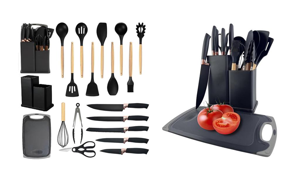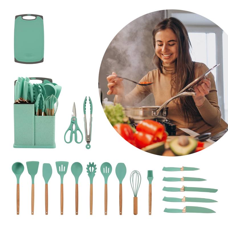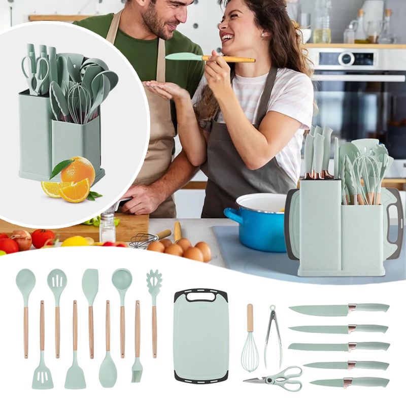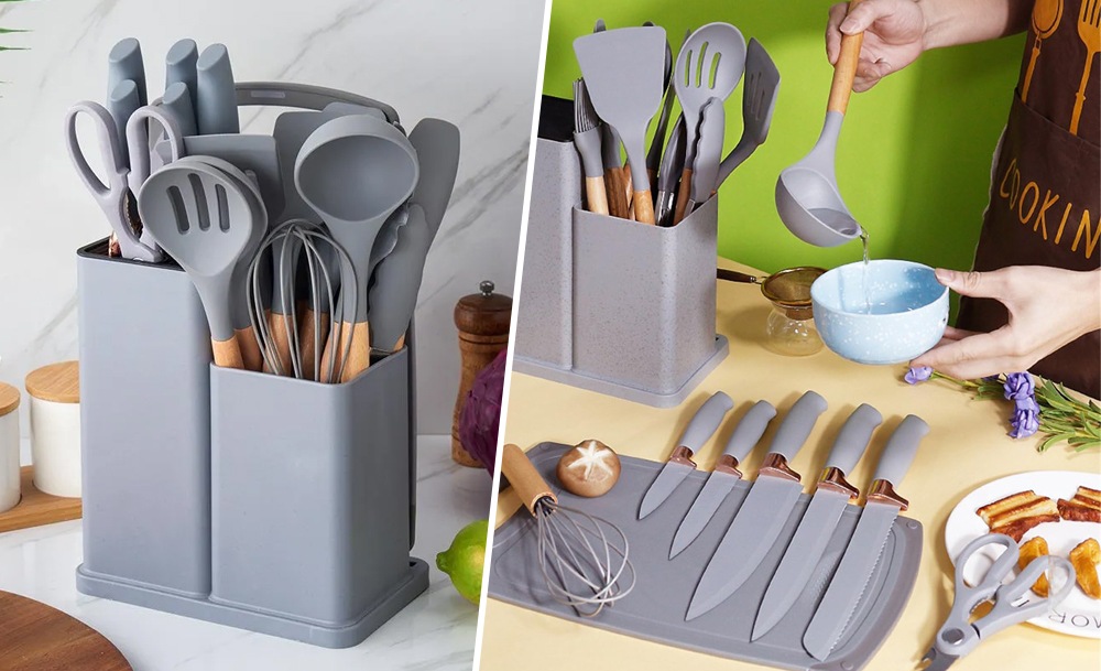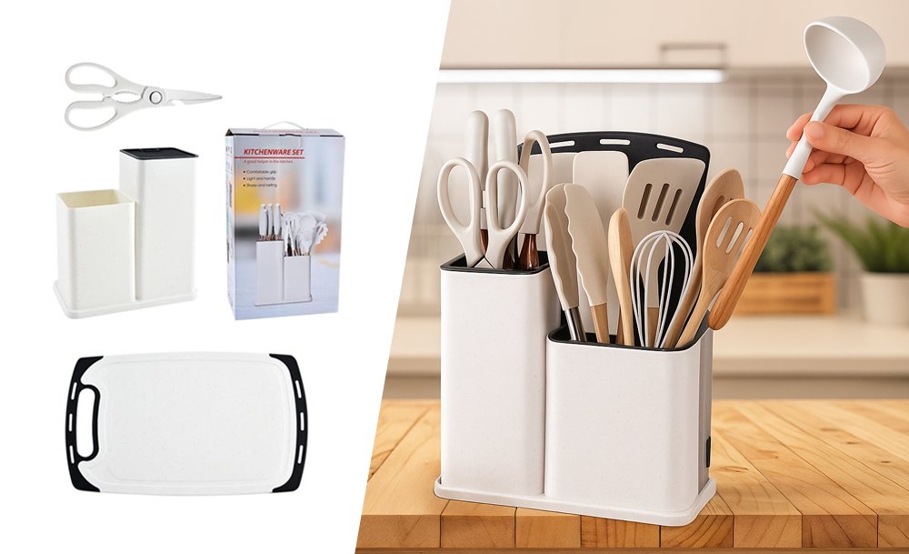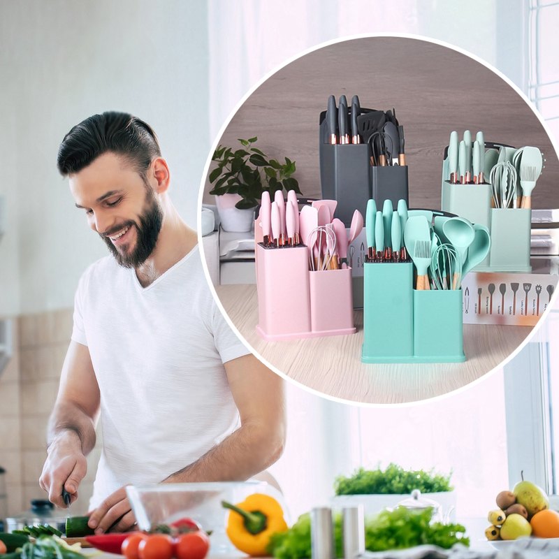 Набор включает в себя не только стандартные кухонные инструменты, такие как лопатки, ложки и веник, но и кухонные ножи, ножницы и доску для нарезки, что делает его универсальным решением для любых кухонных задач.