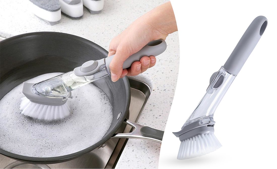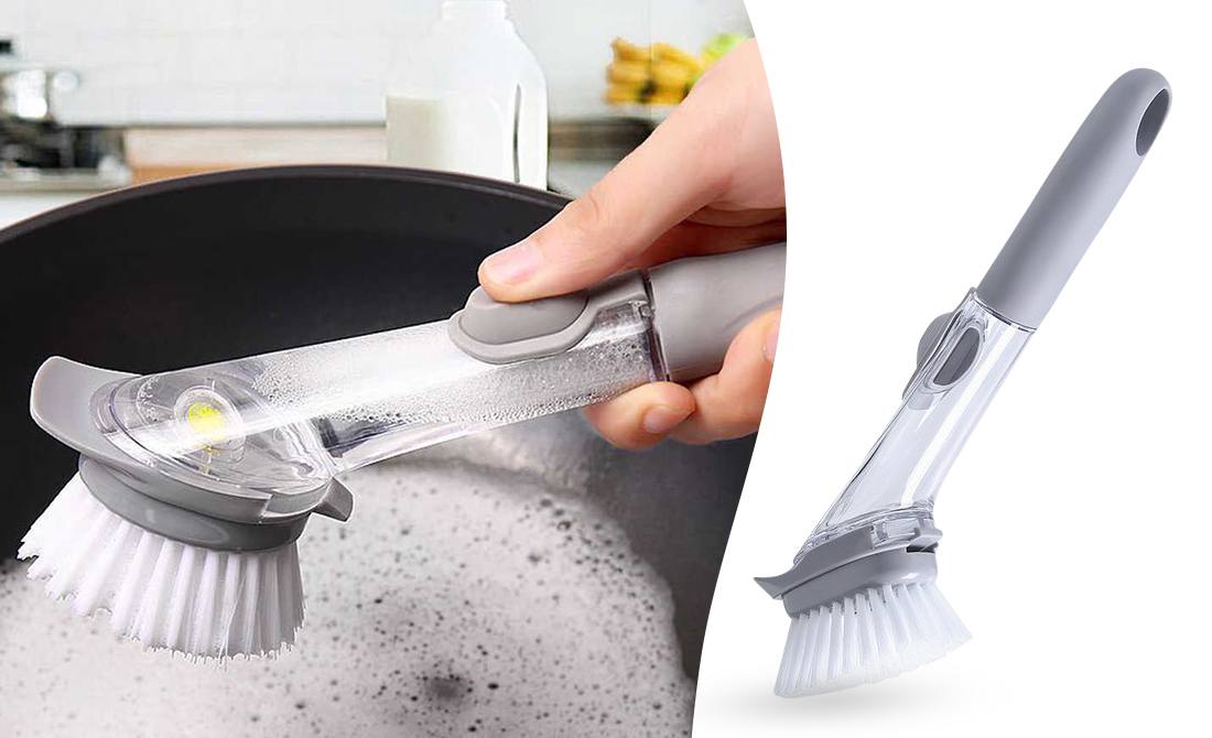 Насадка-аэратор на кран уменьшает расход воды и дарит возможность регулировки струи. Подвижный шарнир позволяет по желанию менять направление потока. Щетка для мытья посуды с резервуаром для моющего средства заметно упрощает эту ежедневную процедуру.