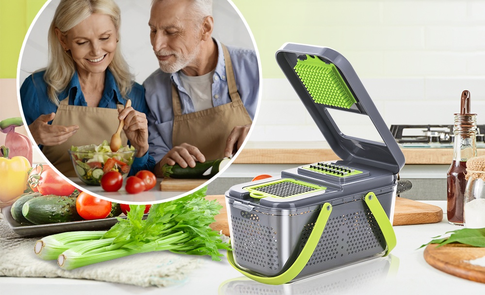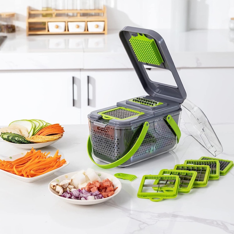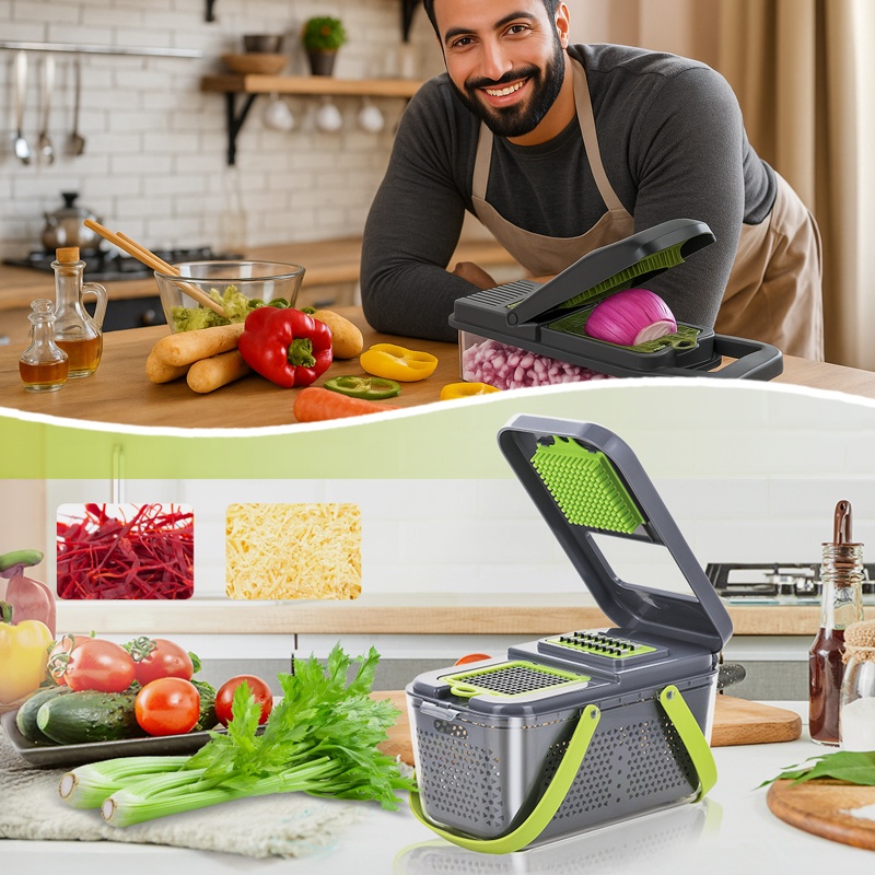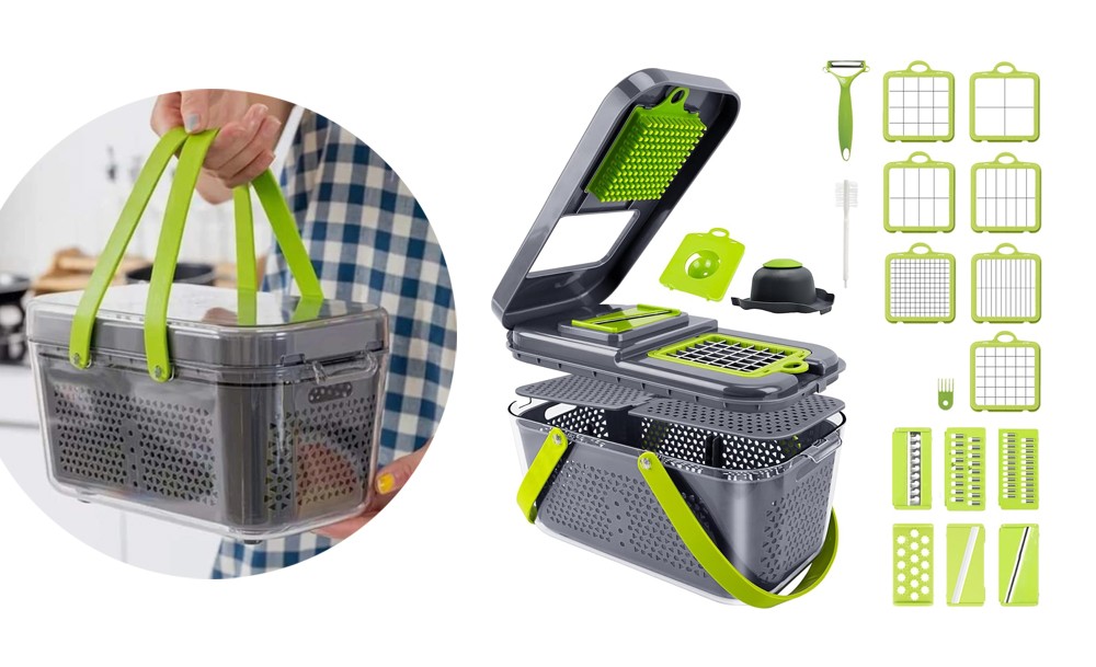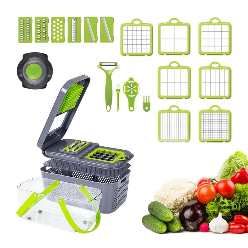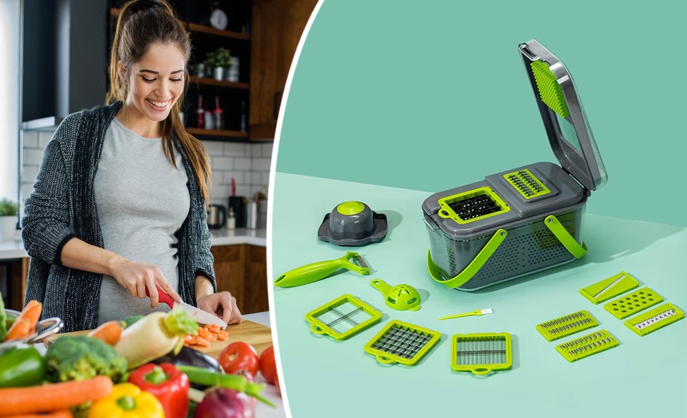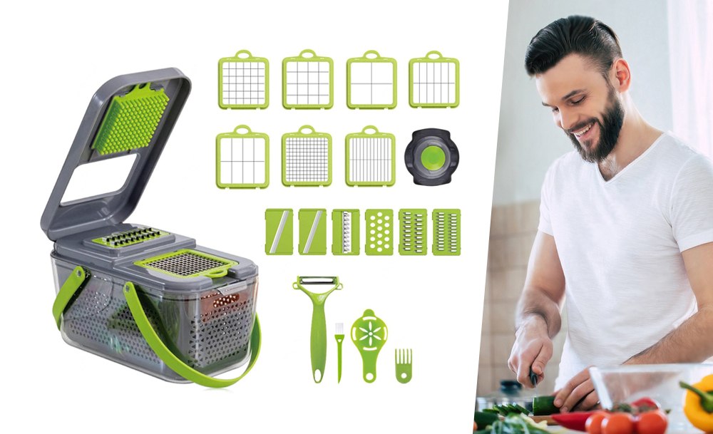 Овощерезка 22 в 1 Veggie Slicer — идеальный помощник на вашей кухне. Она объединяет в себе тёрку, слайсер, измельчитель и практичный контейнер. С помощью различных насадок вы с лёгкостью натрёте, нарежете или измельчите продукты в нужной форме. Всё компактно, безопасно и удобно. Прочная конструкция гарантирует долговечность. С Veggie Slicer готовка станет проще, быстрее и приятнее.
