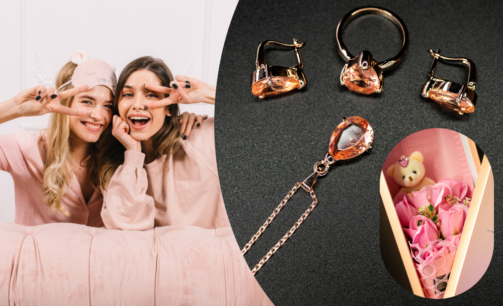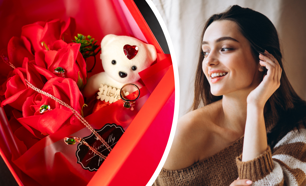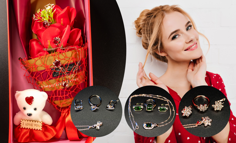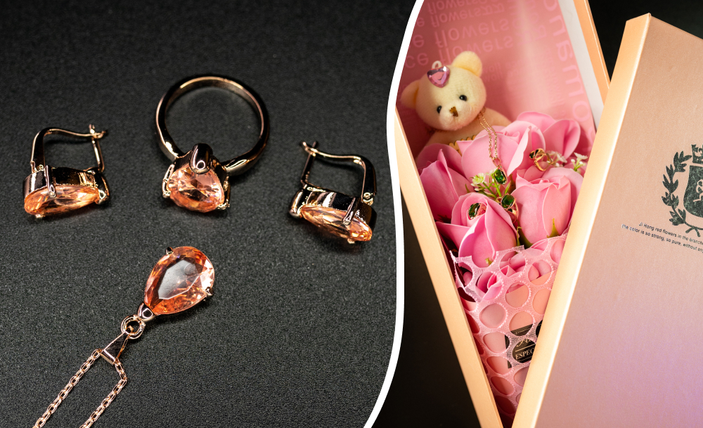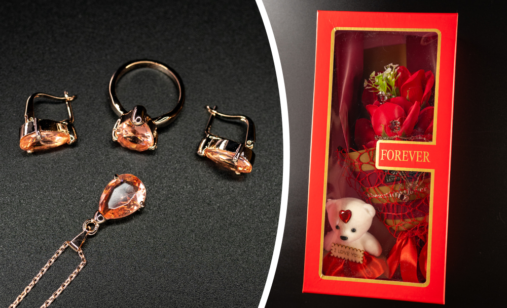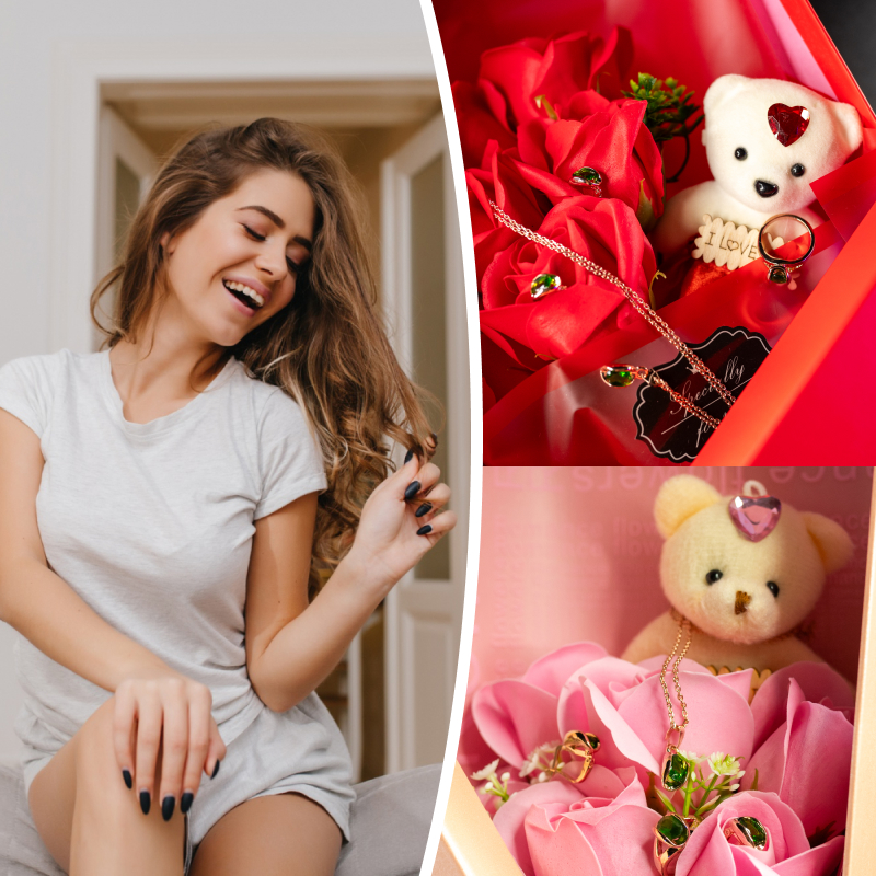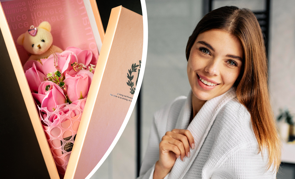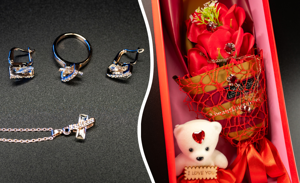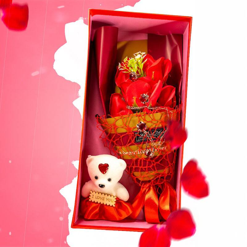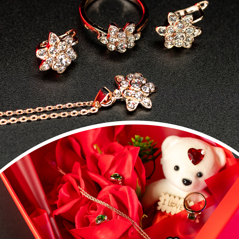 Подарочный набор ароматного мыла в виде роз с Мишкой + Булатный набор с фианитами 4 в 1