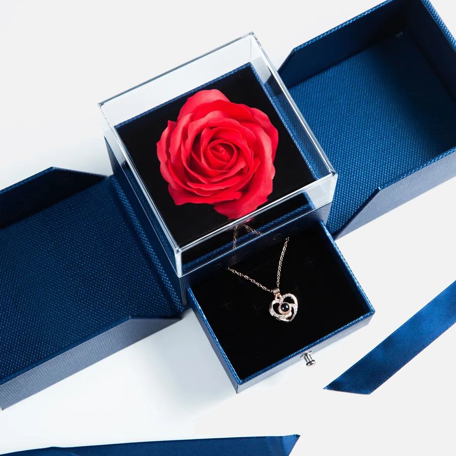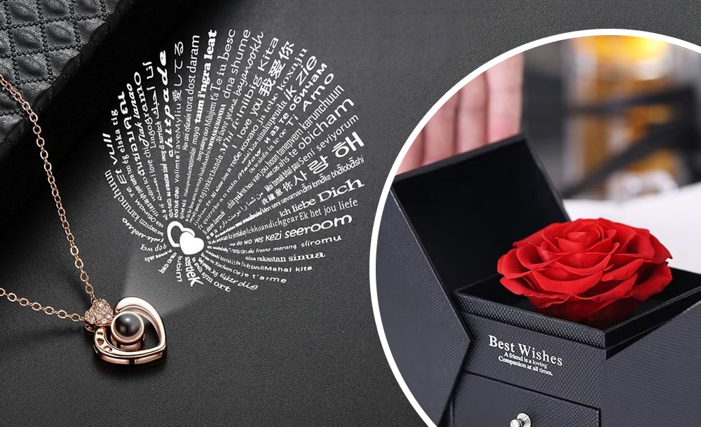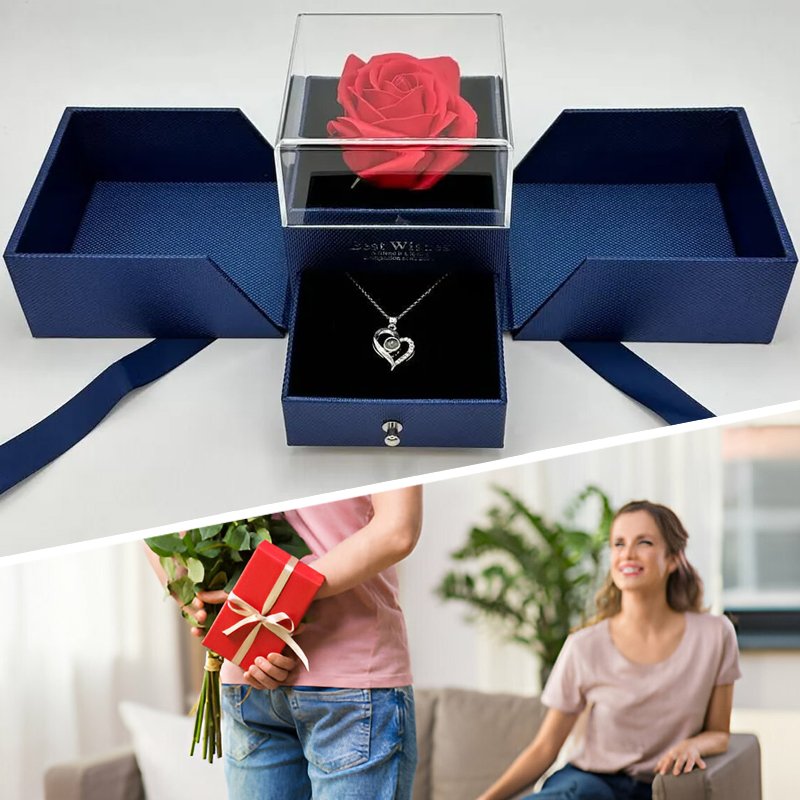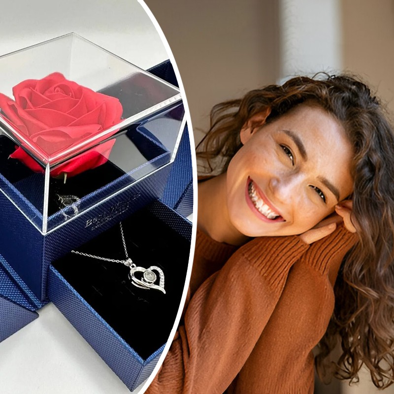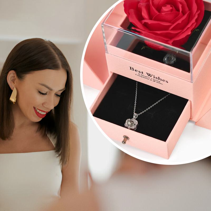 Подарочный набор Best Wishes – это утонченное сочетание красоты и чувств. Внутри — никогда не увядающая вечная роза и кулон с проекцией фразы “I Love You”. Поверните кулон к свету и увидите эти слова, словно из другой реальности. Это действительно магия, спрятанная в маленьком украшении.