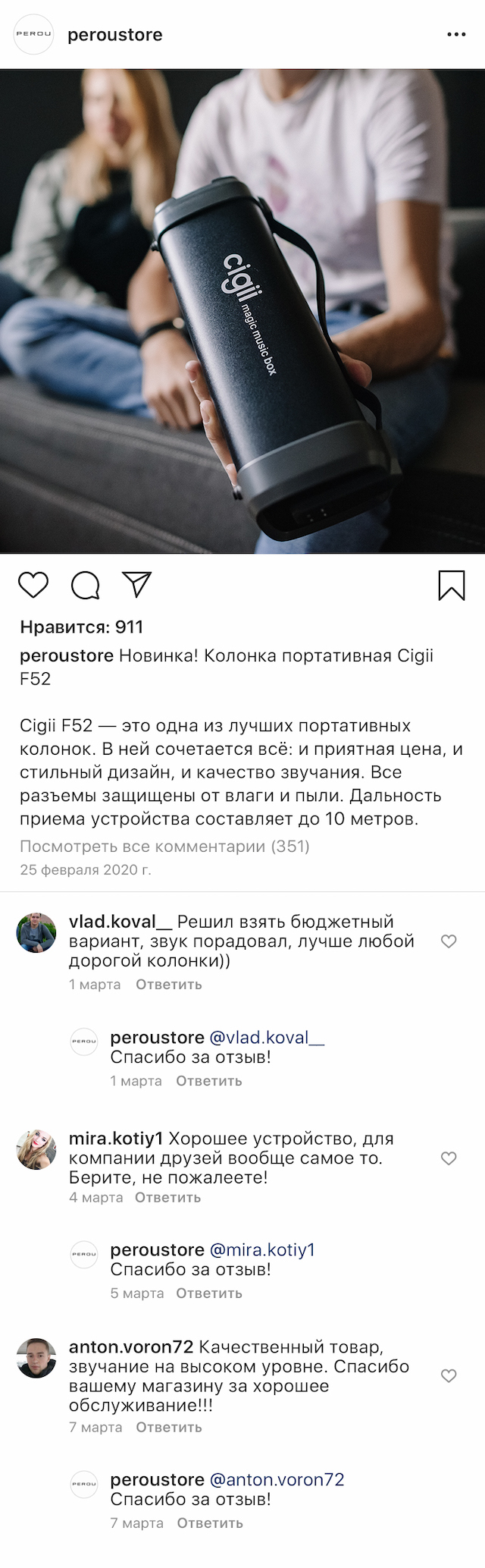Cigii F52 — это одна из лучших портативных колонок. В ней сочетается всё: и приятная цена, и стильный дизайн, и качество звучания. Все разъемы защищены от влаги и пыли. Дальность приема устройства составляет до 10 метров. Это значит, что ваш телефон не обязательно должен быть рядом с колонкой для бесперебойного подключения.