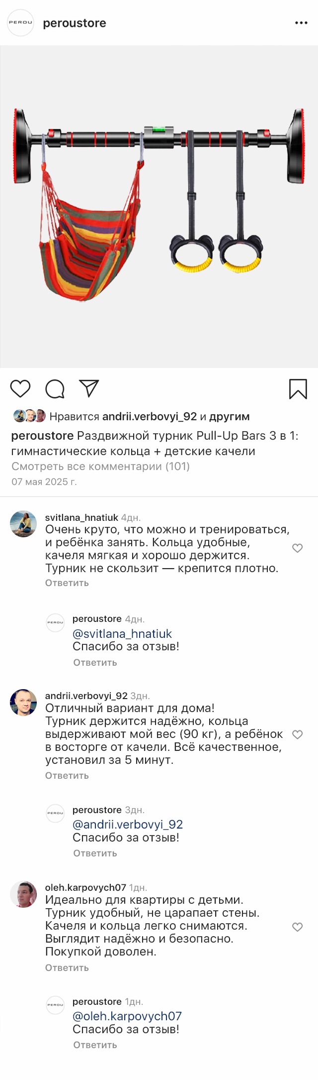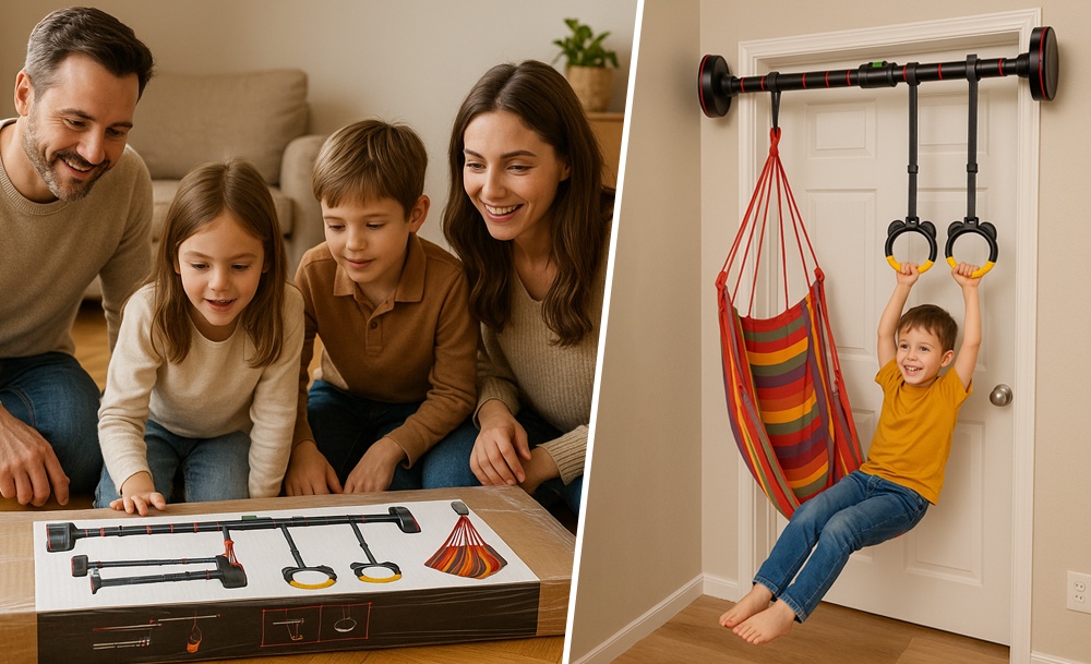 В комплект входят съёмные гимнастические кольца и детская качеля, которые легко регулируются по высоте. Турник становится не только спортивным снарядом, но и игровой зоной для ребёнка — удобное решение для активного дома.
