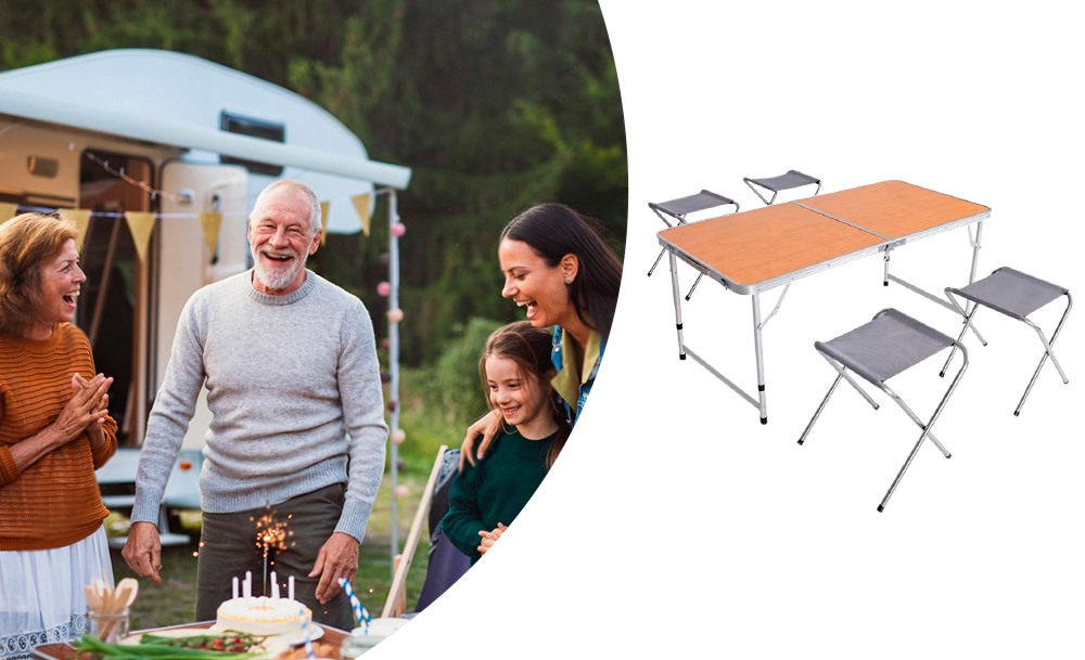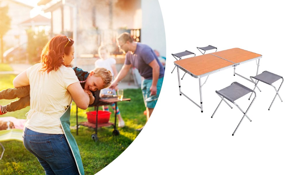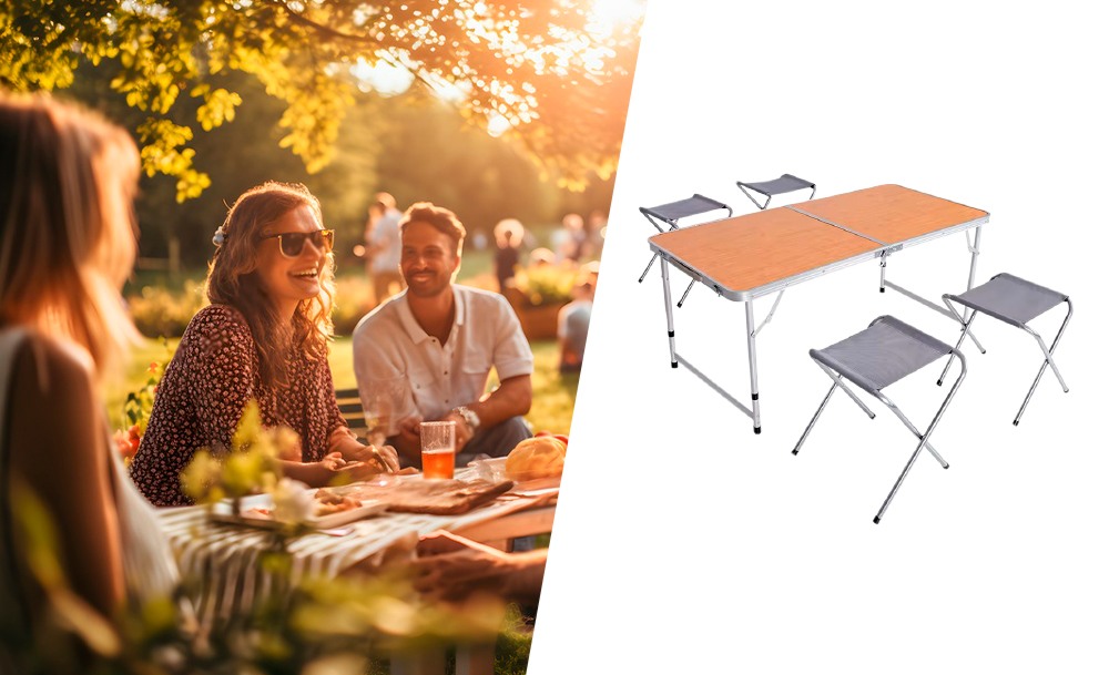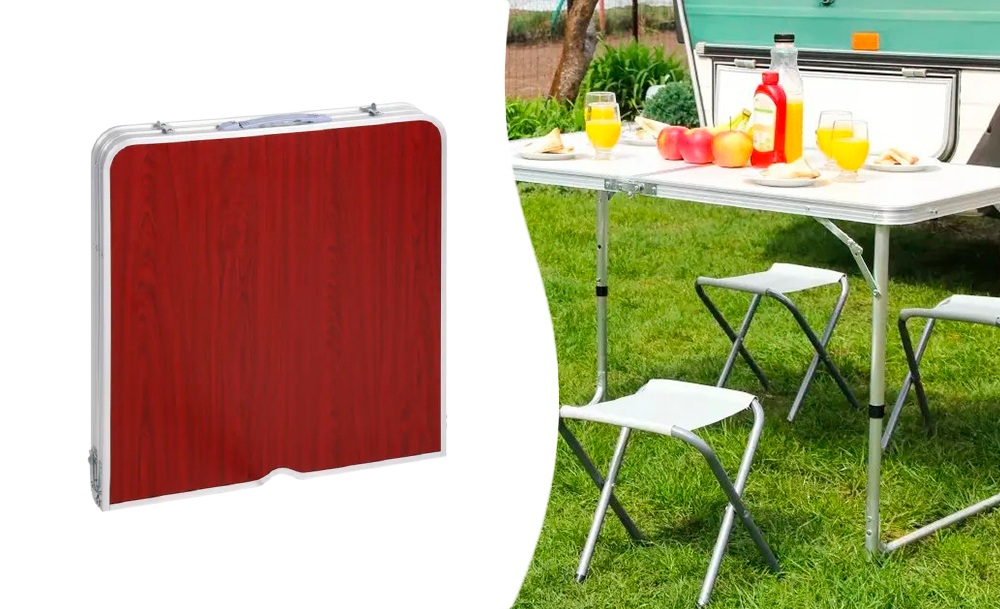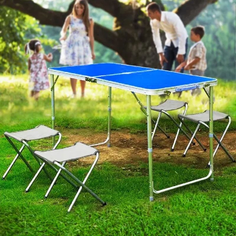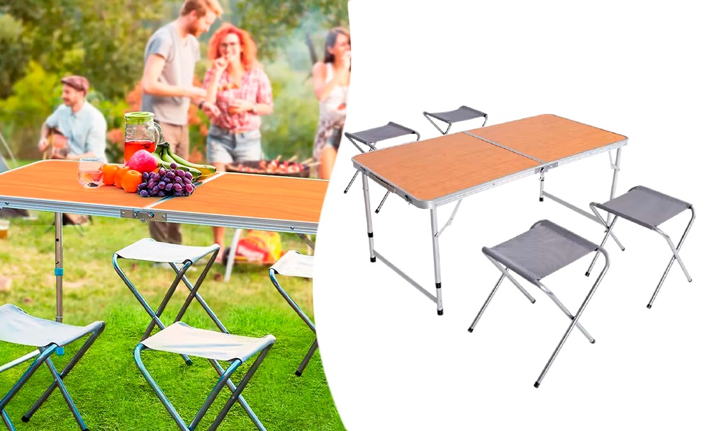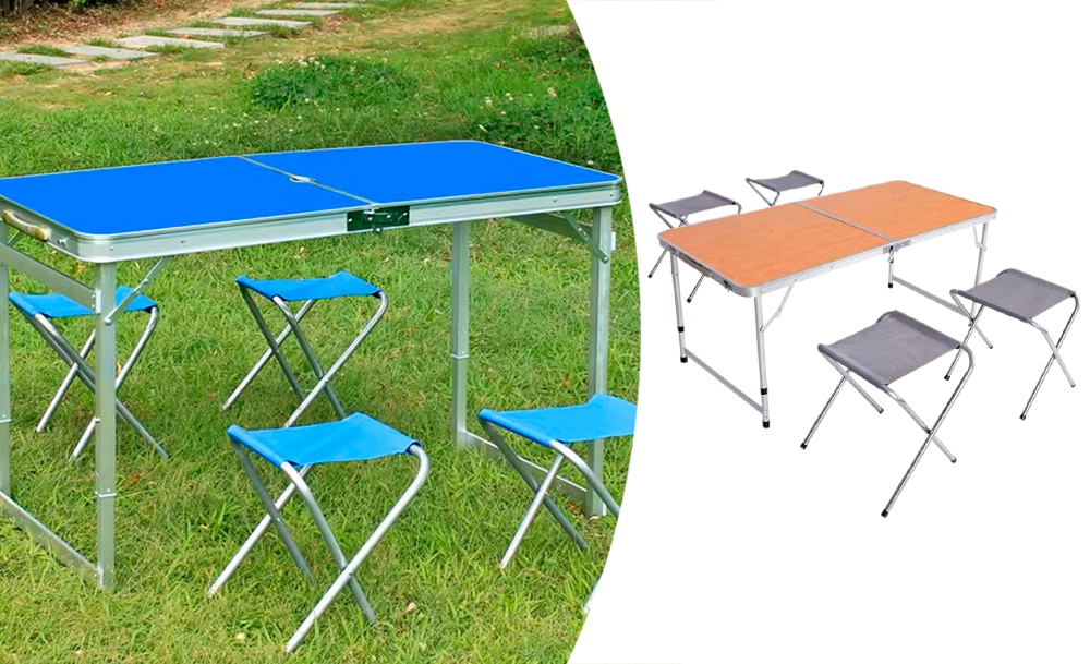 Складной стол – это одна из тех вещей, которая необходима для поездок на пикник. У стола – утолщённый алюминиевый каркас. Четыре стульчика с двойными тканевыми сиденьями. Он очень легко разбирается и моется.
