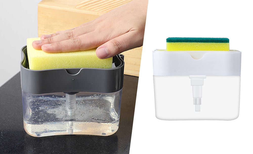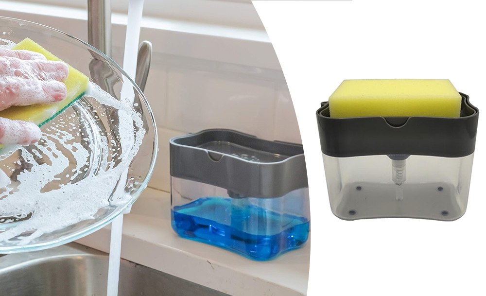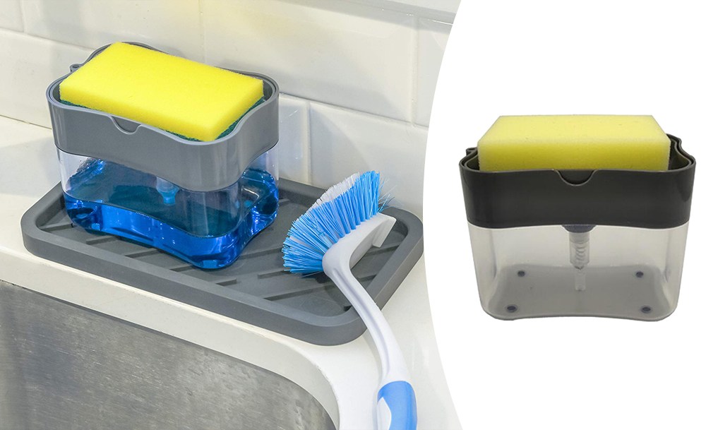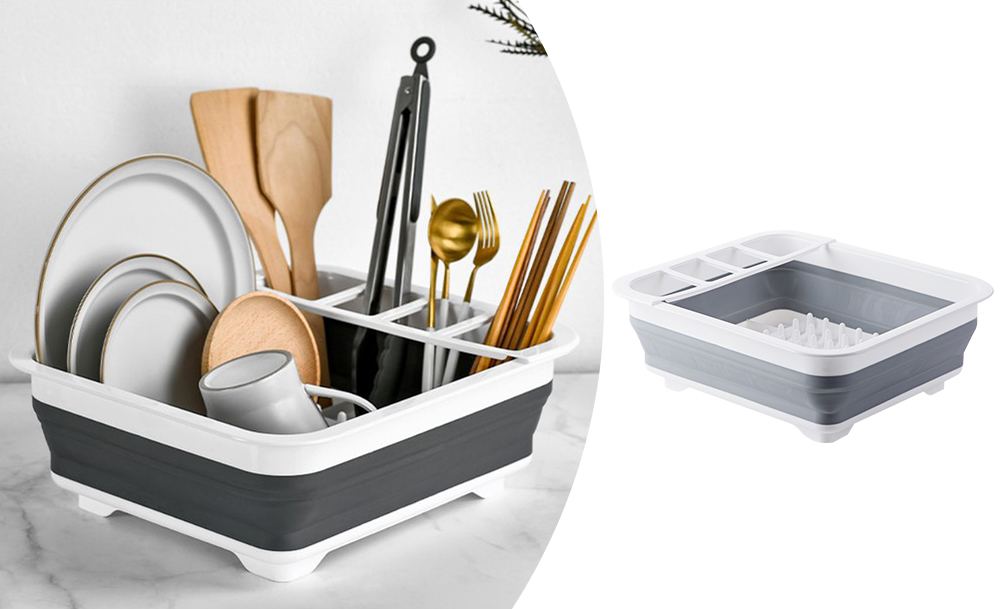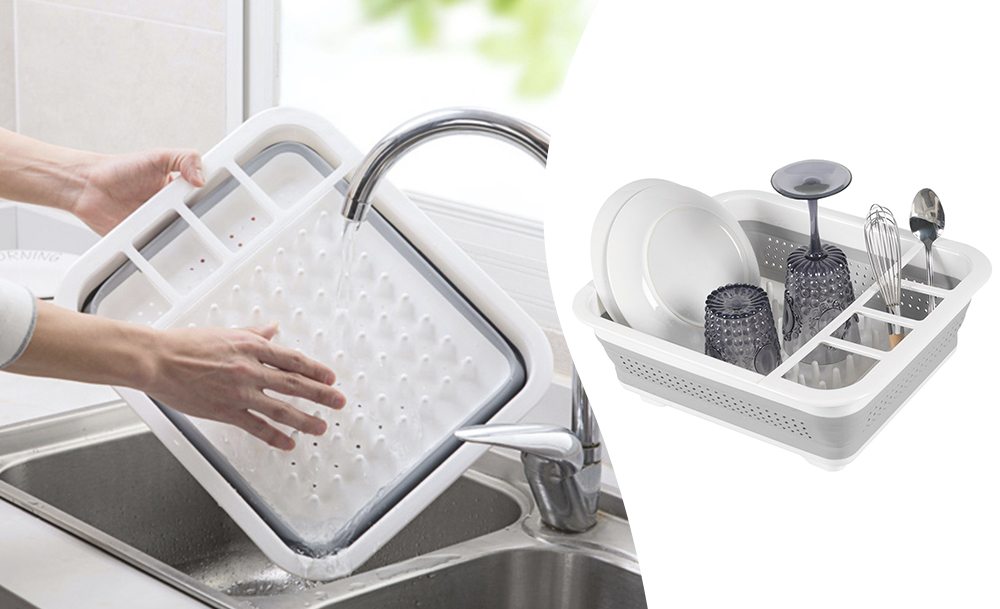 Силиконовая раскладная сушилка для посуды оснащена решеткой и специальным дном для вертикальной установки кухонных принадлежностей и тарелок. Органайзер для мочалок оснащен встроенной емкостью для жидкого моющего средства. Одно нажатие, и губка готова к использованию.