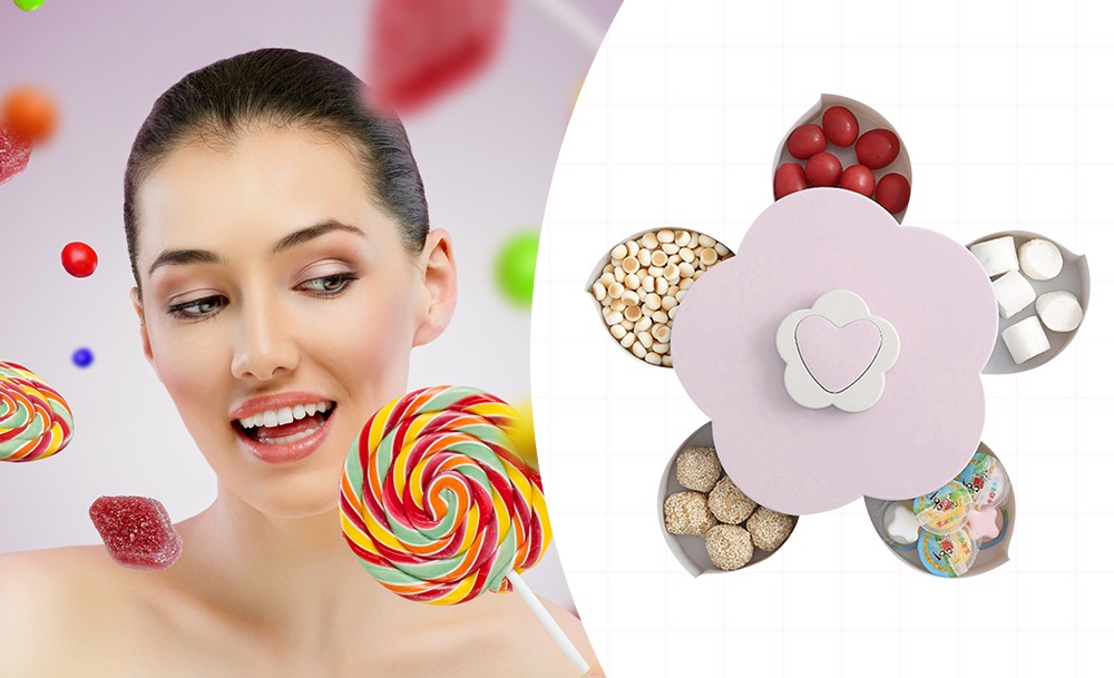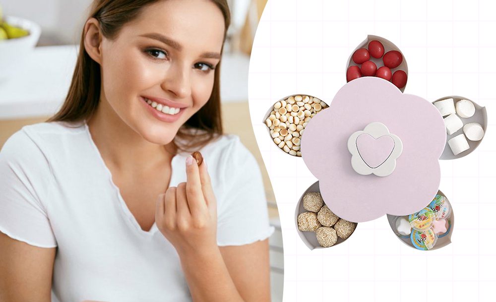 Подставка для телефона размещена в верхней части складной конфетницы, поэтому вы без проблем сможете смотреть видео или фильмы, лакомясь закусками.