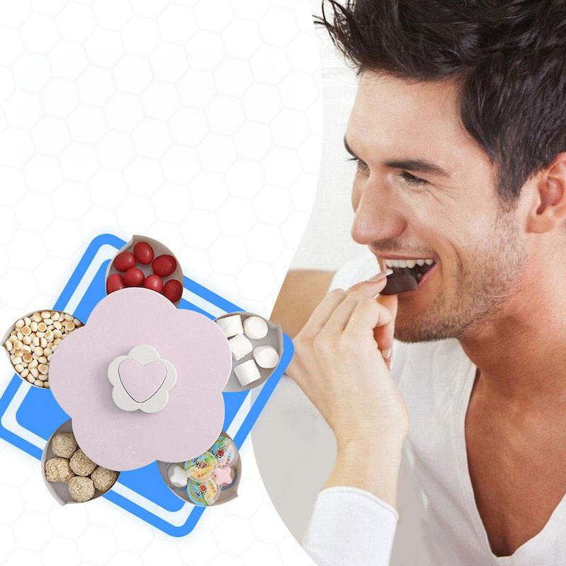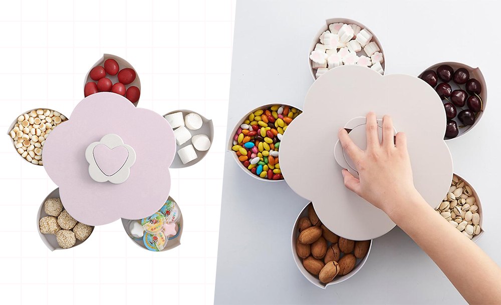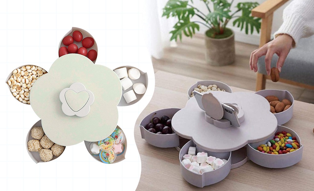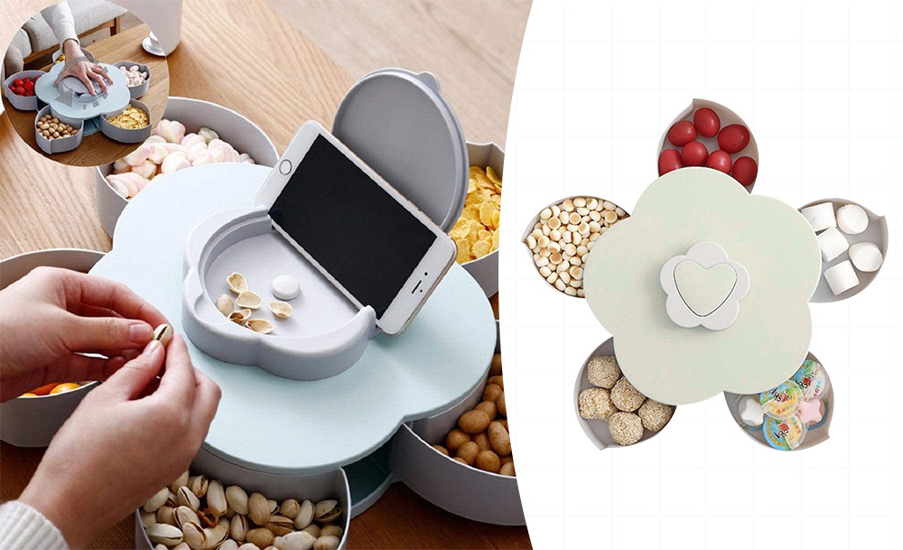 Вращающаяся конфетница с подставкой для телефона – практичный элемент декора вашего стола, который удивит близких и друзей. Органайзер выполнен в форме цветка с лепестками, которые раскрываются и закрываются легким прокручиванием ручки. Внутри лепестков можно разместить конфеты, орехи, фрукты и любые другие закуски.