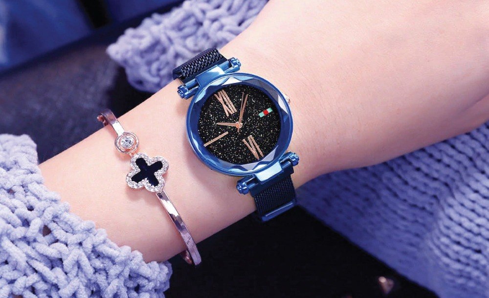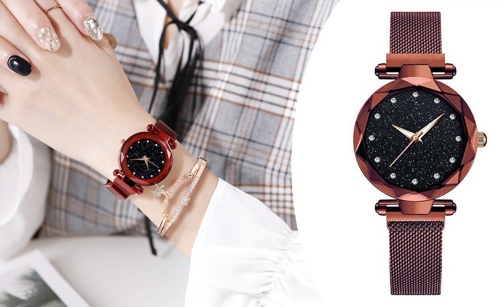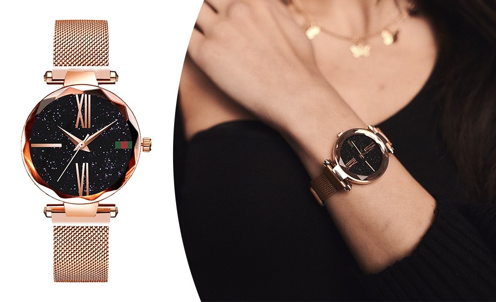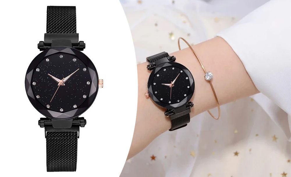Женские часы звездного неба с черным циферблатом создадут утонченный образ. Это красивый аксессуар и элегантное дополнение к любой одежде. Кварцевый механизм обеспечивает точность и надежность, а ударопрочный корпус и закаленное стекло позволит использовать это замечательное изделие длительное время.