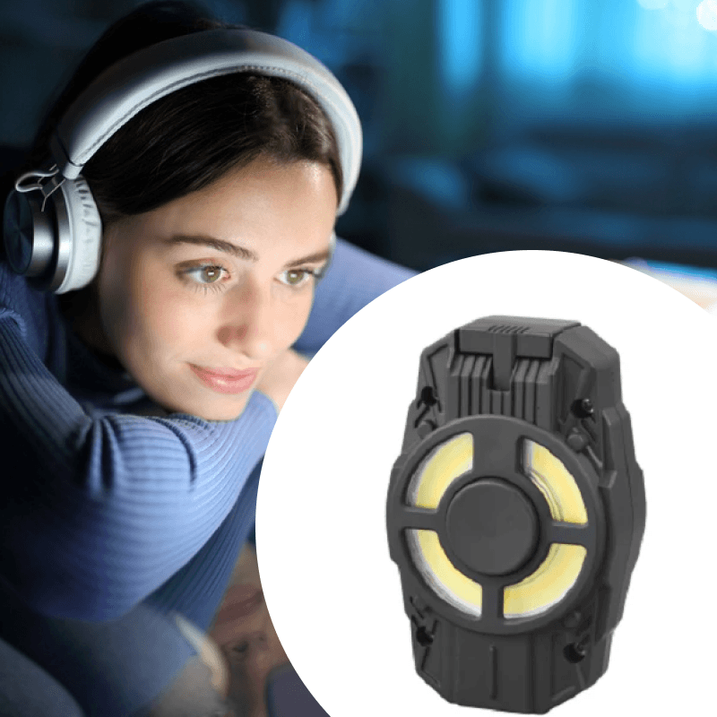Вбудований ліхтарик має 3 режими яскравості – яскравий промінь, рівномірне біле світло та попереджувальне миготіння. Акумулятор заряджається через порт USB та працює до 5 годин без підзарядки. Девайс можна поставити на стіл або підвісити до будь-якого предмета за допомогою спеціального кріплення.
