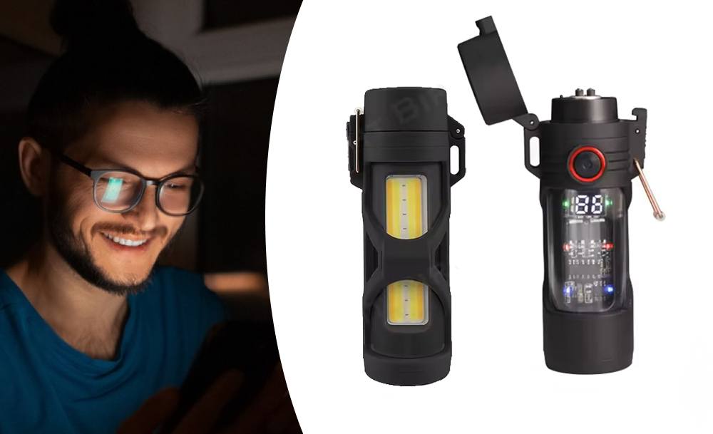 Багатофункціональний ліхтар Multifunctional COB – це універсальний прилад, що поєднує в собі джерело вогню та освітлення. При своїй легкості та компактних розмірах він функціональний та практичний: завдяки подвійній плазмовій дузі працює в будь-яку погоду та не боїться вітру, дощу та снігу; а ударостійкий надійний корпус захищений від вологи та пилу.