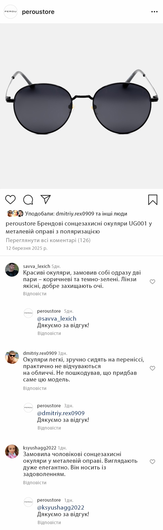 Затемнені лінзи надійно захищають очі від яскравого сонячного світла, ультрафіолету та відблисків після дощу. Високоякісні матеріали, з яких виготовлені окуляри, забезпечують їхню довговічність.