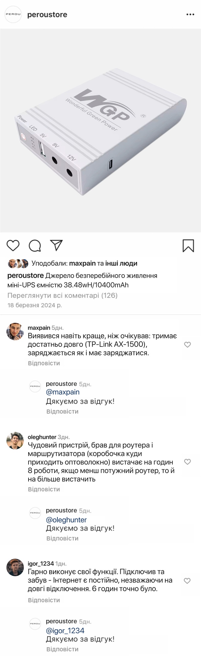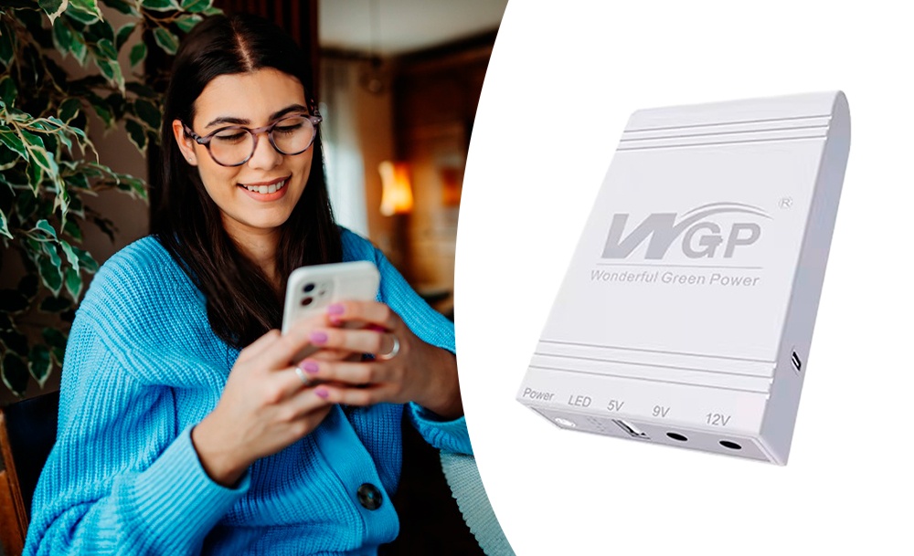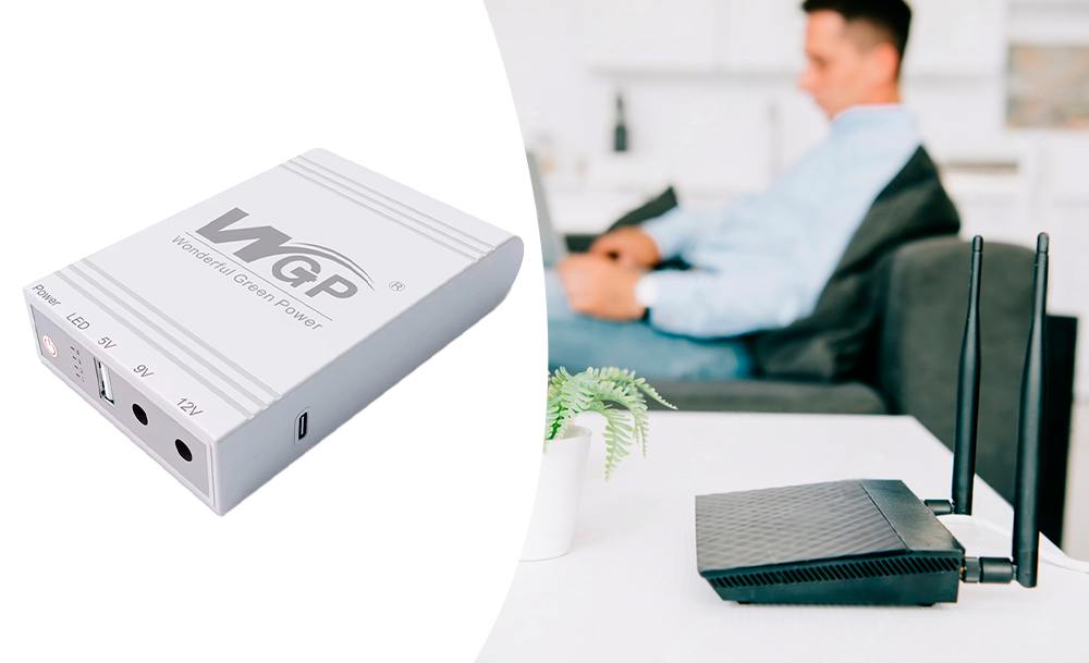 Mini UPS WGP – пристрій, який дасть змогу медіаконвертору та роутеру продовжувати роботу під час вимкнення електрики до 20 годин. Має 2 вбудовані виходи DC на 9 і 12 вольт, USB 5 в, а також набір дротів і перехідників у комплекті.