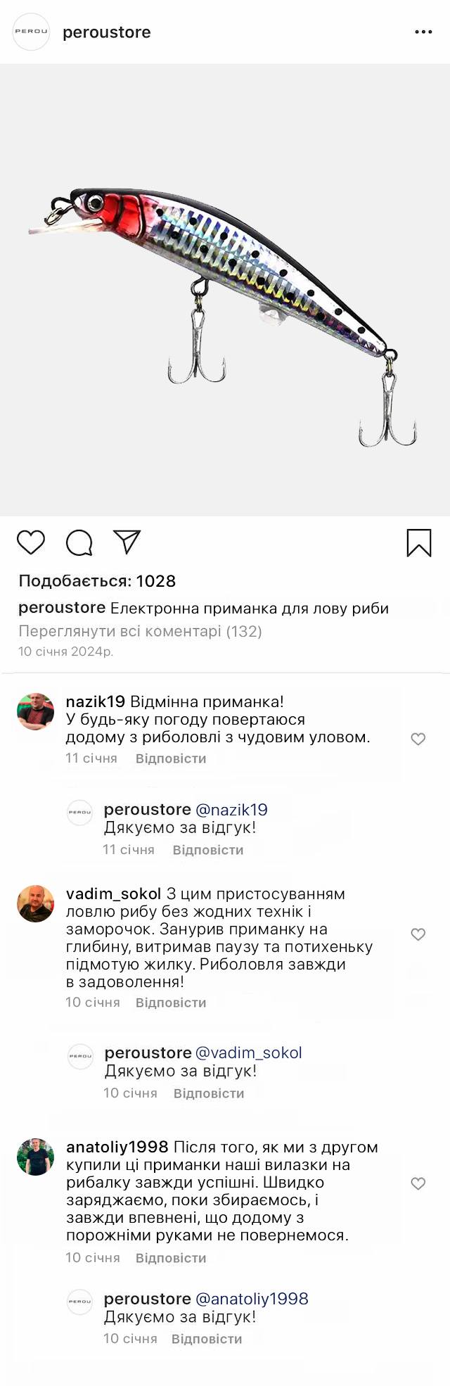 Електронна приманка для лову риби Twitching Lure – це перший електронний воблер, який заряджається (довжиною 13 см, вагою 20 г), призначений для лову хижої риби, такої як судак, окунь, щука та ін. Приманка зроблена з дуже міцного матеріалу з яскравим люмінесцентним кольоровим забарвленням, що світиться лише у воді.