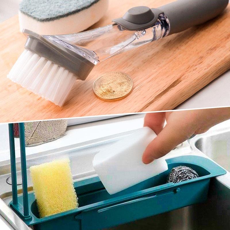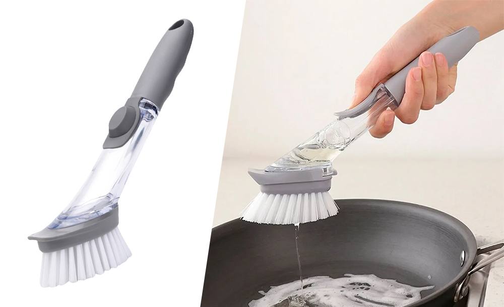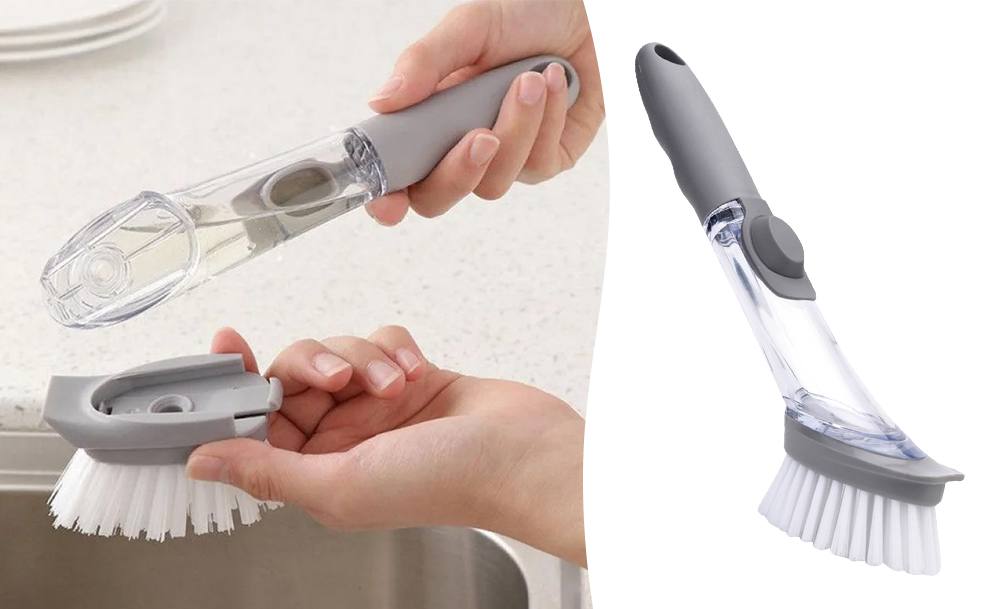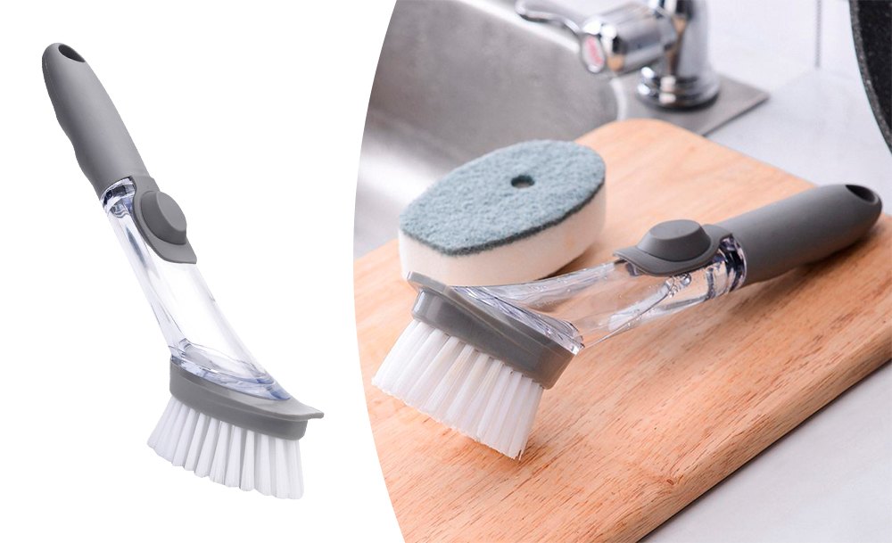 Щітка для миття посуду легко видаляє забруднення та не дряпає поверхню. Вбудований дозатор для миючого засобу регулює витрати рідини одним натисканням кнопки. Універсальний пристрій можна використовувати для миття посуду, плити, раковини та кухонної плитки.
