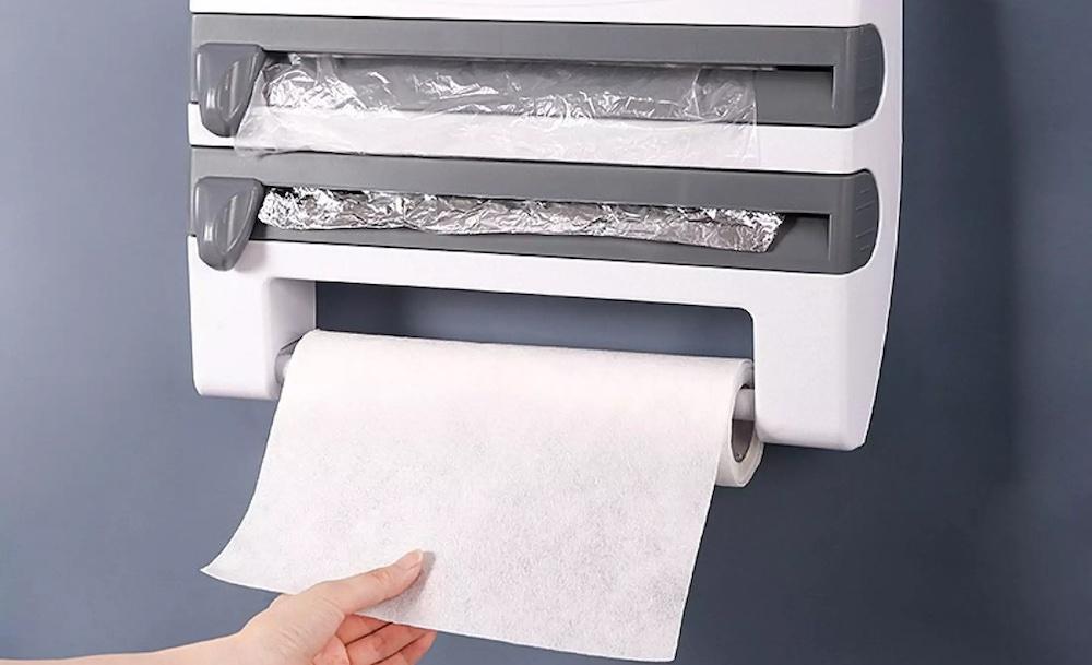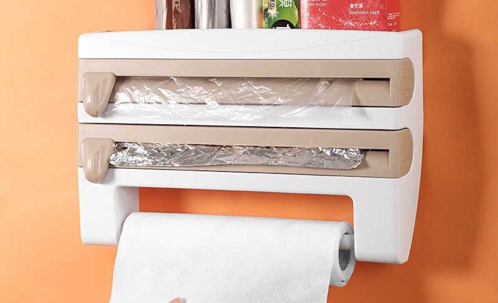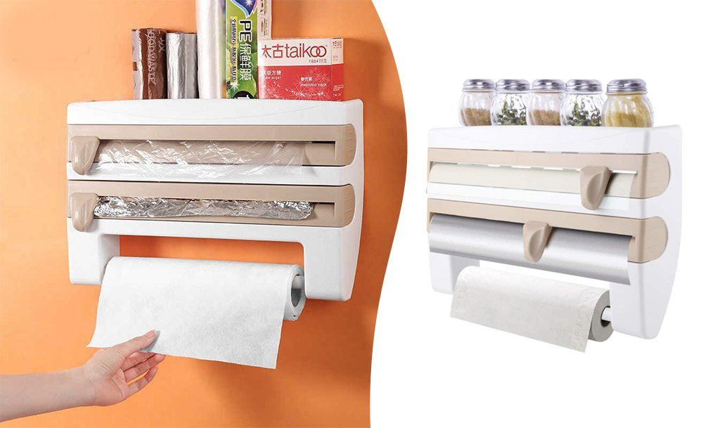Кухонний органайзер 4 в 1 поєднує кілька корисних функцій. Утримувач для паперових рушників завжди під рукою, рулон можна легко зняти і замінити. Тримач для алюмінієвої фольги допомагає швидко відмотати необхідну кількість та відрізати спеціальним вбудованим пристроєм. Утримувач харчової плівки має пластикову смугу, яка після відділення потрібного шматка не дає плівці повернутися назад. Полиця для спецій і дрібного приладдя комфортно розташовує їх у доступному місці.