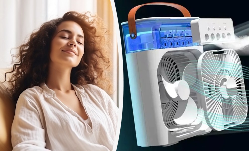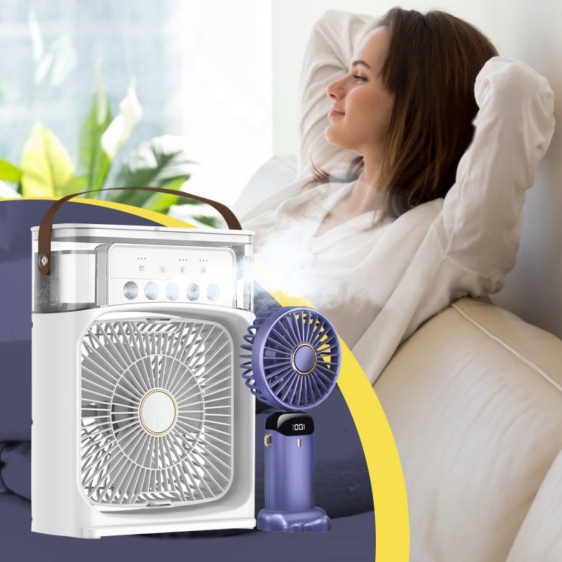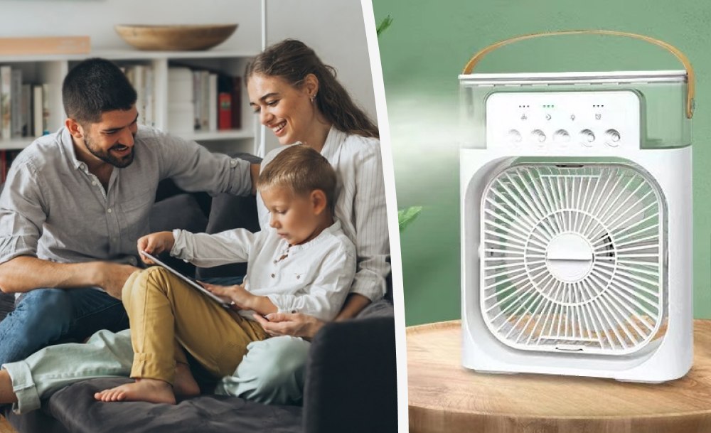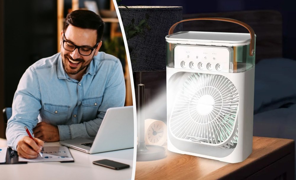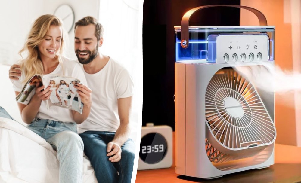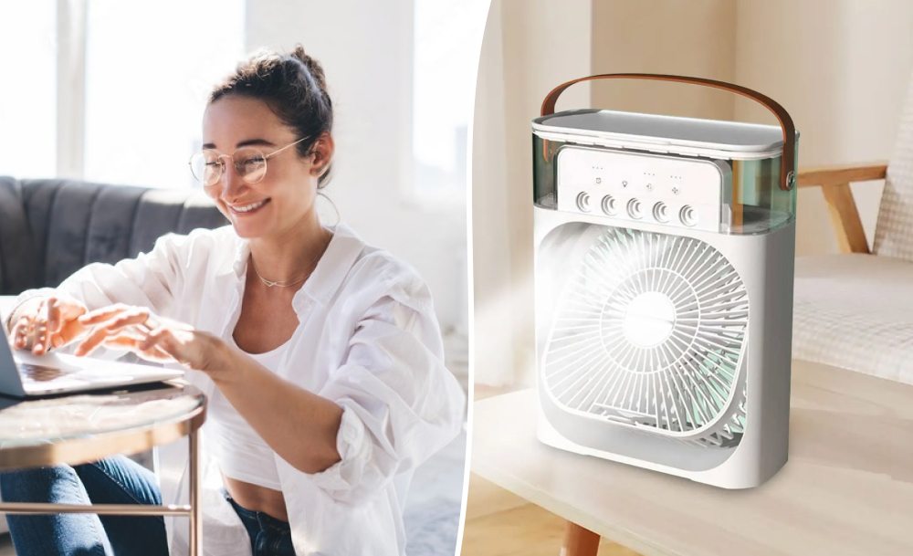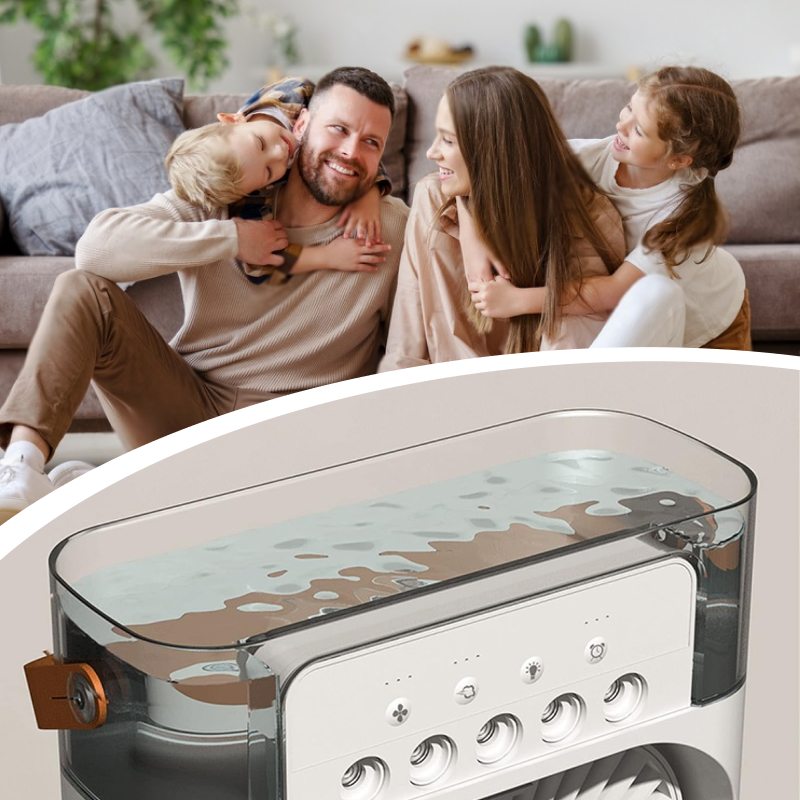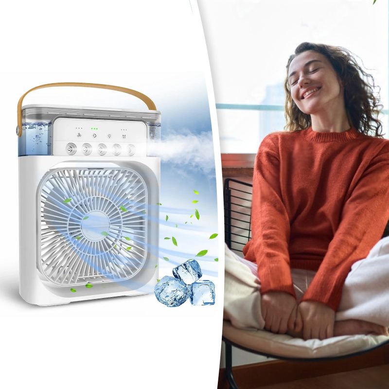 Міні кондиціонер зі зволожувачем повітря має великий резервуар для води (900 мл), що забезпечує його безперервну роботу протягом 4,5-12 годин. Прилад оснащений 7-ма світлодіодними світильниками, які можна відключати, а також 5-ма бризками великого калібру для більш ефективного зволоження повітря.
