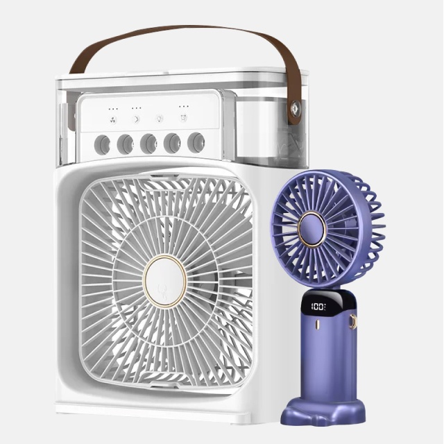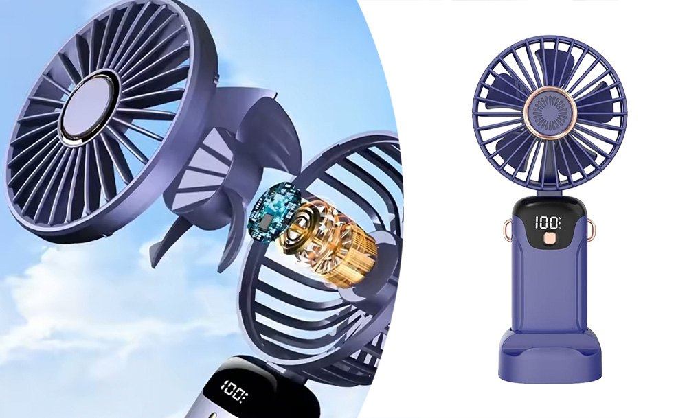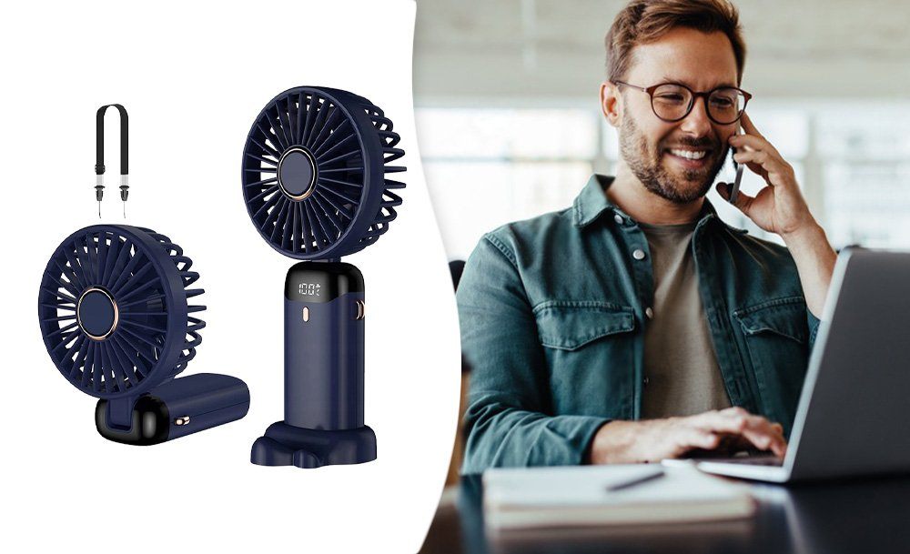 Міні вентилятор з підставкою для телефону та дисплеєм – це персональний настільний USB-вентилятор. У його комплект входить ремінь, за допомогою якого пристрій можна повісити на шию, залишаючи руки вільними. Прилад зручно складається, що дозволяє використовувати його як підставку для телефону.