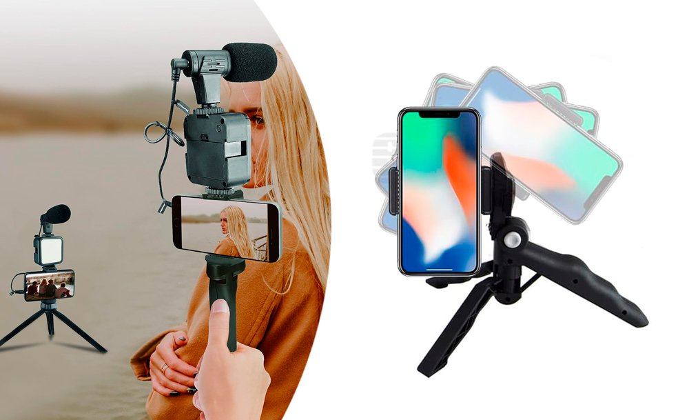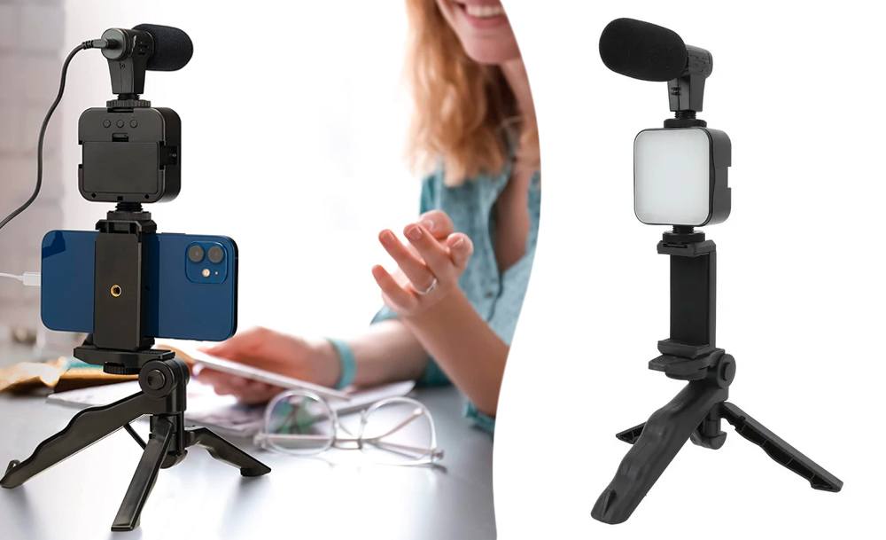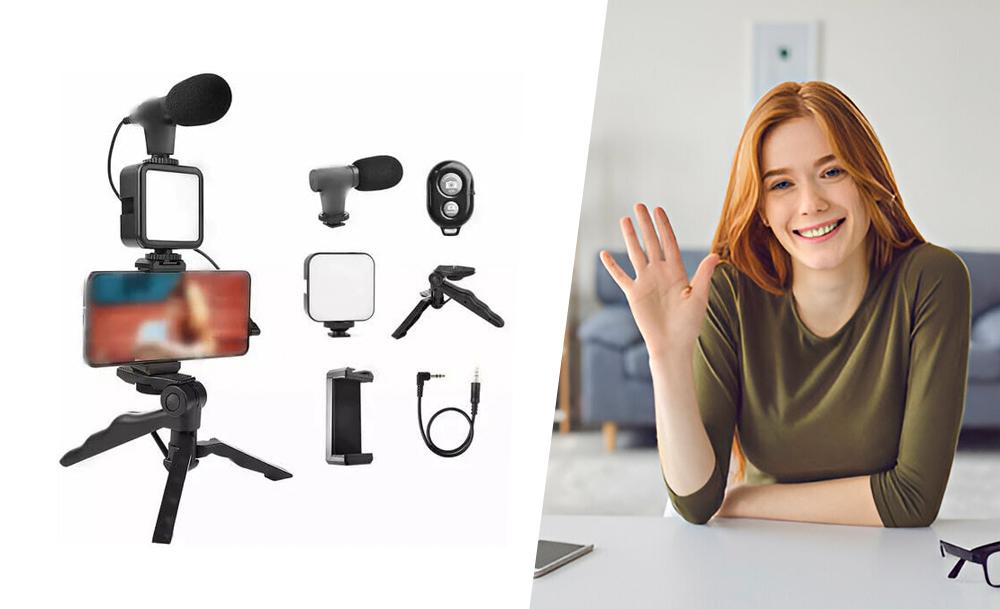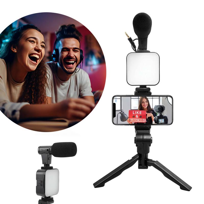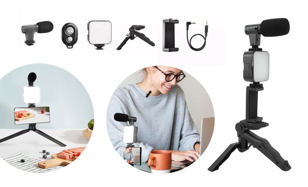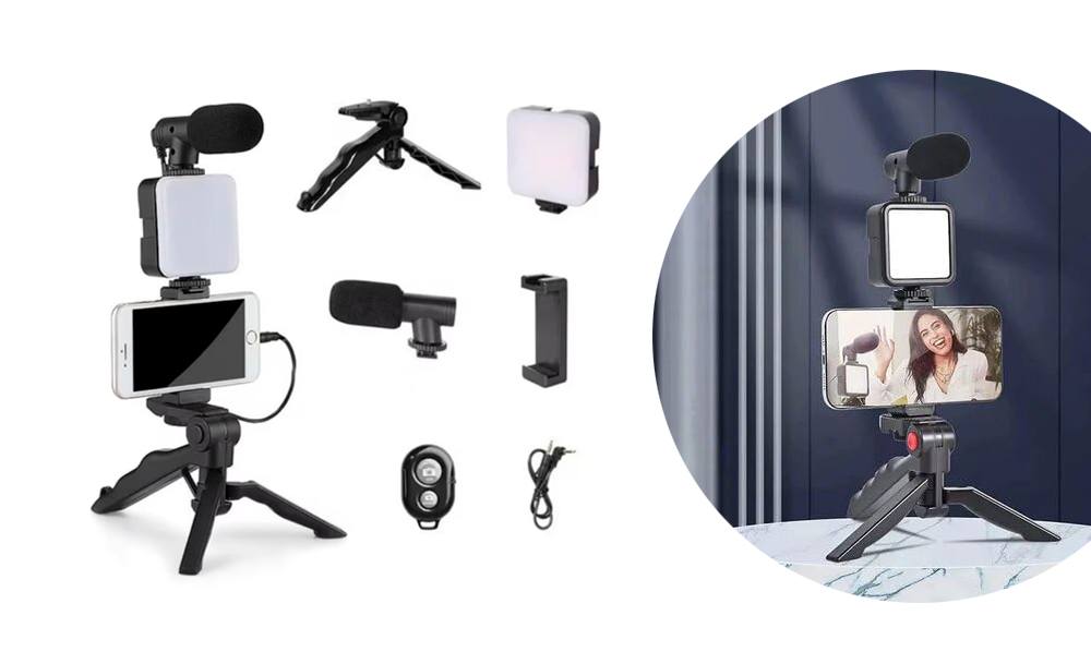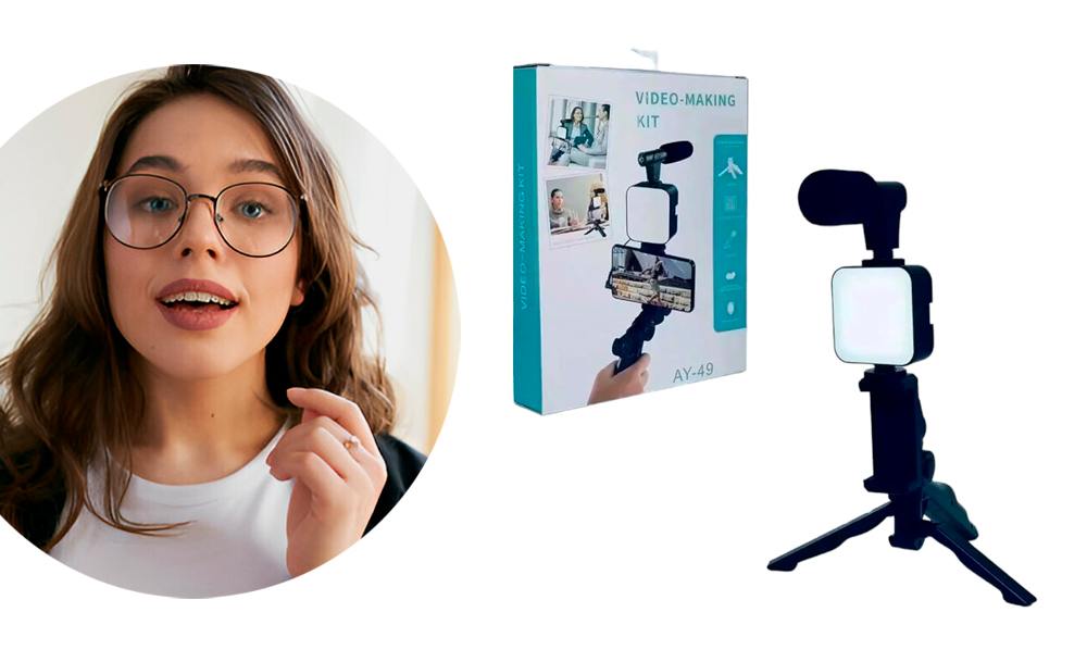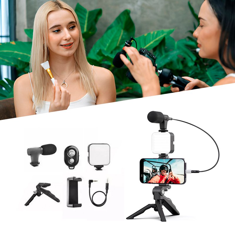Набір блогера 4 в 1: штатив-тренога, світло, мікрофон, пульт AY-49, чудовий комплект, що включає все необхідне для високоякісного відеозапису та фотозйомки з максимальним комфортом. Цей набір містить мікрофон, підсвічування, тринога, тримач для телефону і Bluetooth кнопка.