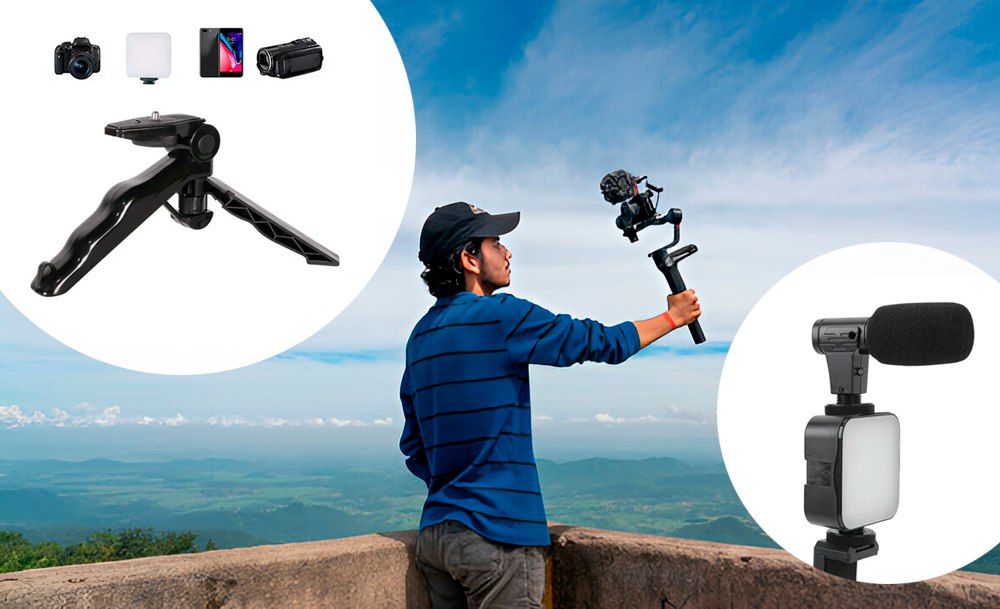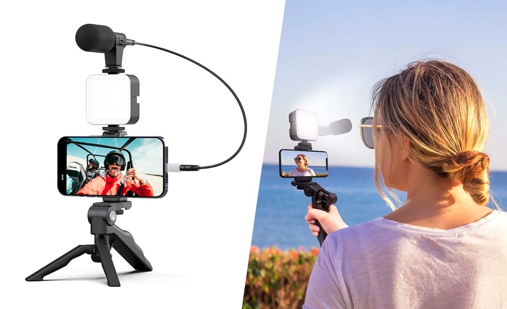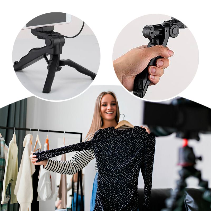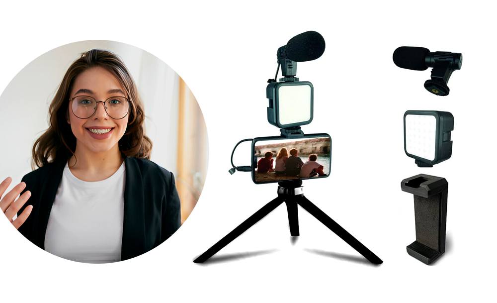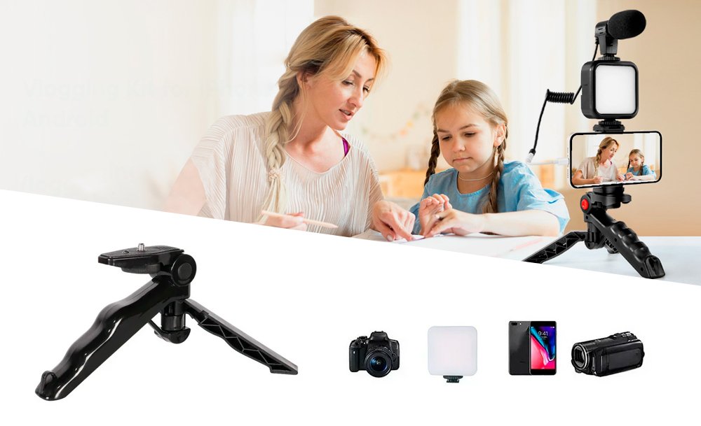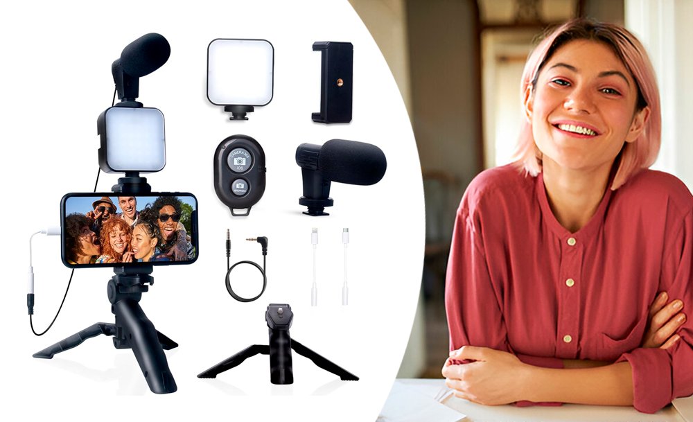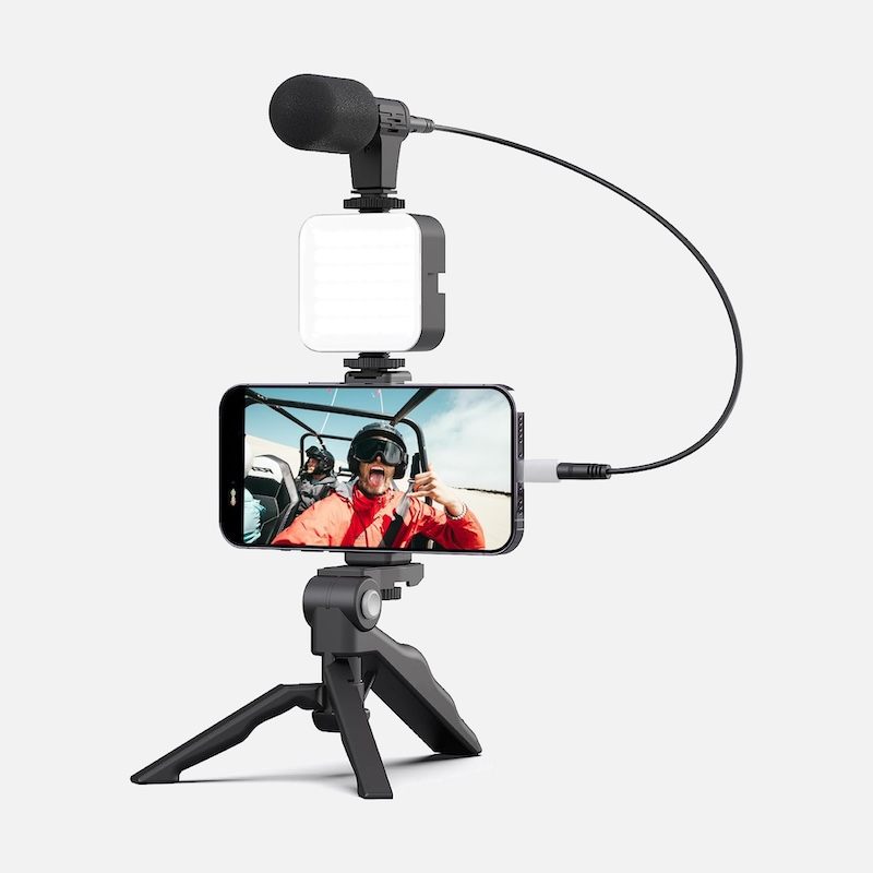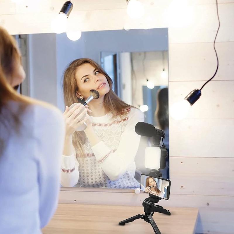 Набір блогера 4 в 1: штатив-тренога, світло, мікрофон, пульт AY-49, чудовий комплект, що включає все необхідне для високоякісного відеозапису та фотозйомки з максимальним комфортом. Цей набір містить мікрофон, підсвічування, тринога, тримач для телефону і Bluetooth кнопка.