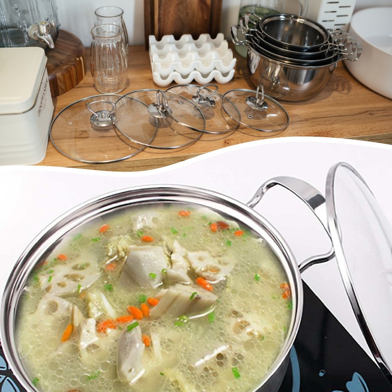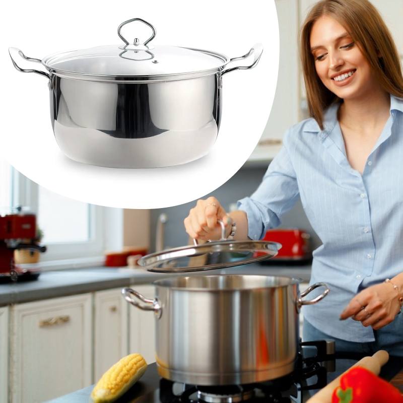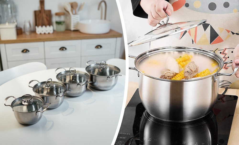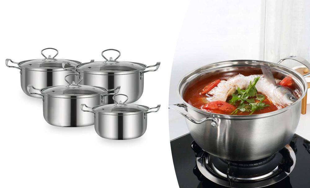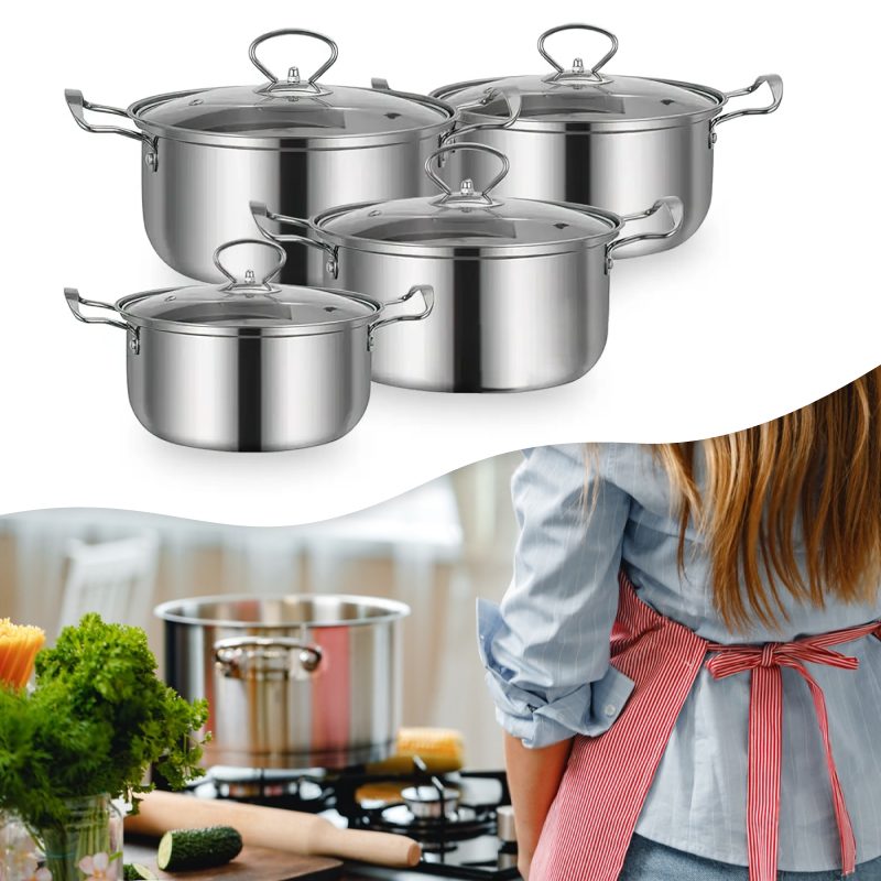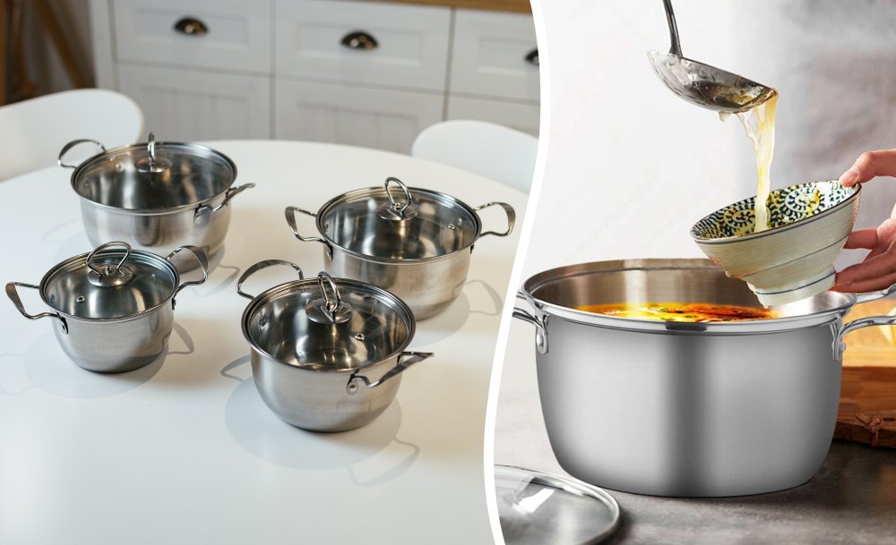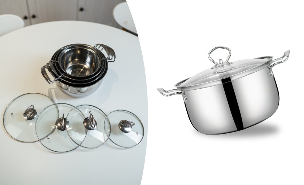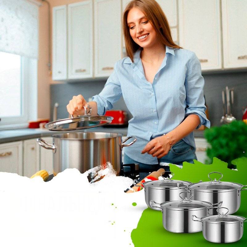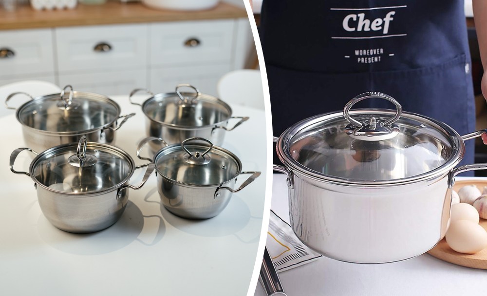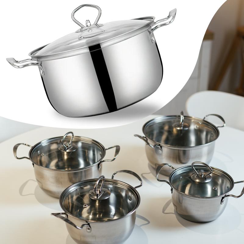 Набір каструль із нержавіючої сталі складається з 4-х каструль різного розміру та об’єму від 1,1 до 3,2 літра з кришками із прозорого термостійкого скла. Високоякісна харчова нержавіюча сталь, з якої він виготовлений, забезпечує рівномірне прогрівання продуктів під час їх приготування й тривале збереження тепла, а багатошарове дно – захист від пригорання.