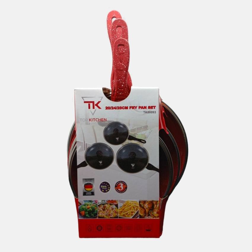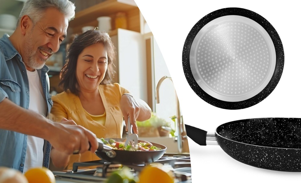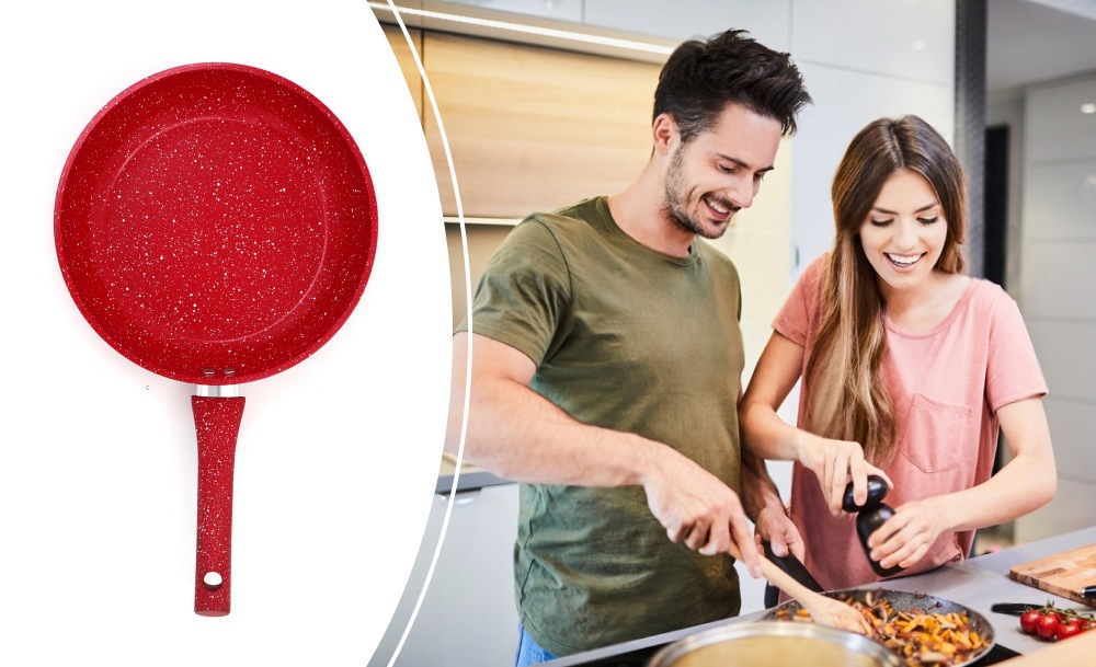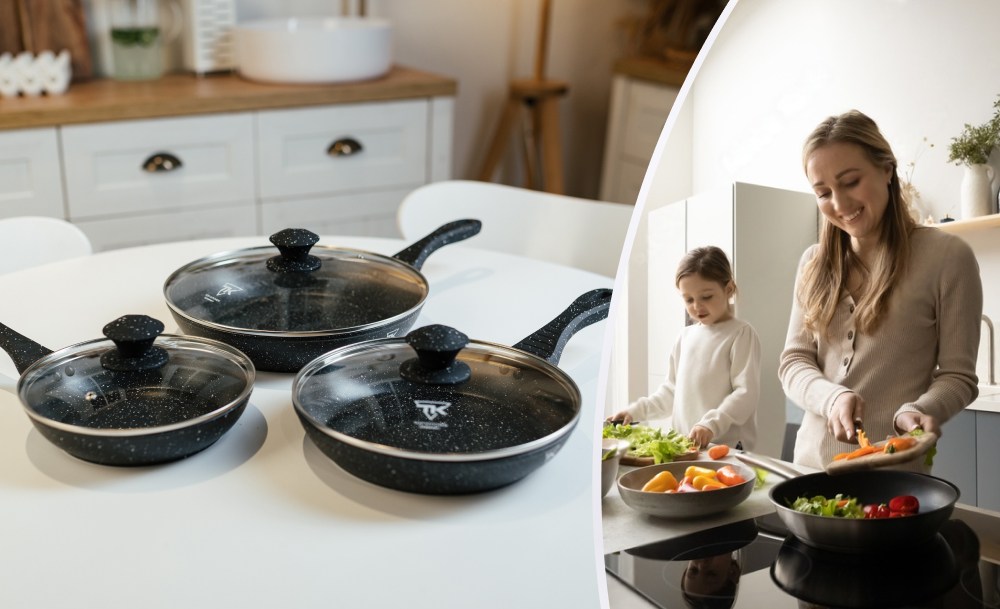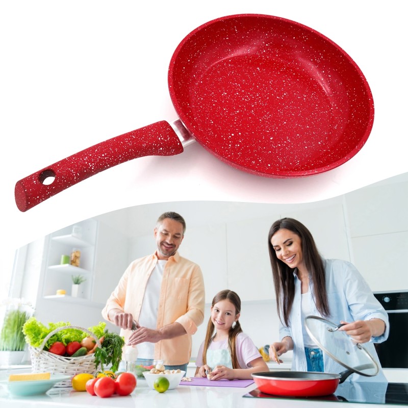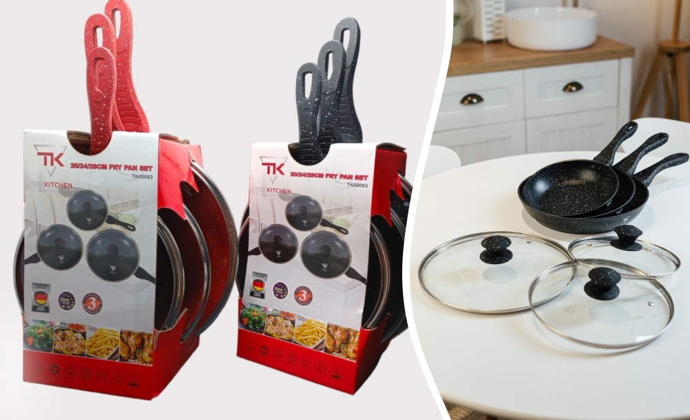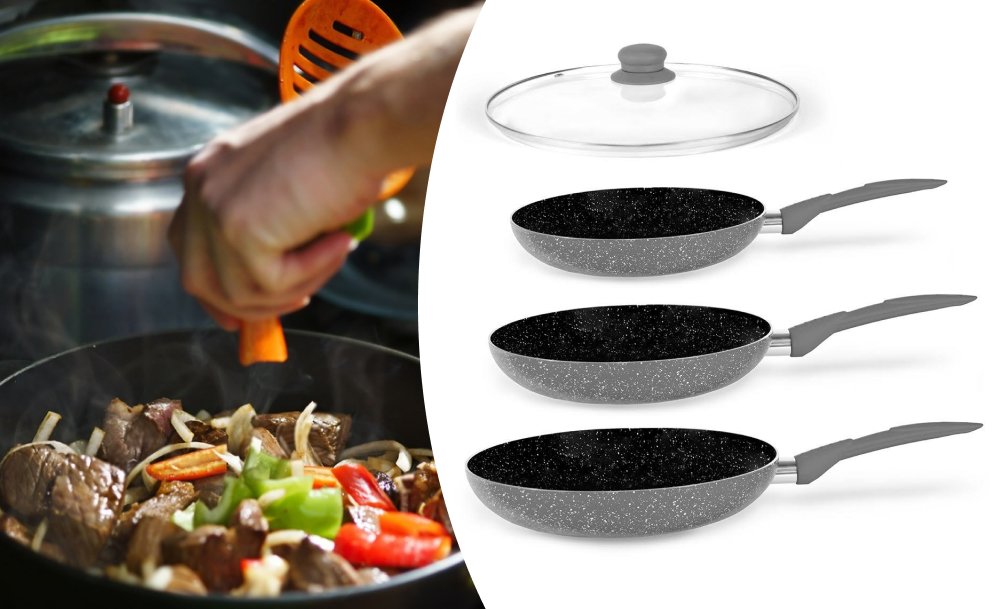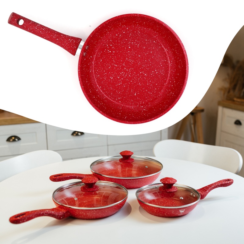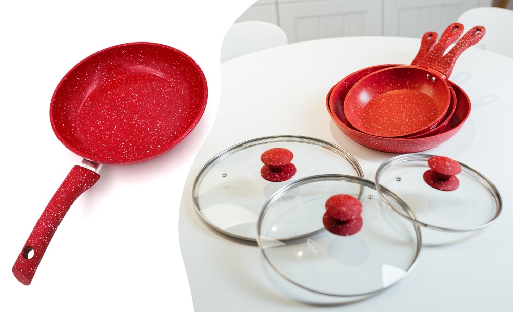 Набір сковорідок виготовлений з якісного штампованого алюмінію з антипригарним мармуровим покриттям: ці екологічно чисті матеріали безпечні для здоров’я, надійні та довговічні.