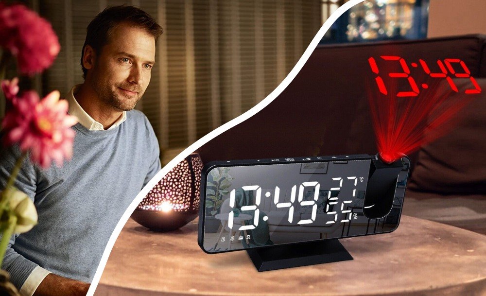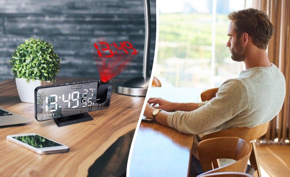 Настільний дзеркальний годинник з проектором часу – Електронний годинник з цікавим дзеркальним рішенням дисплея – це ефектний та необхідний елемент дизайну у вашому інтер’єрі. Світлодіодне підсвічування дозволить вам навіть у темну пору доби правильно зорієнтуватися в часі, а наполегливий дзвінок будильника приємно розбудить вас у потрібний час.