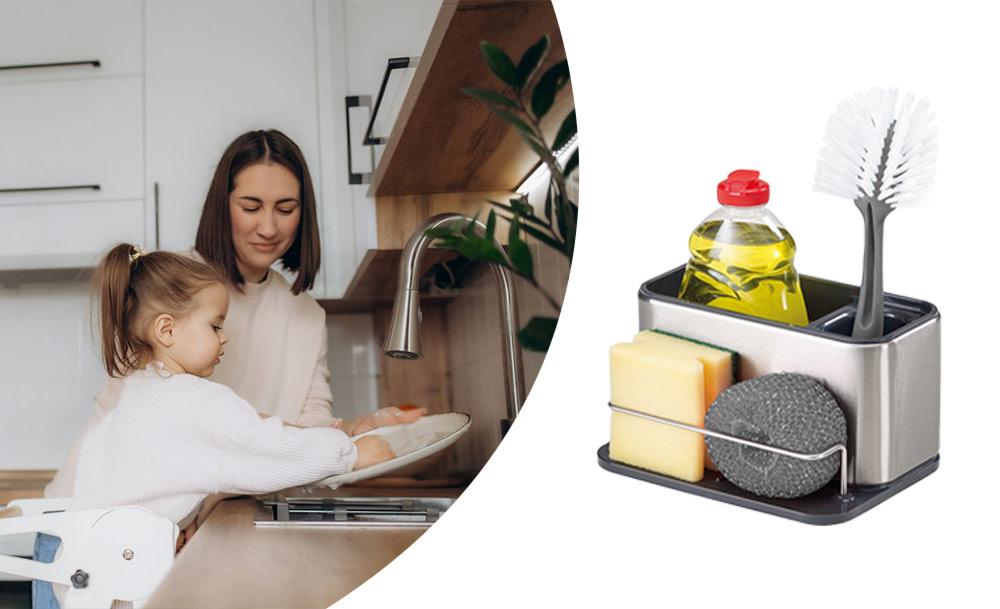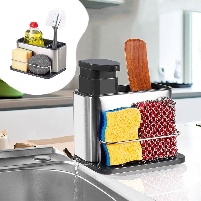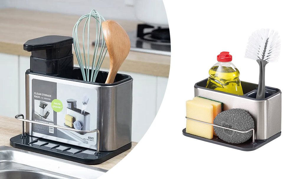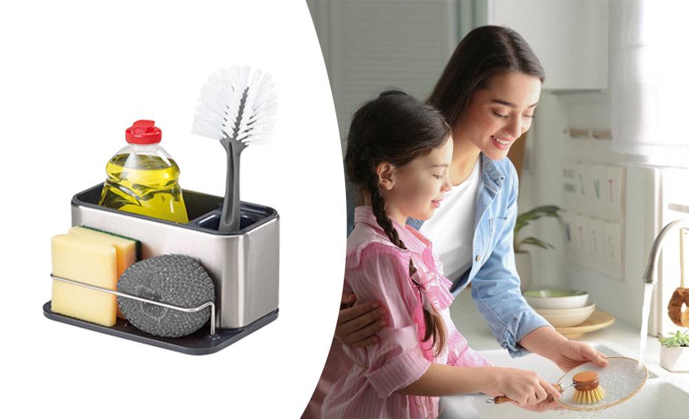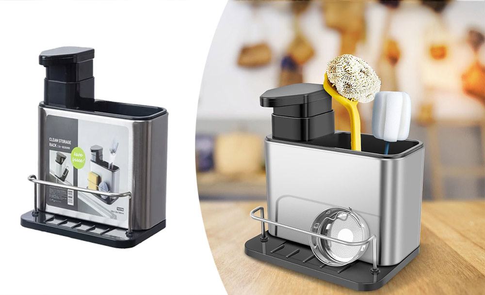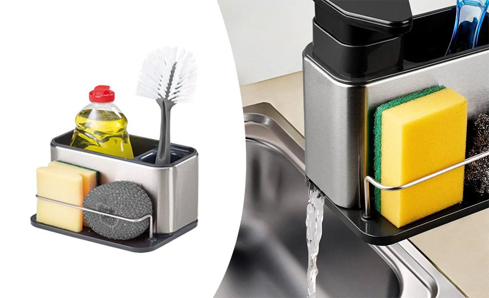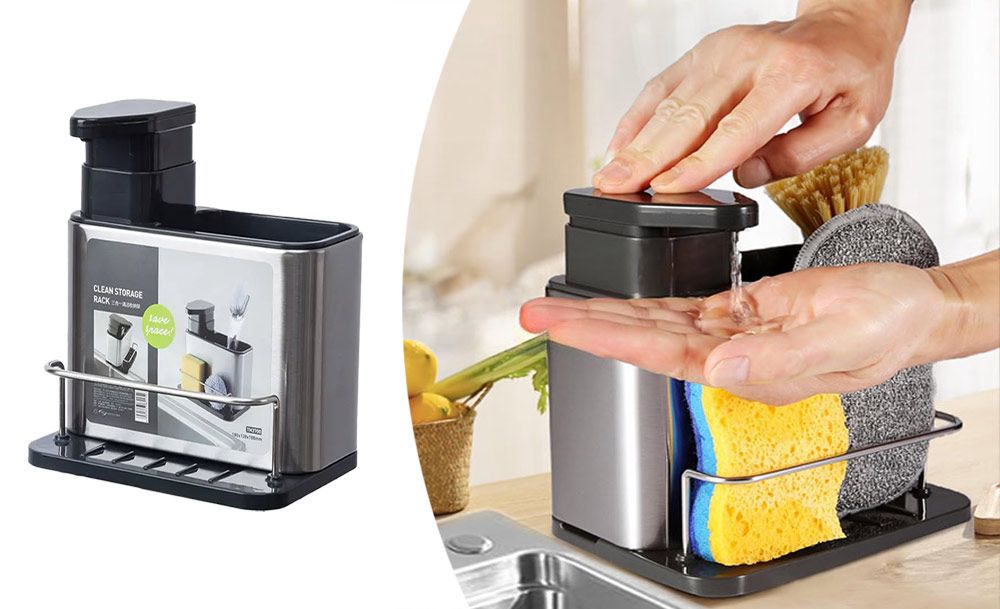 Практичний органайзер на кухню HB-19 із вбудованим диспенсером для миючого засобу забезпечує зручність та функціональність. Спеціальний тримач для губок з дозатором рідкого мила та миючого засобу робить процес миття посуду ще ефективнішим.