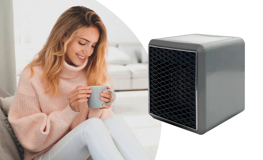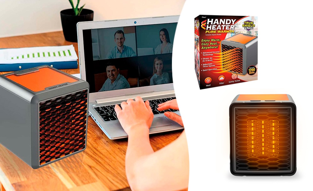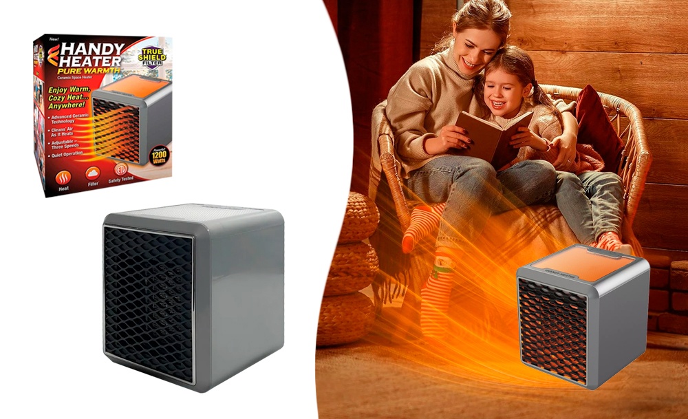 Обігрівач Handy Heater Pure Warmth – це керамічний портативний обігрівач для особистого простору у вітальні, кабінеті, дитячій чи офісній кімнаті. Він має знижений шум роботи, кілька режимів нагрівання, вбудоване підсвічування та знімний фільтр, що зменшує кількість частинок пилу та алергенів у повітрі. Нова технологія обігріву повітря, що надходить, утримує в ньому вологу, запобігаючи сухості, що благотворно впливає на стан людини, зменшує свербіж і подразнення шкіри.