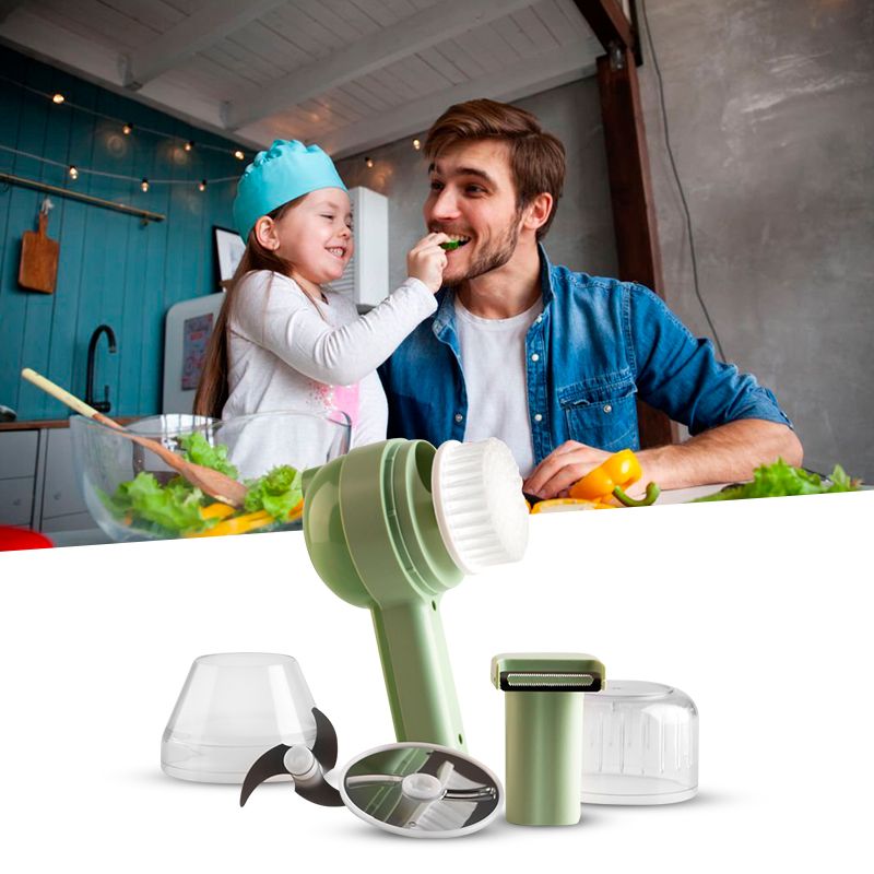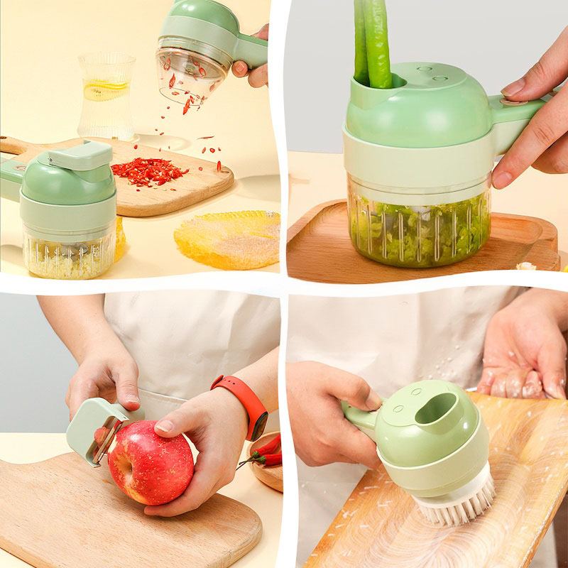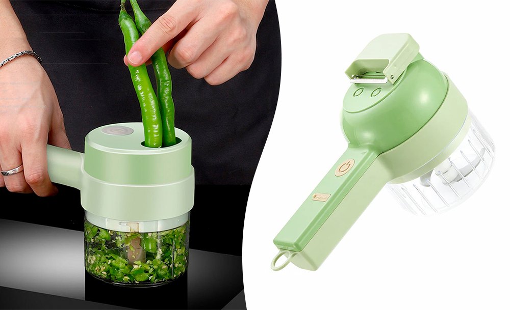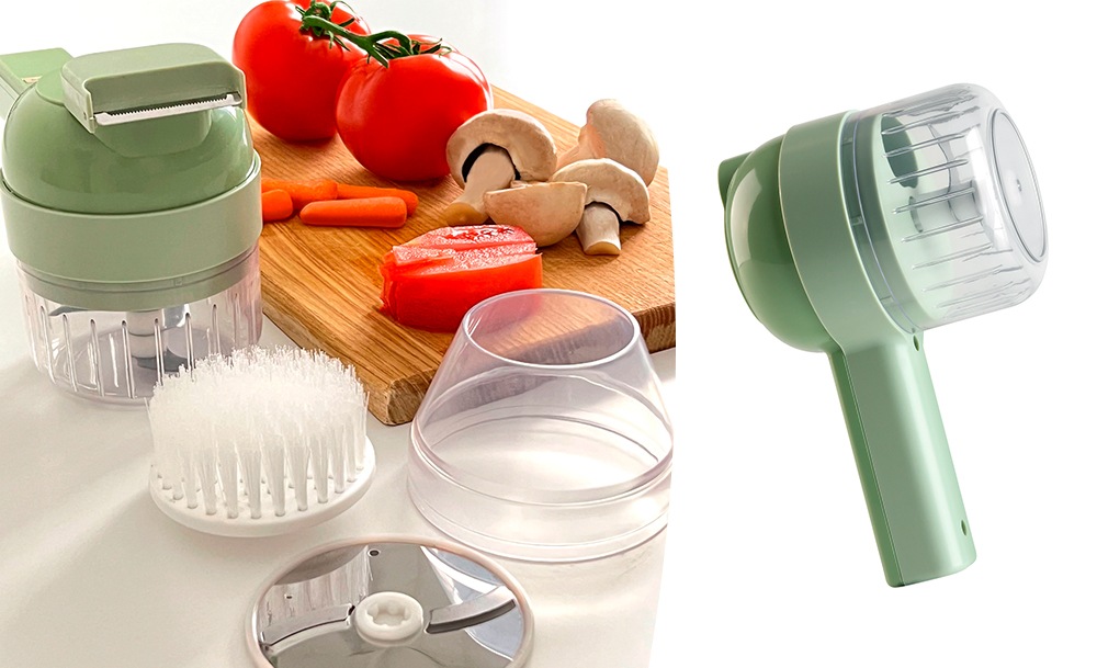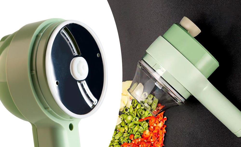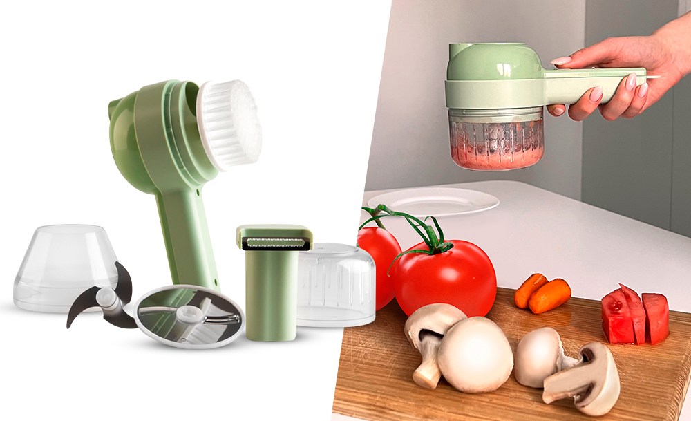 Універсальний та компактний портативний кухонний прилад 4 в 1 дозволить вам швидко та легко нарізати овочі та зелень, подрібнити м’ясо та фрукти, а також очистити дощечку від залишків продуктів. Більше не потрібно купувати багато ножів та м’ясорубок, адже всі необхідні функції є в універсальному міні блендері. Крім того, всі насадки легко миються водою, що заощаджує час та сили під час прибирання. Чоппер ідеально впишеться у вашу кухню і перетворить кожну страву на справжній витвір мистецтва.