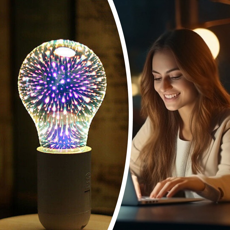 Спеціальне багатошарове нанесення всередині скляної колби при включенні лампи створює дивовижний ефект яскравого кольорового феєрверка. Вбудований контролер плавно змінює кольори, а відсутність мерехтіння та інфрачервоного випромінювання не подразнює зір. Світлодіодна лампа економічна та довговічна.