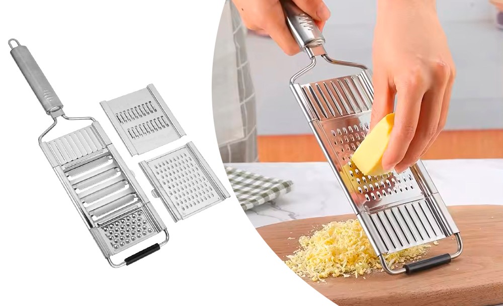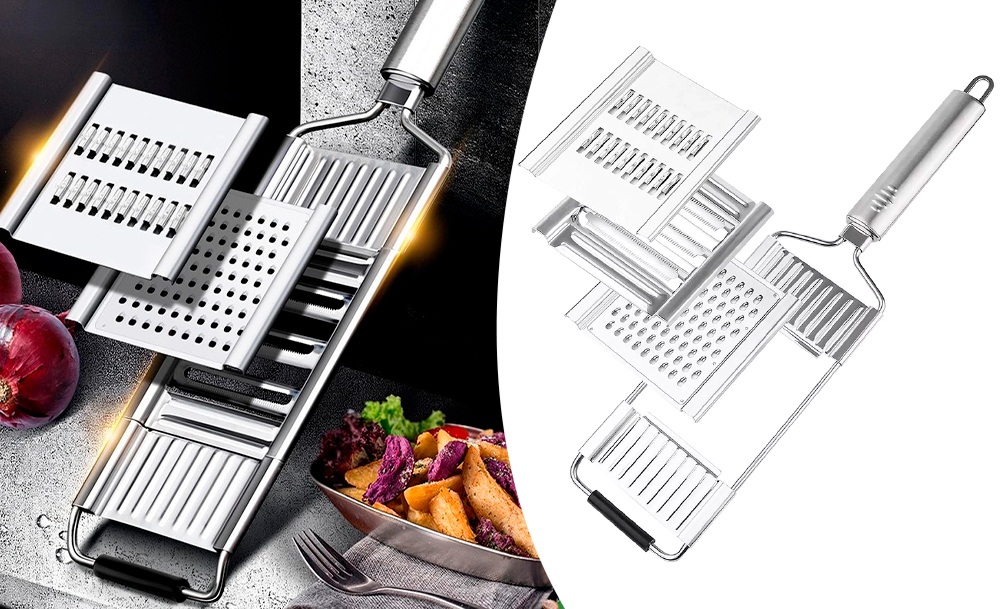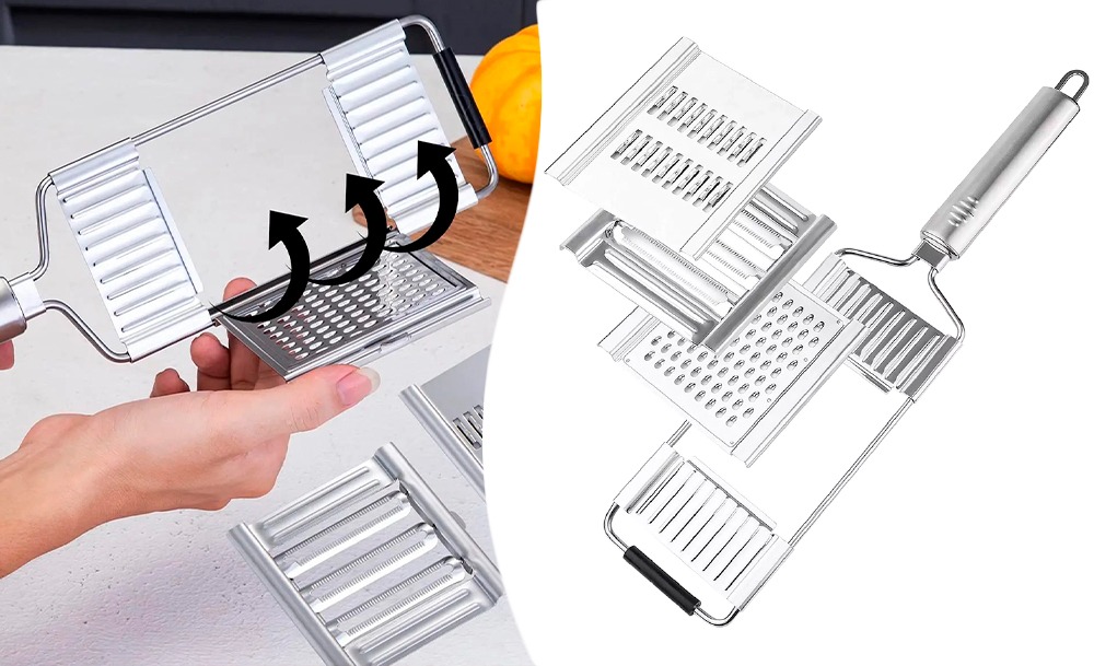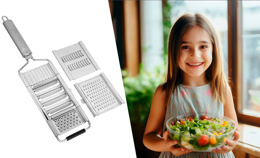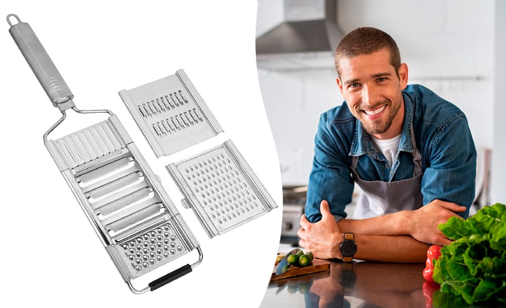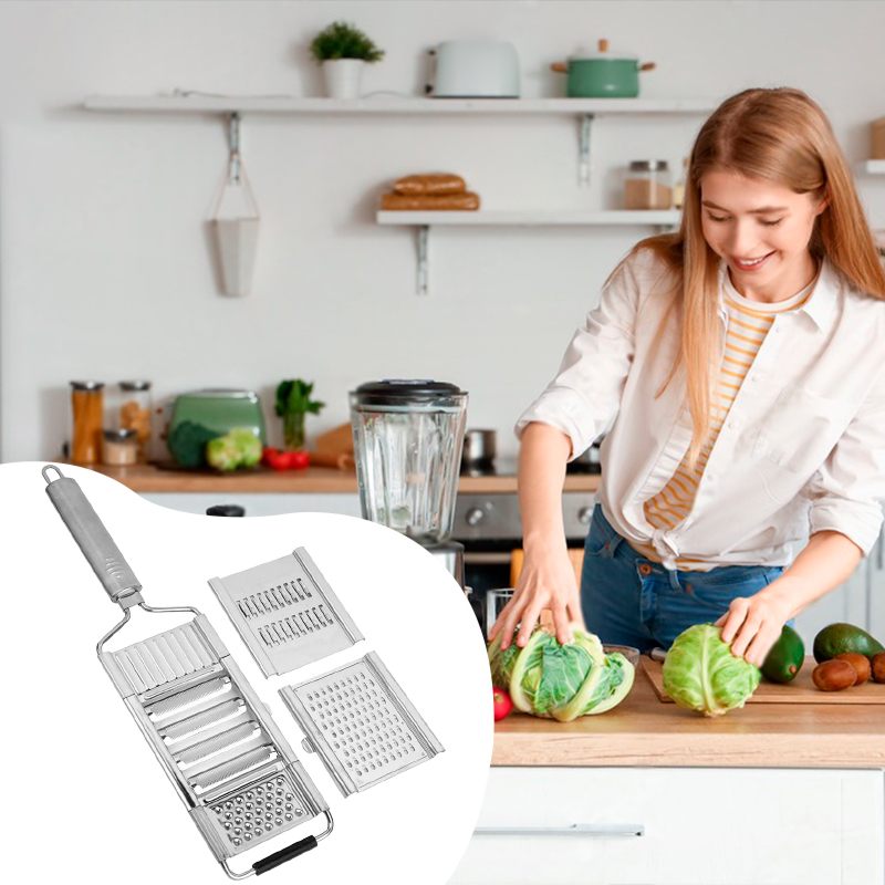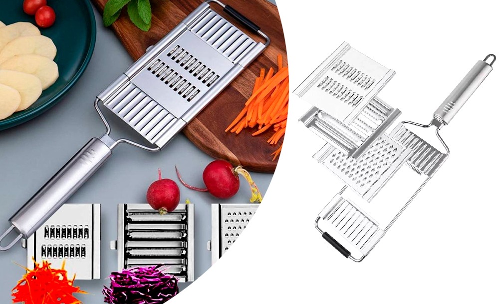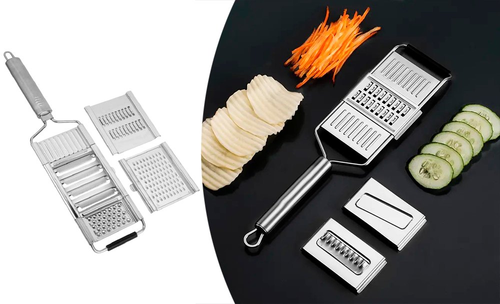 Має 3 робочі насадки з різними поверхнями: дрібними, середніми, великими отворами та ножем для шаткування. Поверхня з дрібними отворами стане в пригоді для натирання картоплі або цедри.