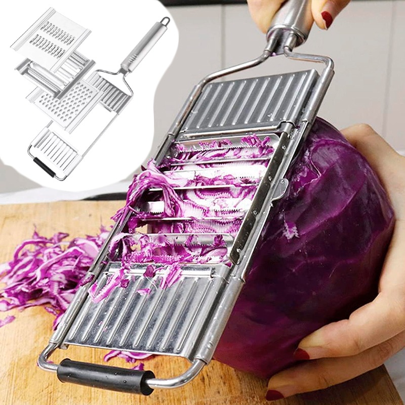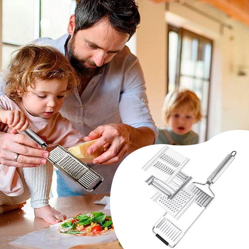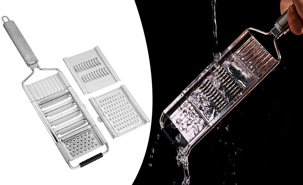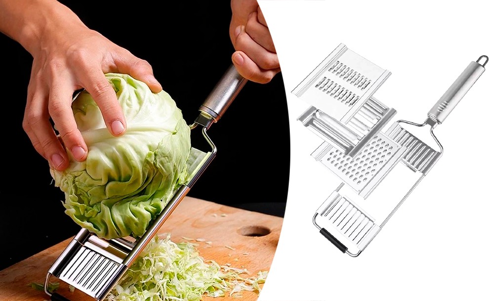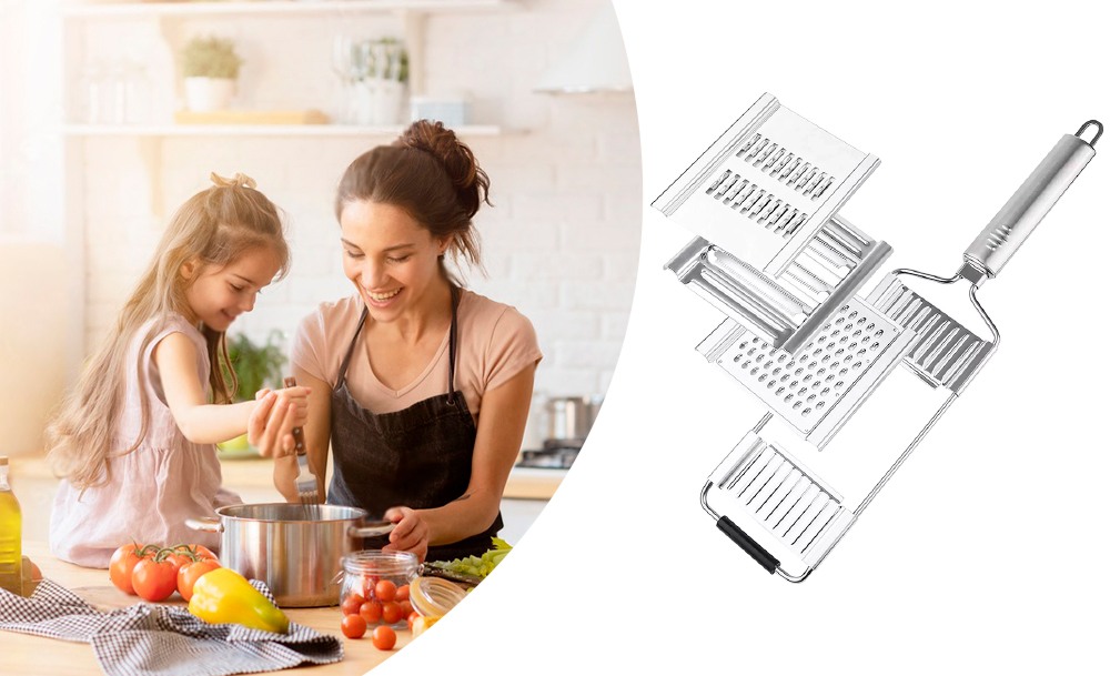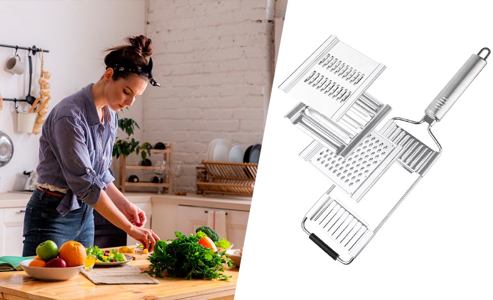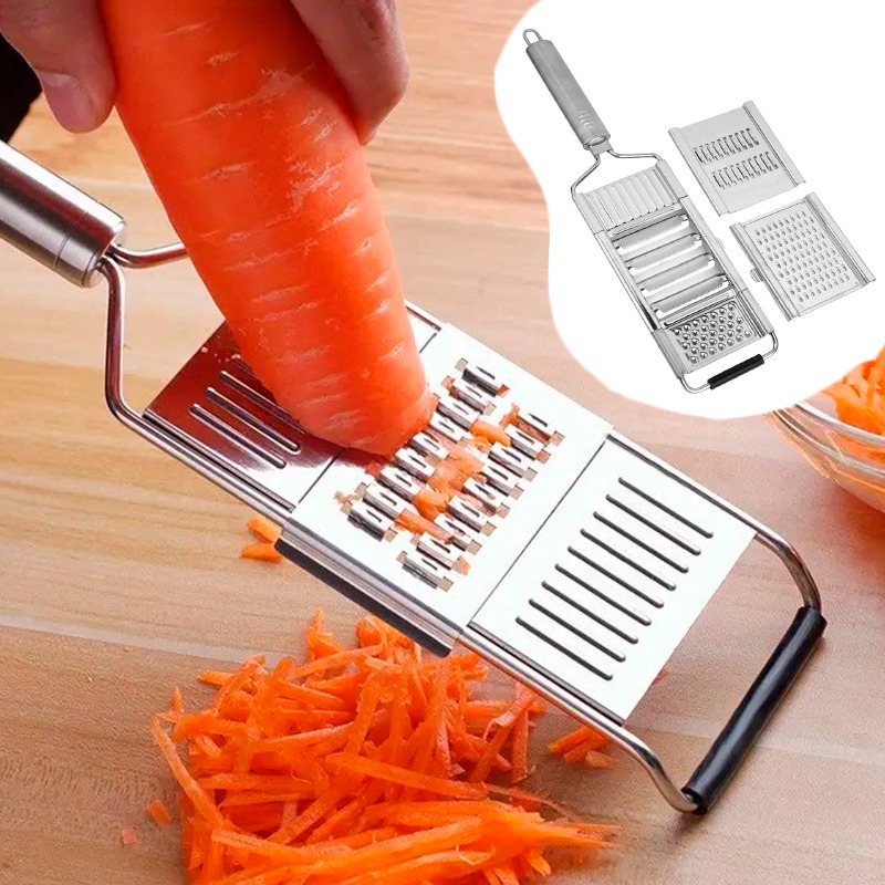 Має 3 робочі насадки з різними поверхнями: дрібними, середніми, великими отворами та ножем для шаткування. Поверхня з дрібними отворами стане в пригоді для натирання картоплі або цедри.