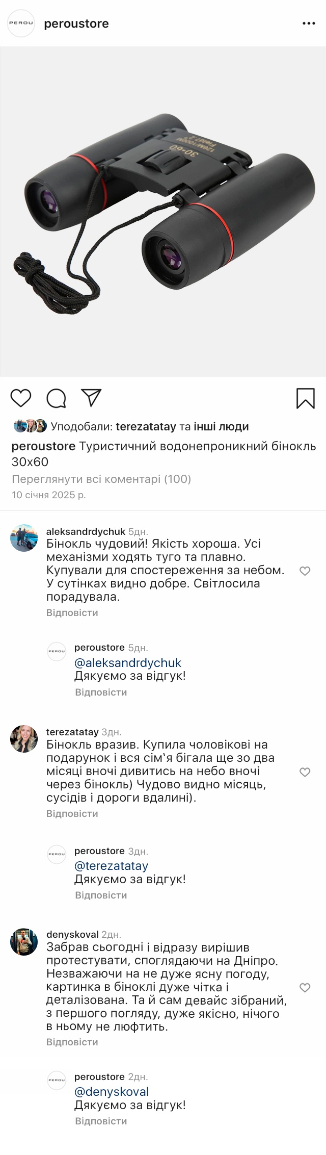 Корпус виготовлений з міцного пластику і прогумований для зручного хвату. У комплекті поставляється нейлоновий чохол для зручного транспортування та ремінець для бінокля. Завдяки якісній оптиці можна вистежити звіра, визначити активність рибного місця, перевірити місцевість на наявність змін.